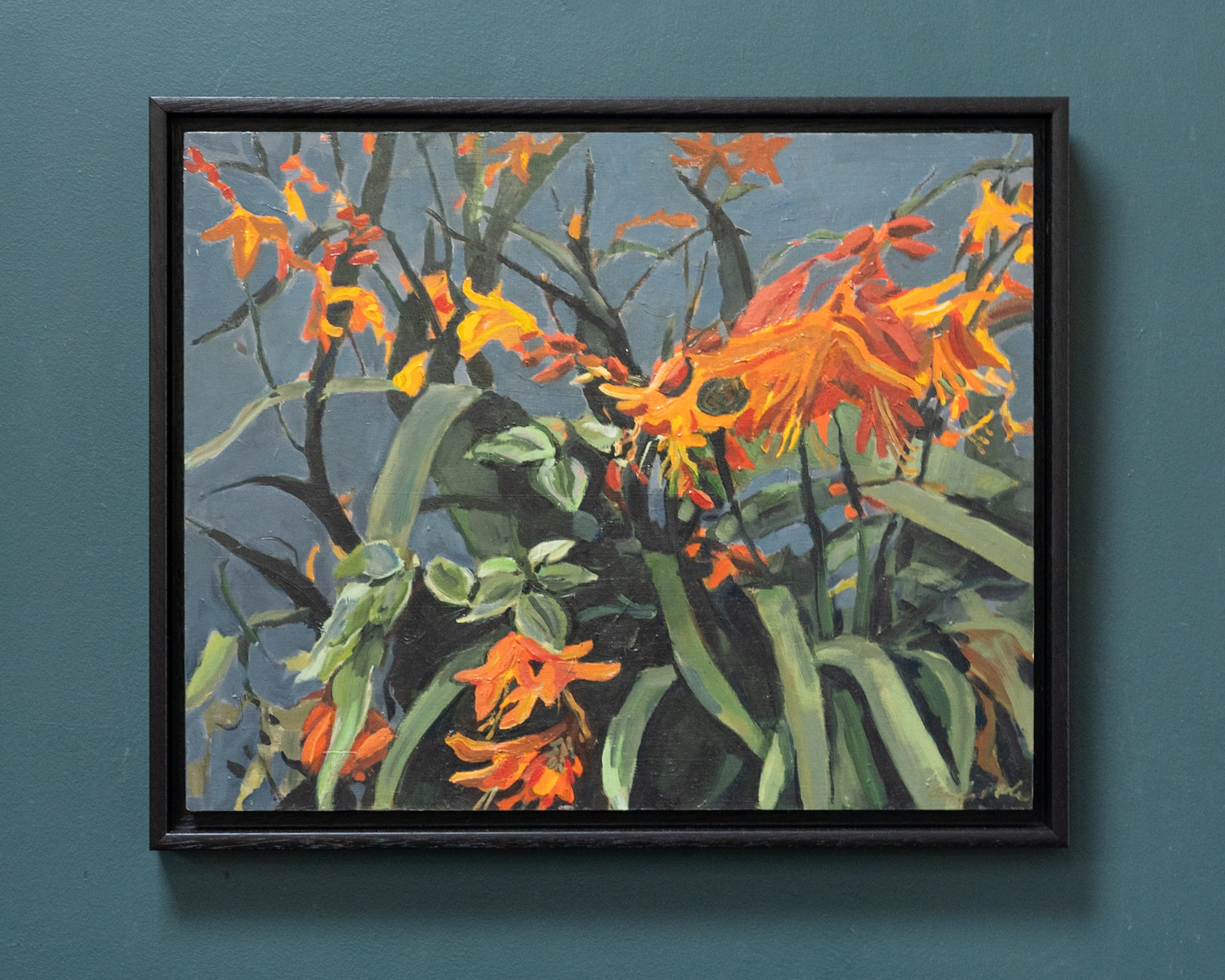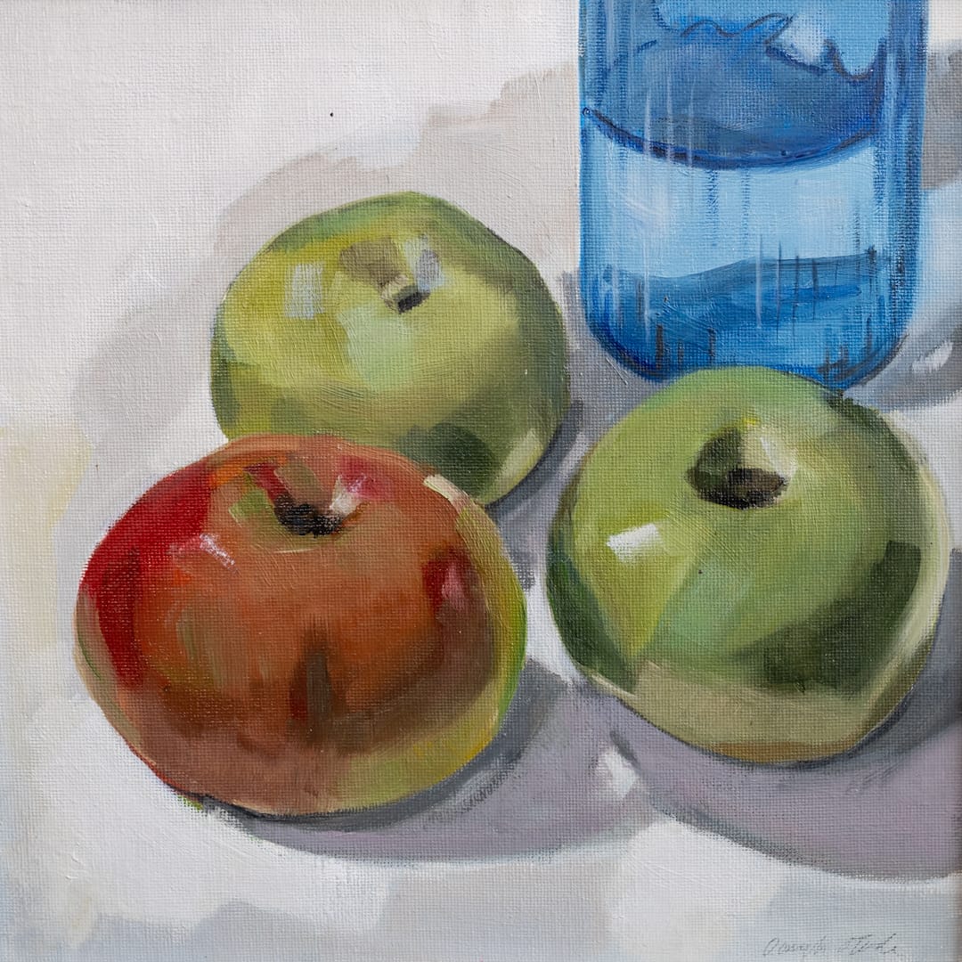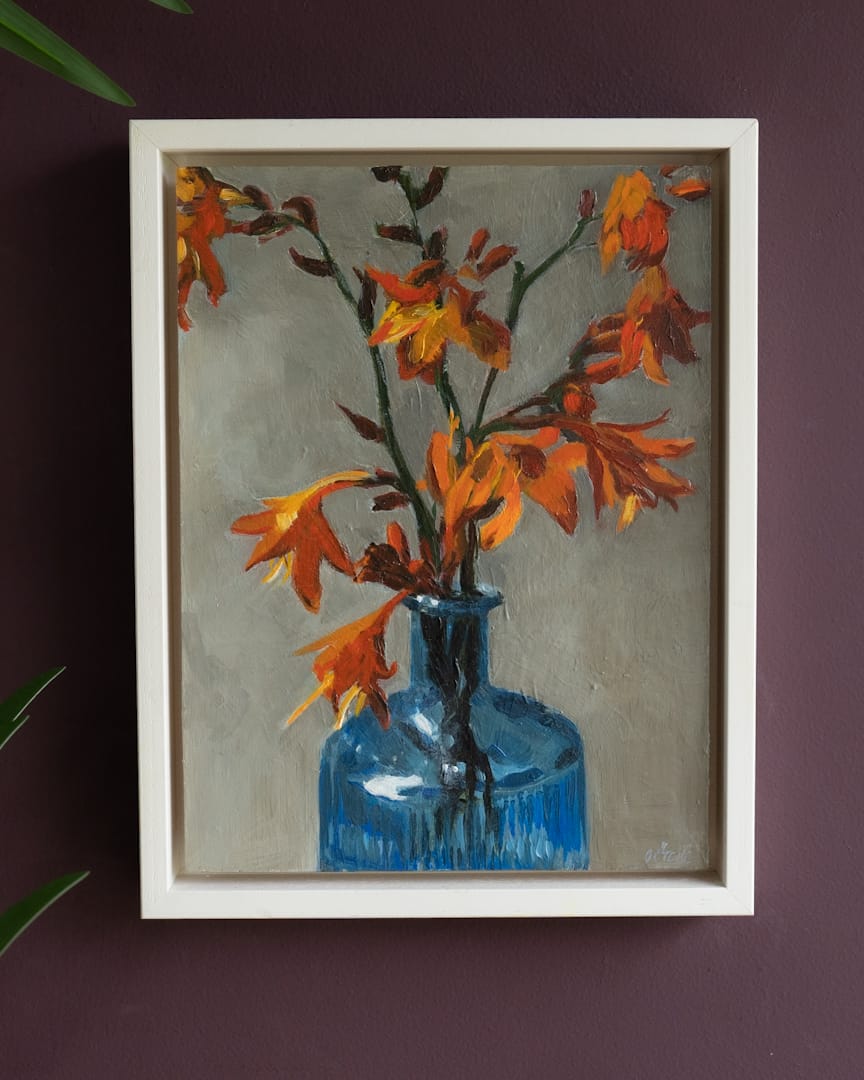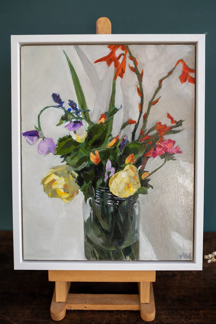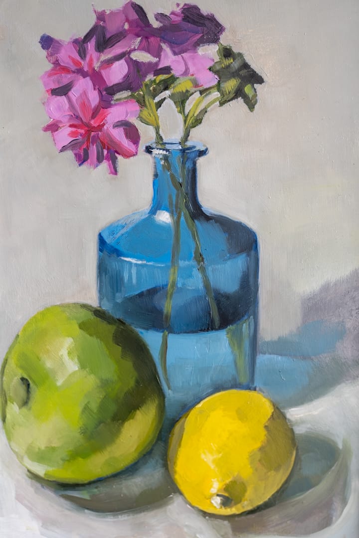 Oonagh says “I love paint, colours, tones and noticing the beauty and drama in the details of ordinary scenes and objects. Through still lifes, portraiture and cityscapes I look at the colours and light of the everyday- shadows cast by a chimney when the sun is bright after a rain shower, the light falling on an apple reflected in a stainless steel teapot or the transient bloom of a summer flower”.