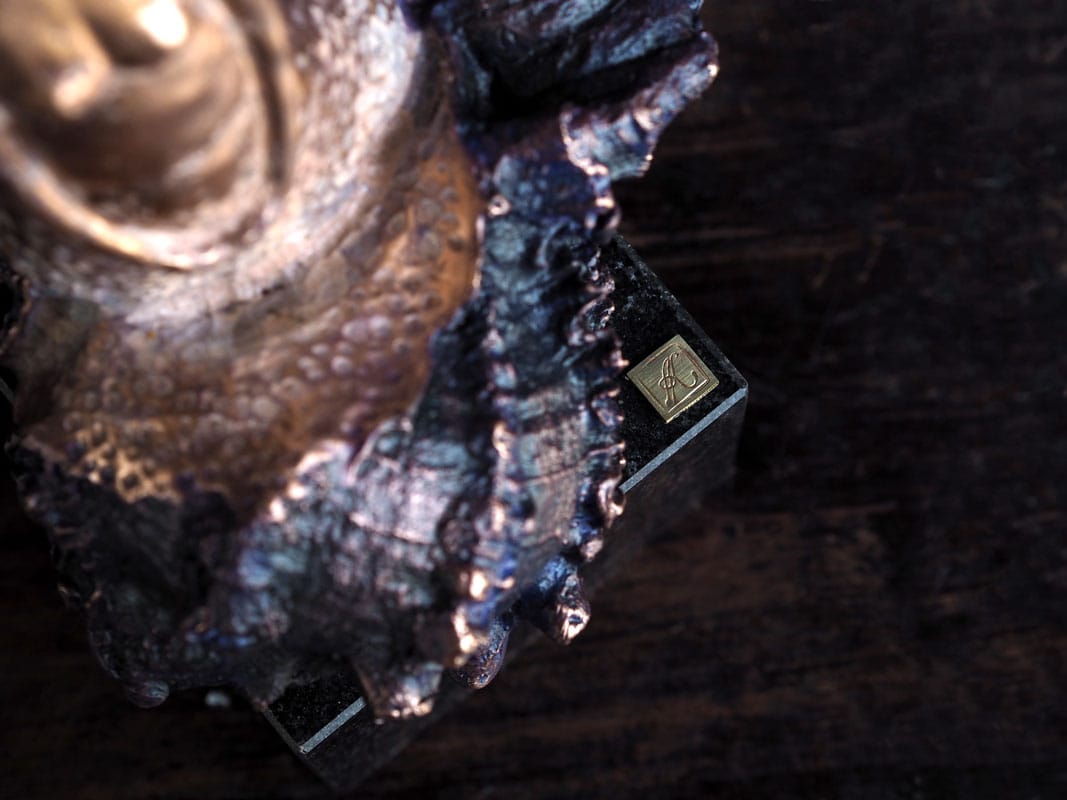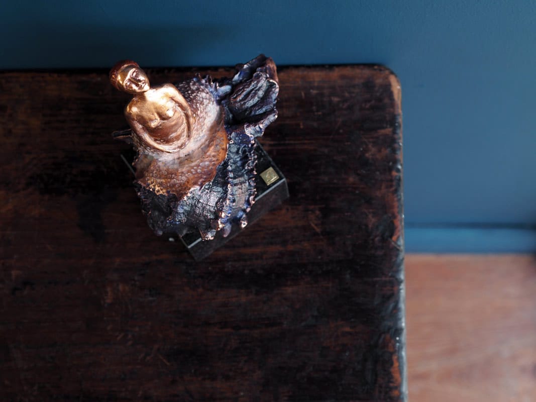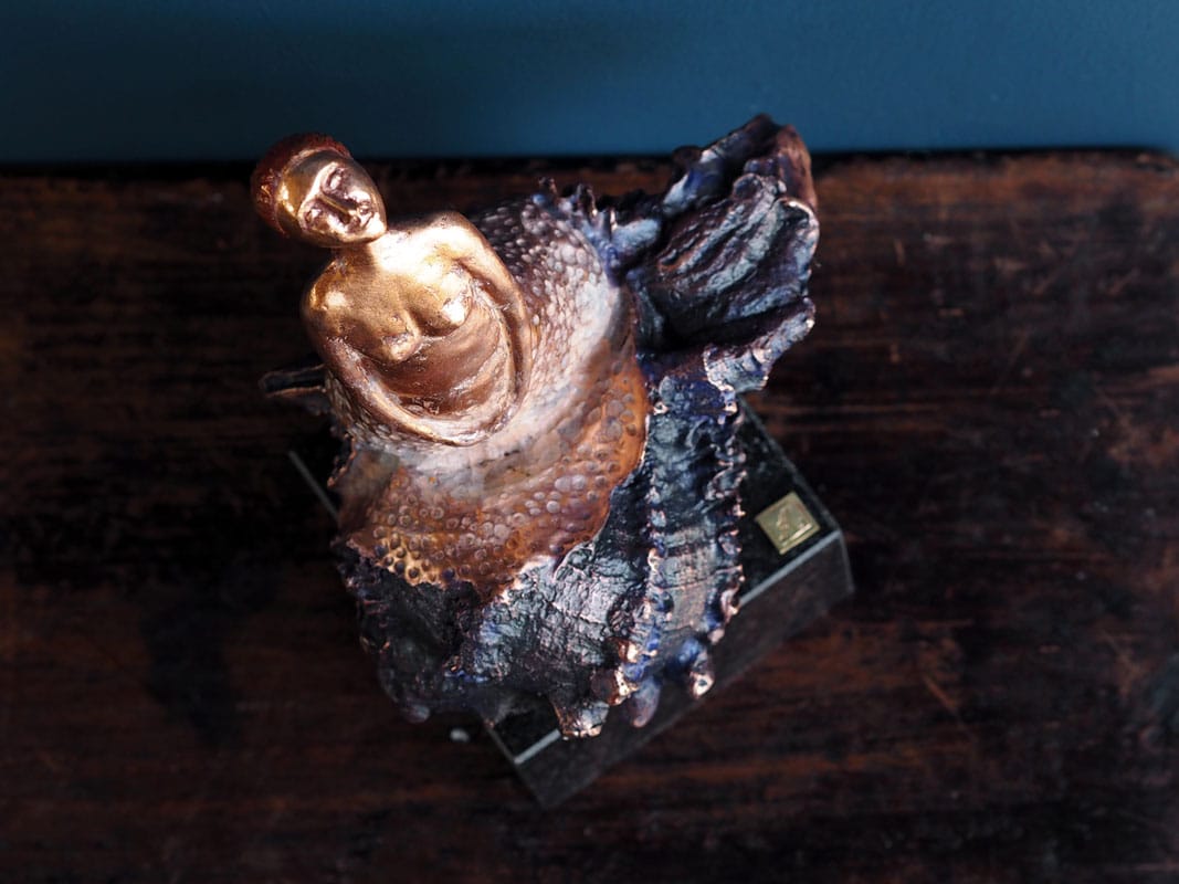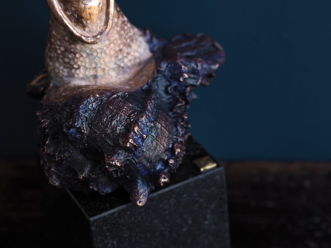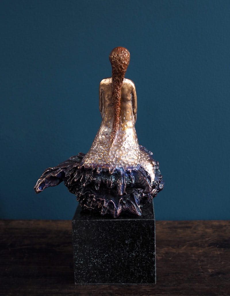 Whatever the thought process was, we simply adore it. Apart from being really interesting to look at, from the detail on the shell to the colours used in the patination, this piece is also really tactile and in fact you find yourself regularly drawn to touching it. It also has a somewhat optimistic feel to it, as the female figure stares lovingly toward the sky; perhaps gazing at the stars or maybe heralding the sun, but either way, admiring mother natures masterpiece. Another truly engaging artwork by the Lithuanian born but Irish resident artist, Arturas Karabanovas. Be sure to go through all the accompanying imagery here to get a real sense of this beautiful sculpture.