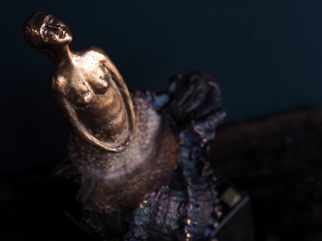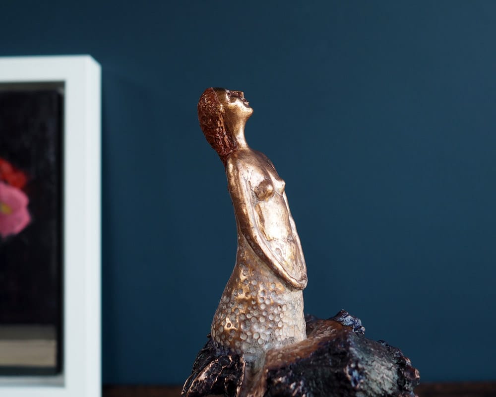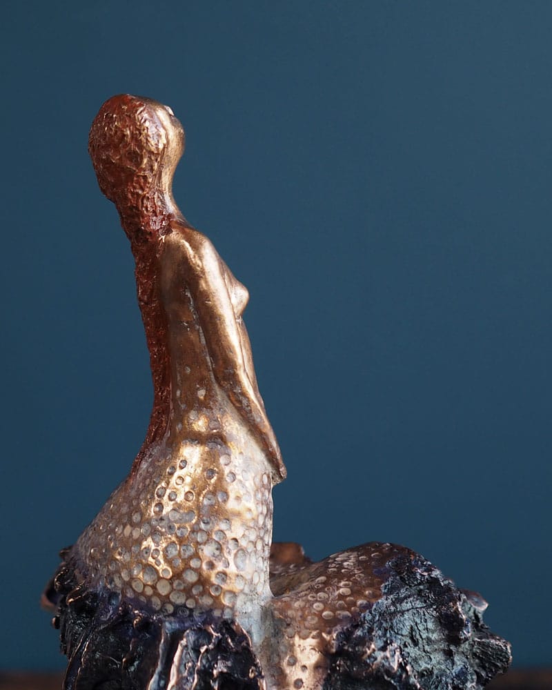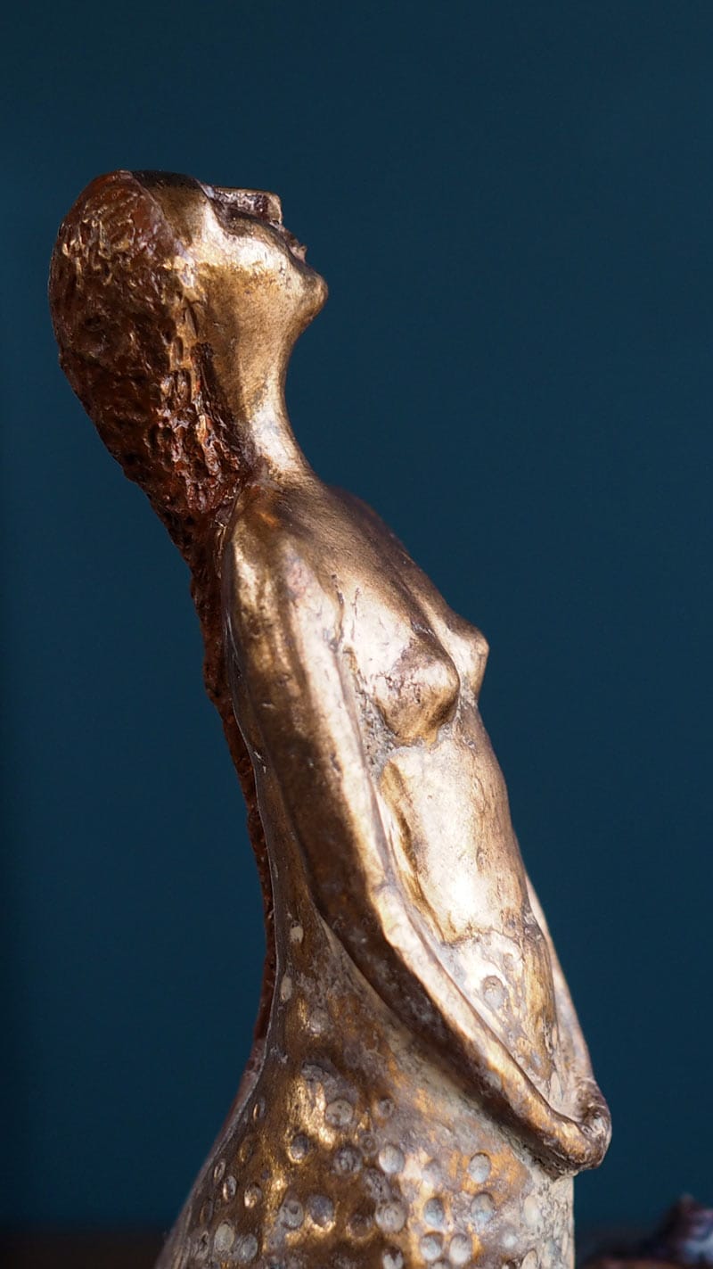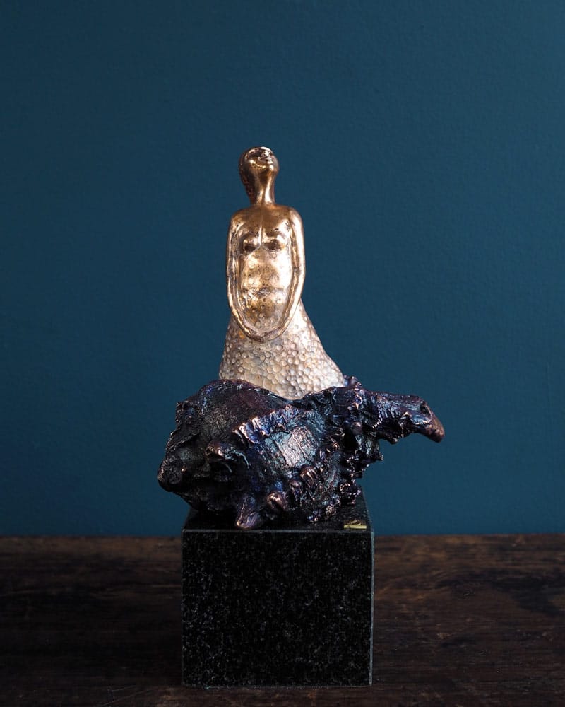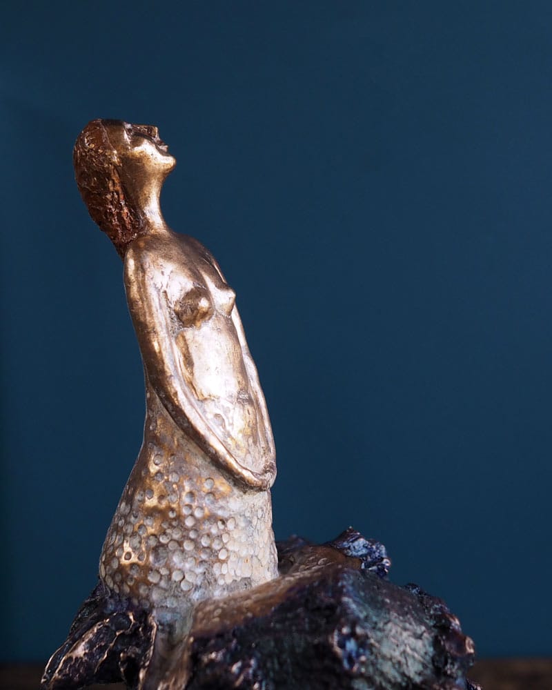 There is the obvious resemblance here to the famous Botticelli painting, Birth of Venus, where the goddess Venus makes her way to shore having emerged, fully grown, from a clam shell. This particular bronze figure is of a female actually forming a part of and merging with a large sea shell. Perhaps similarly, both pieces are looking at the ‘humanising’ of legends, myths and even feelings etc. Maybe this piece by Arturas is humanising the close relationship between people and the sea? The fact that the sea has forever been such a rich source of food and life and inspiration for humans?