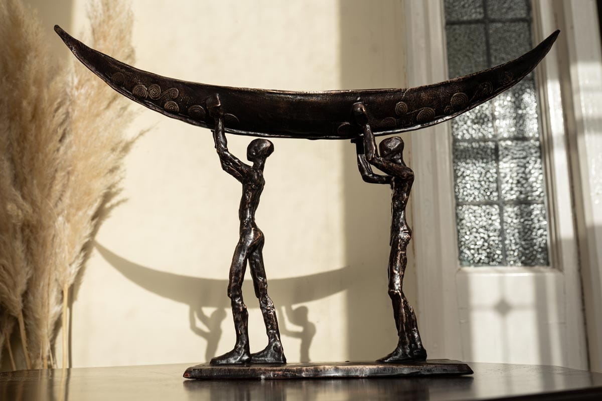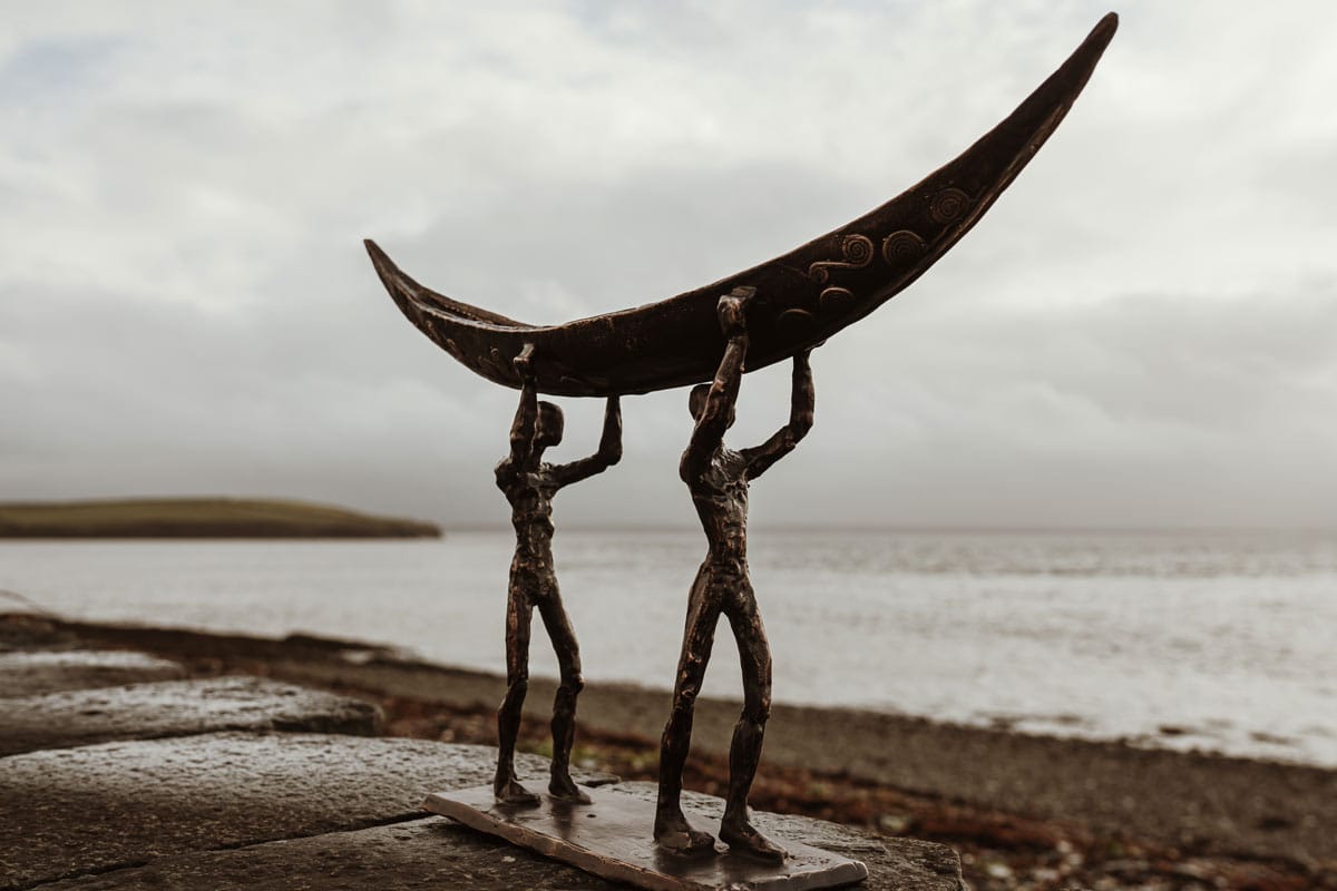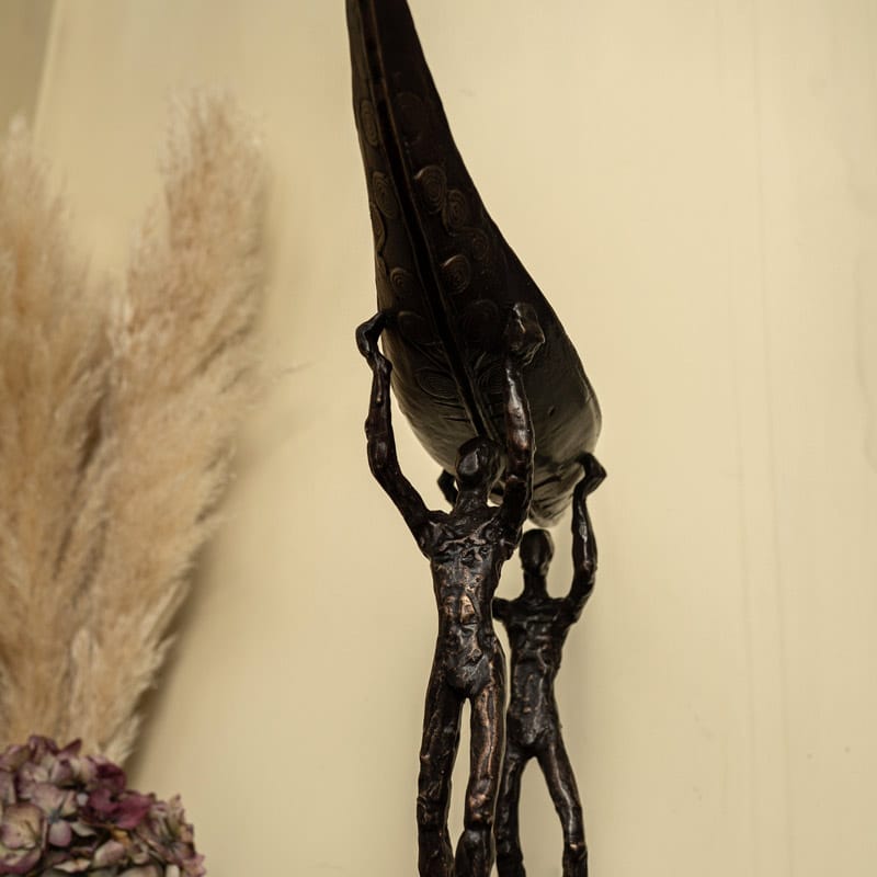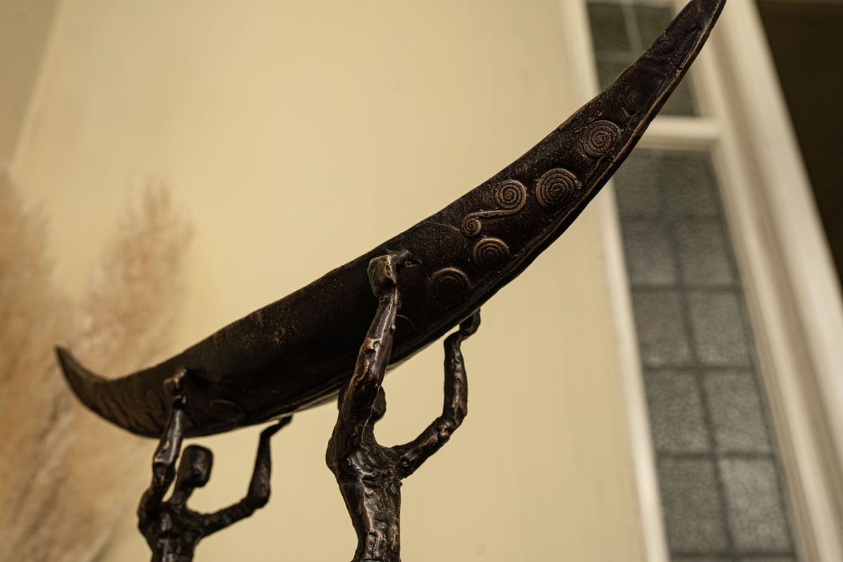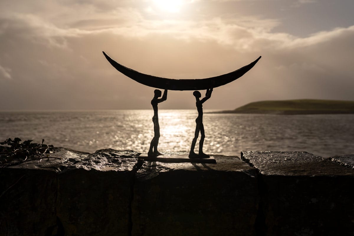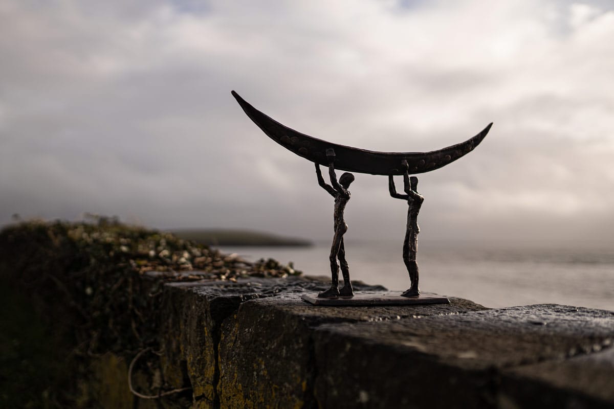 The symbol of the currach is a fabulous one; signifying strength, resilience, fortitude, and ruggedness. The people who lived by the sea also lived largely from the sea. They would fish in all weathers, using the currach to bring home the catch to their families. Sturdy and light, the currach is now often used in sea racing or currach racing. Clodagh Redden, a Limerick-born sculptress who began by working primarily in ceramic, now casts much of her work in bronze; adding to their impressive nature. Her signature piece has become the currach, or sculptures surrounding that theme. Whether in ceramic or bronze, her sculptures, particularly the boats, are always individually crafted and unique. This beautiful bronze piece depicts a male and a female form carrying their currach to the shore.