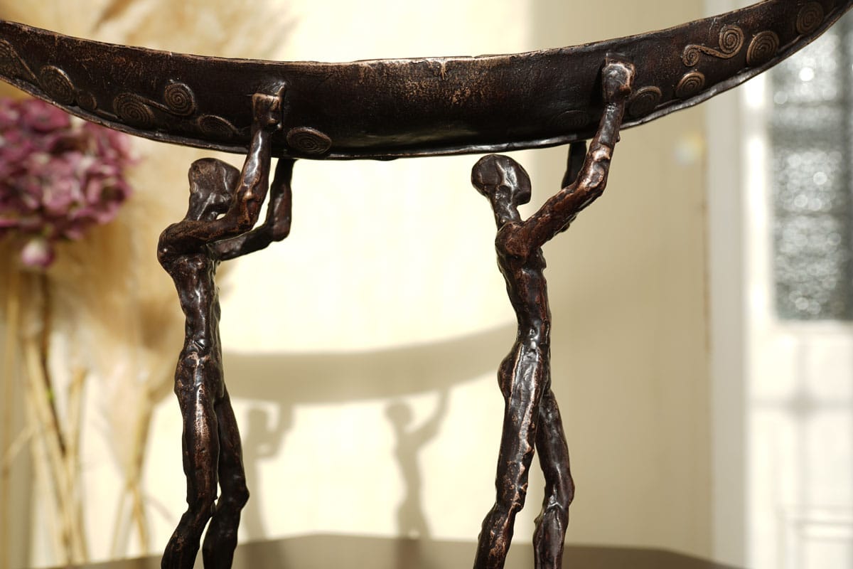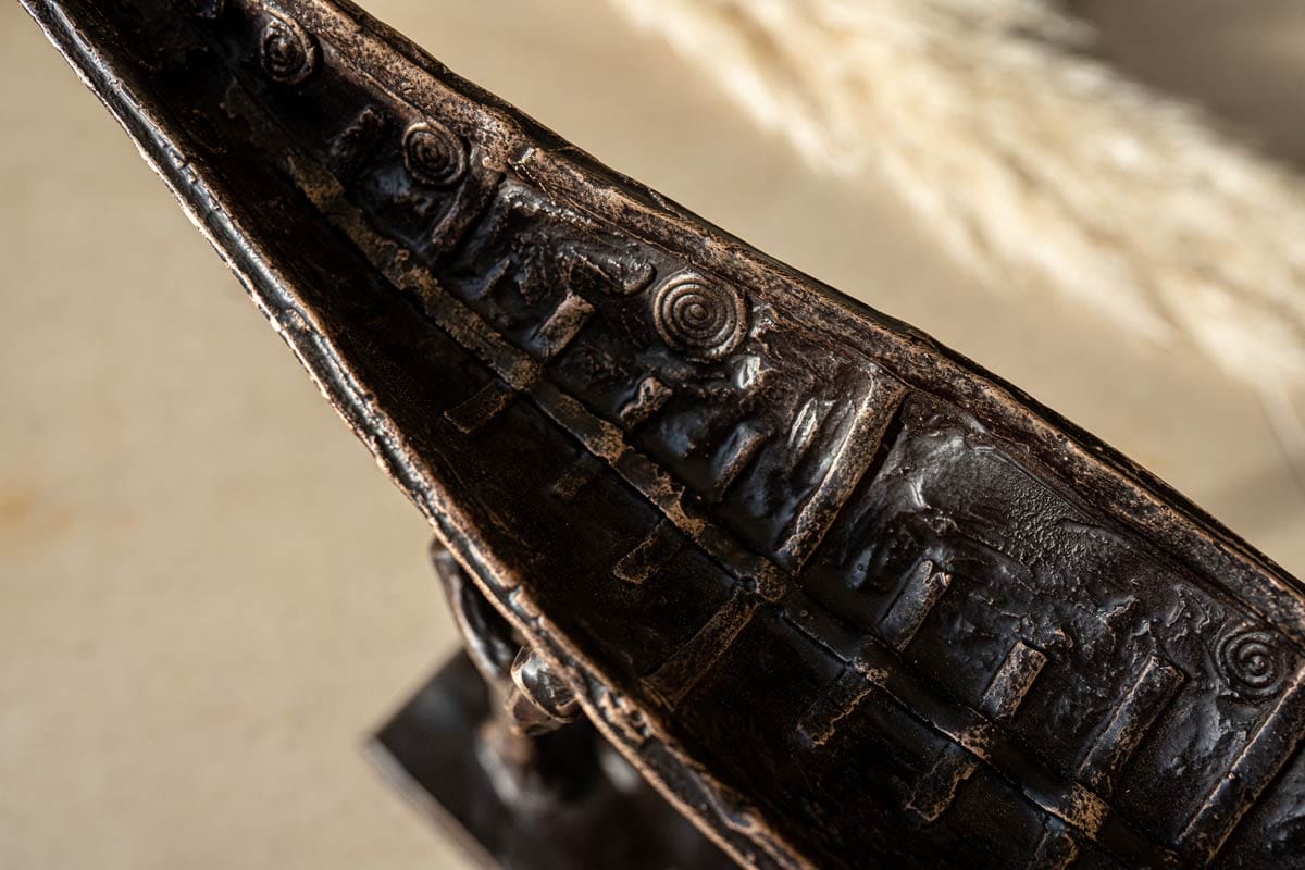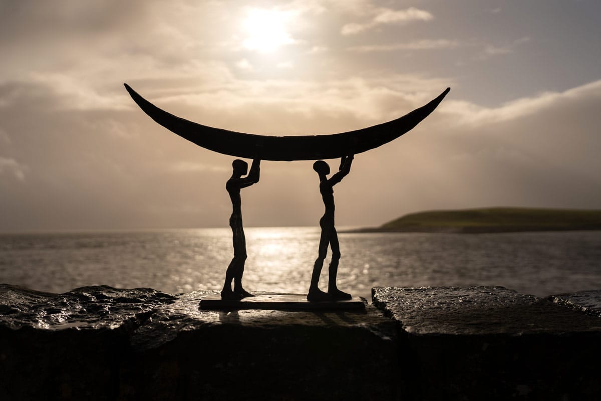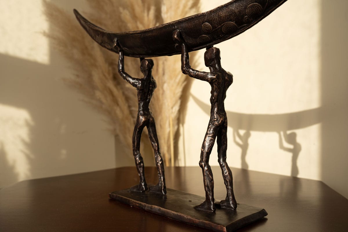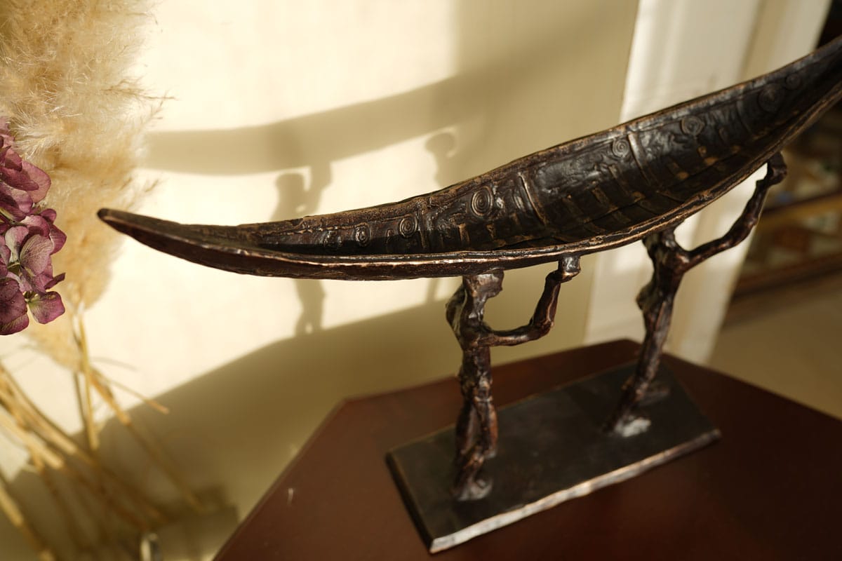 The symbol of the currach is a fabulous one; signifying strength, resilience, fortitude, and ruggedness. The people who lived by the sea also lived largely from the sea. They would fish in all weathers, using the currach to bring home the catch to their families. Sturdy and light, the currach is now often used in sea racing or currach racing. Clodagh Redden, a Limerick-born sculptress who began by working primarily in ceramic, now casts much of her work in bronze; adding to their impressive nature. Her signature piece has become the currach, or sculptures surrounding that theme. Whether in ceramic or bronze, her sculptures, particularly the boats, are always individually crafted and unique. This beautiful bronze piece depicts a male and a female form carrying their currach to the shore.