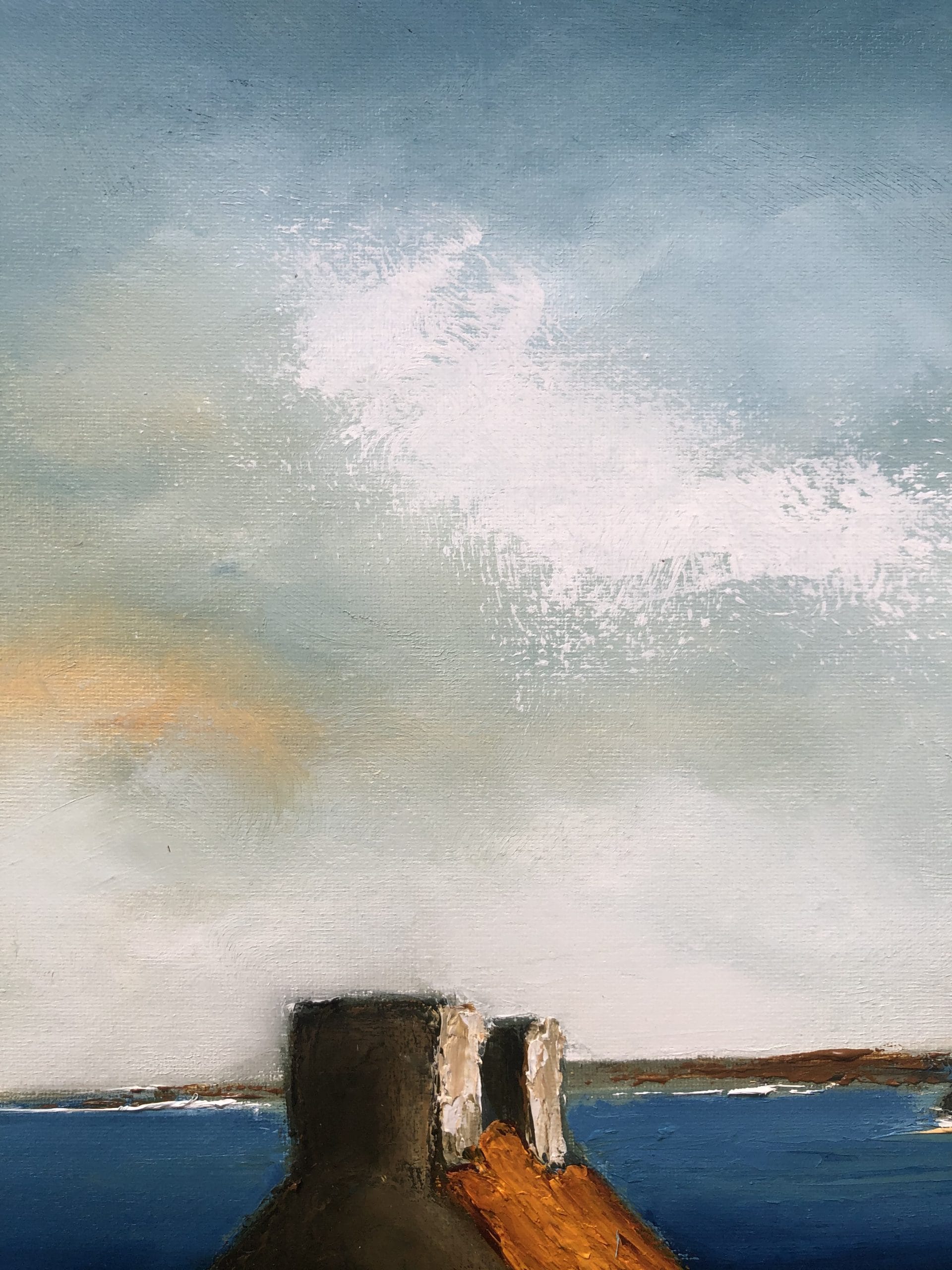 If ever there was a painting that reminded us of Spring time here in Clare, its this one. It’s late in the morning and the sun is high in the sky, the light is warm and comforting and casting shadows on the landscape. Like many beautifully perched cottages near the coast, built with their backs and gables to the breeze, it has a spectacular view and a perceived cosiness.