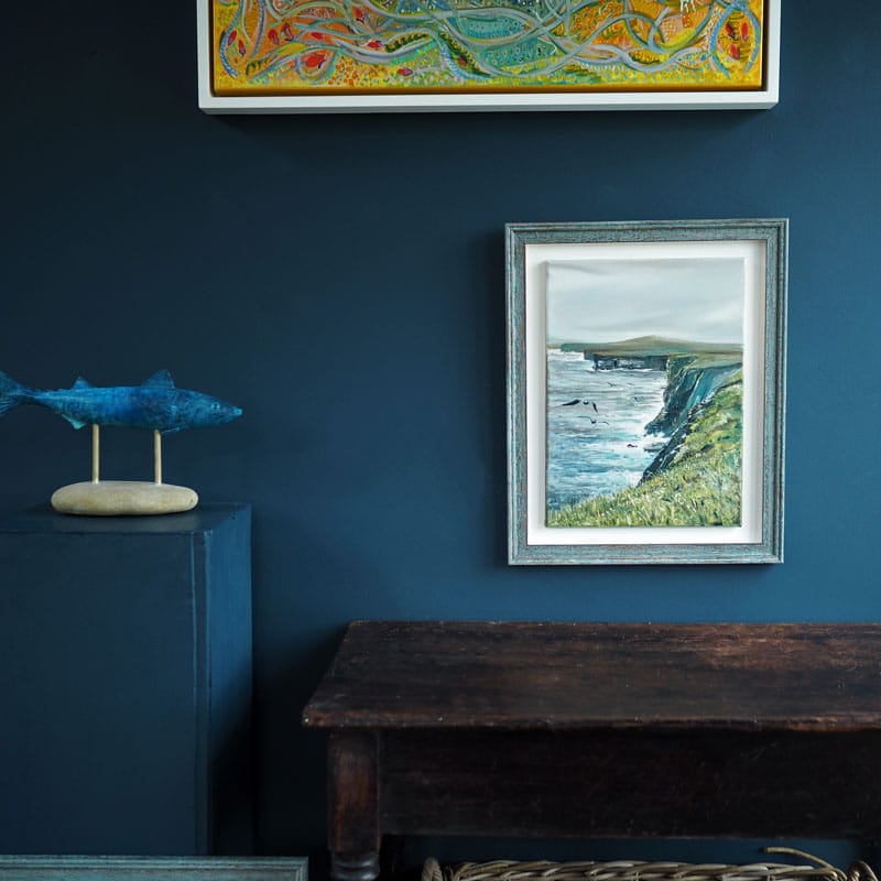 For those lucky enough to have hiked the cliffs around the lighthouse at Loop Head, in Co. Clare, they will be familiar with this particular vantage point. ‘Amharc Ceann Léime’ or Loop Head View, is a very beautiful, original oil painting by the artist known only as ‘D’. The artist has captured the atmosphere of this spot so accurately; the spongy heather in the foreground, the chough and seagulls circling the waves below and the sky, that familiar and strangely comforting, hazy grey.
