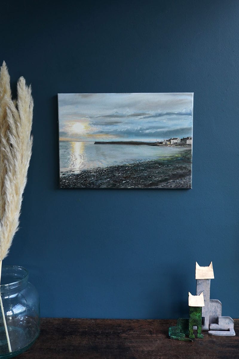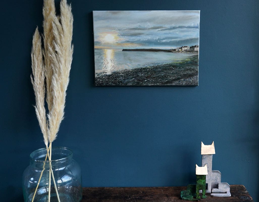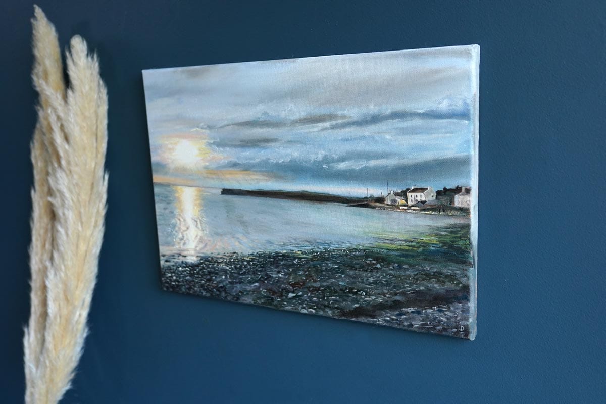 This artist – who is signing their work as ‘D’ – just keeps on producing the most incredible little originals. Such an exciting period in their career and a great time to snap one up. This is a truly fantastic evening depiction in oils of the familiar setting of Cappa, Kilrush, West Clare. Everything on this canvas, from the gentle reflections on the water, to the atmospheric sky, the familiar pier setting and even the seaweed and stones on the shore, are all so beautifully and sensitively painted. You can feel the artists energy in this particular canvas.