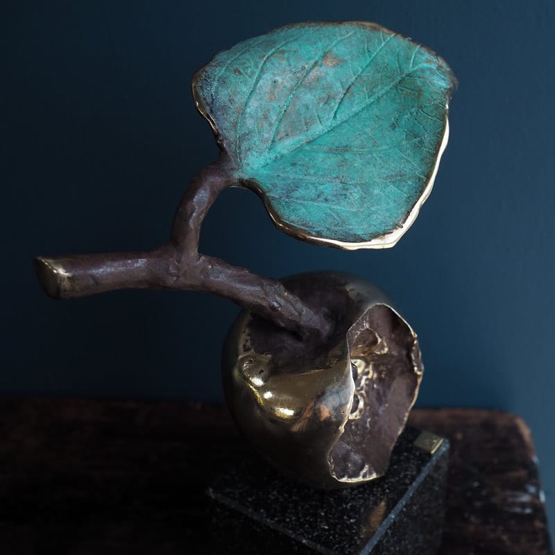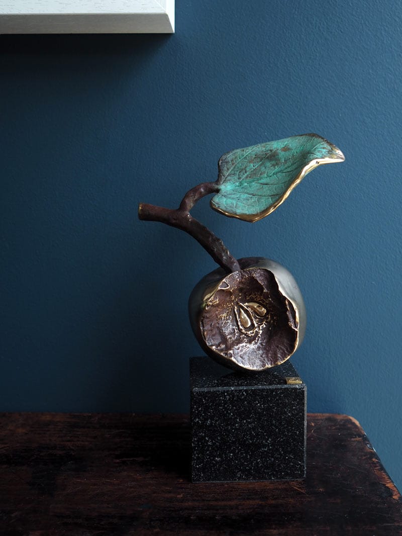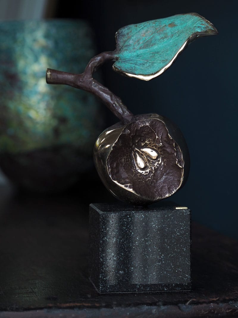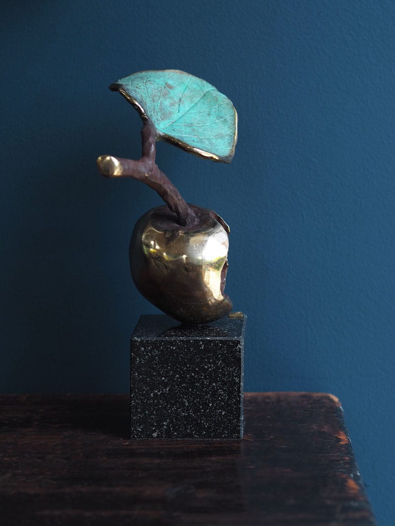 https://vimeo.com/448585923If we only had one bite of the apple, one chance at a big decision, one true opportunity, how would you take it? What would you do with it? What that in mind, this bronze Apple by Arturas certainly becomes food for thought. Sculpted and cast in his own studios, the Lithuanian born artist is resident in Co. Galway for many years now and has become known within art circles for his quirky, interesting and thought provoking sculptural pieces. The bronze apple is a beautiful, extremely tactile, gorgeously patinated piece of sculpture and sits rather heavy on a square stone base.