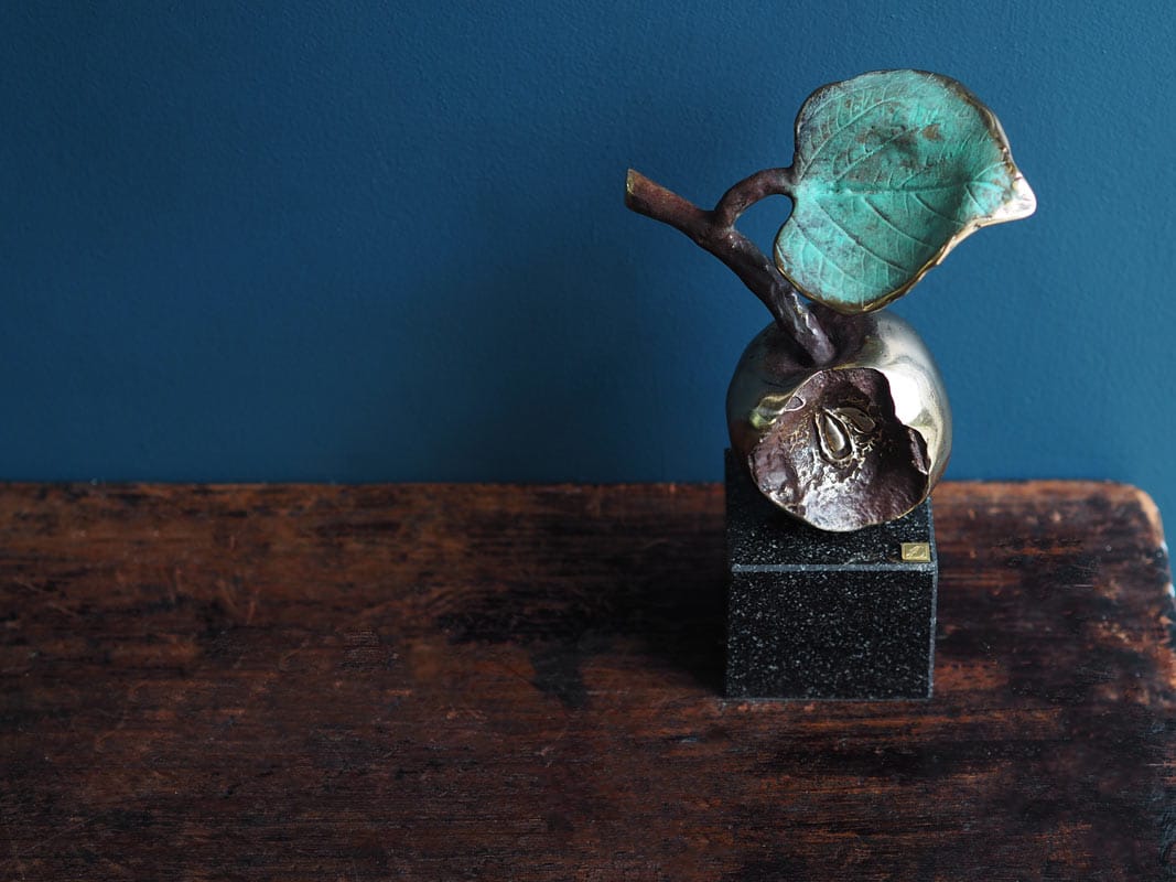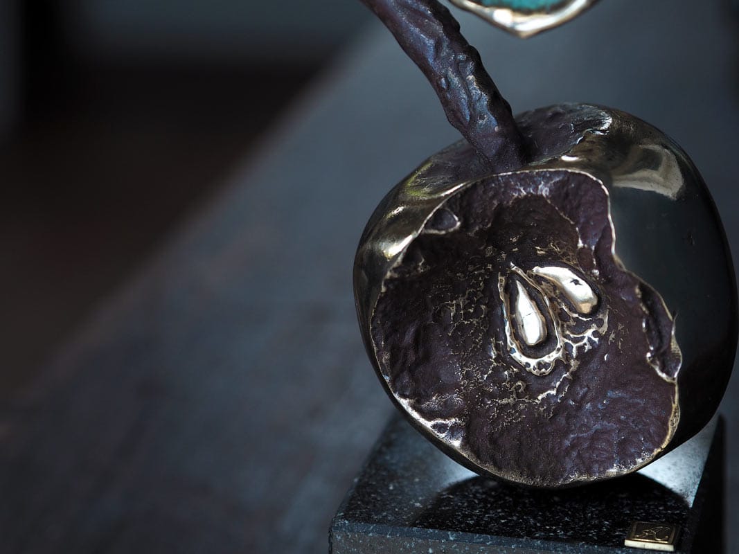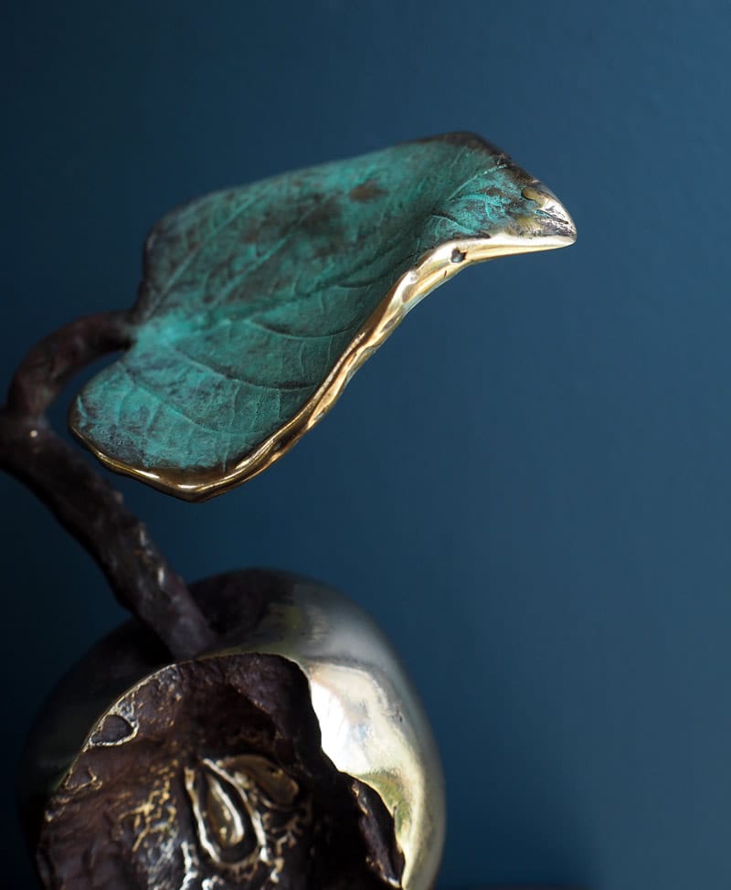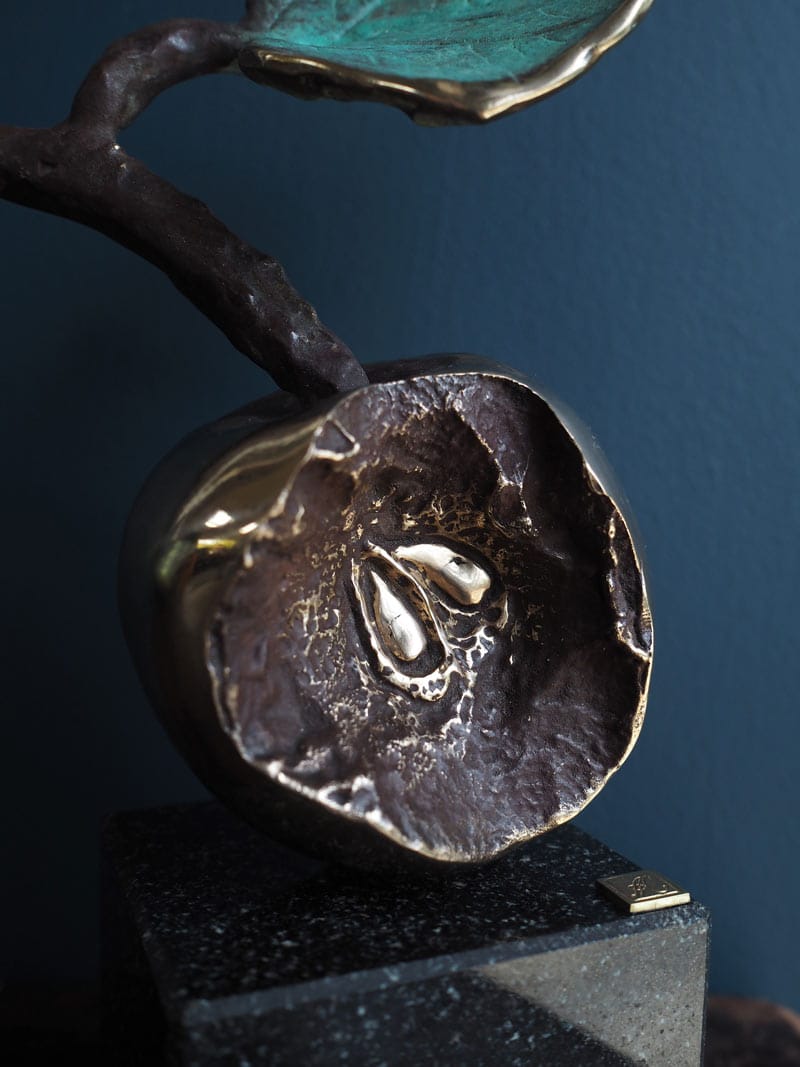 https://vimeo.com/448585923If we only had one bite of the apple, one chance at a big decision, one true opportunity, how would you take it? What would you do with it? What that in mind, this bronze Apple by Arturas certainly becomes food for thought. Sculpted and cast in his own studios, the Lithuanian born artist is resident in Co. Galway for many years now and has become known within art circles for his quirky, interesting and thought provoking sculptural pieces. The bronze apple is a beautiful, extremely tactile, gorgeously patinated piece of sculpture and sits rather heavy on a square stone base.