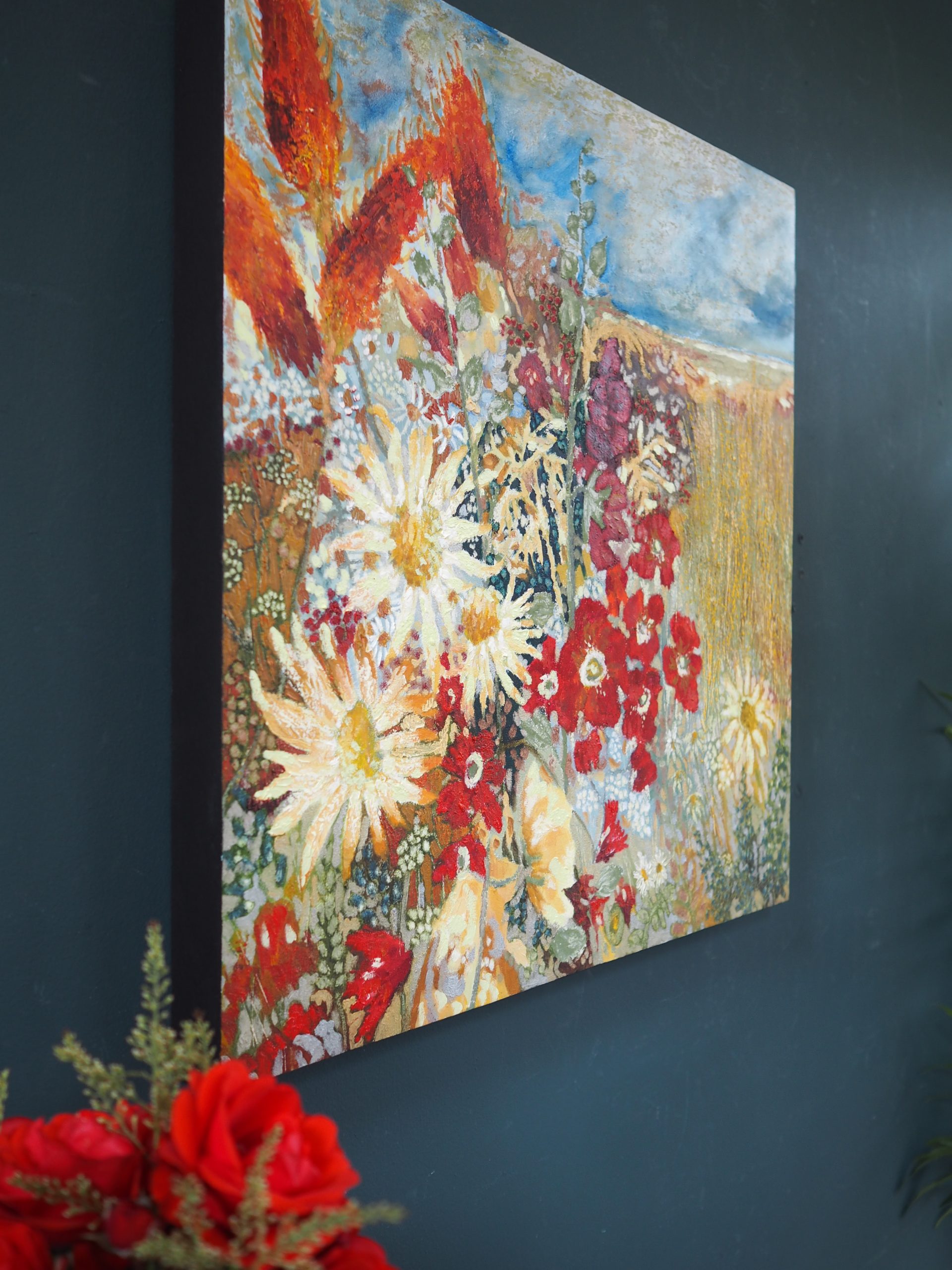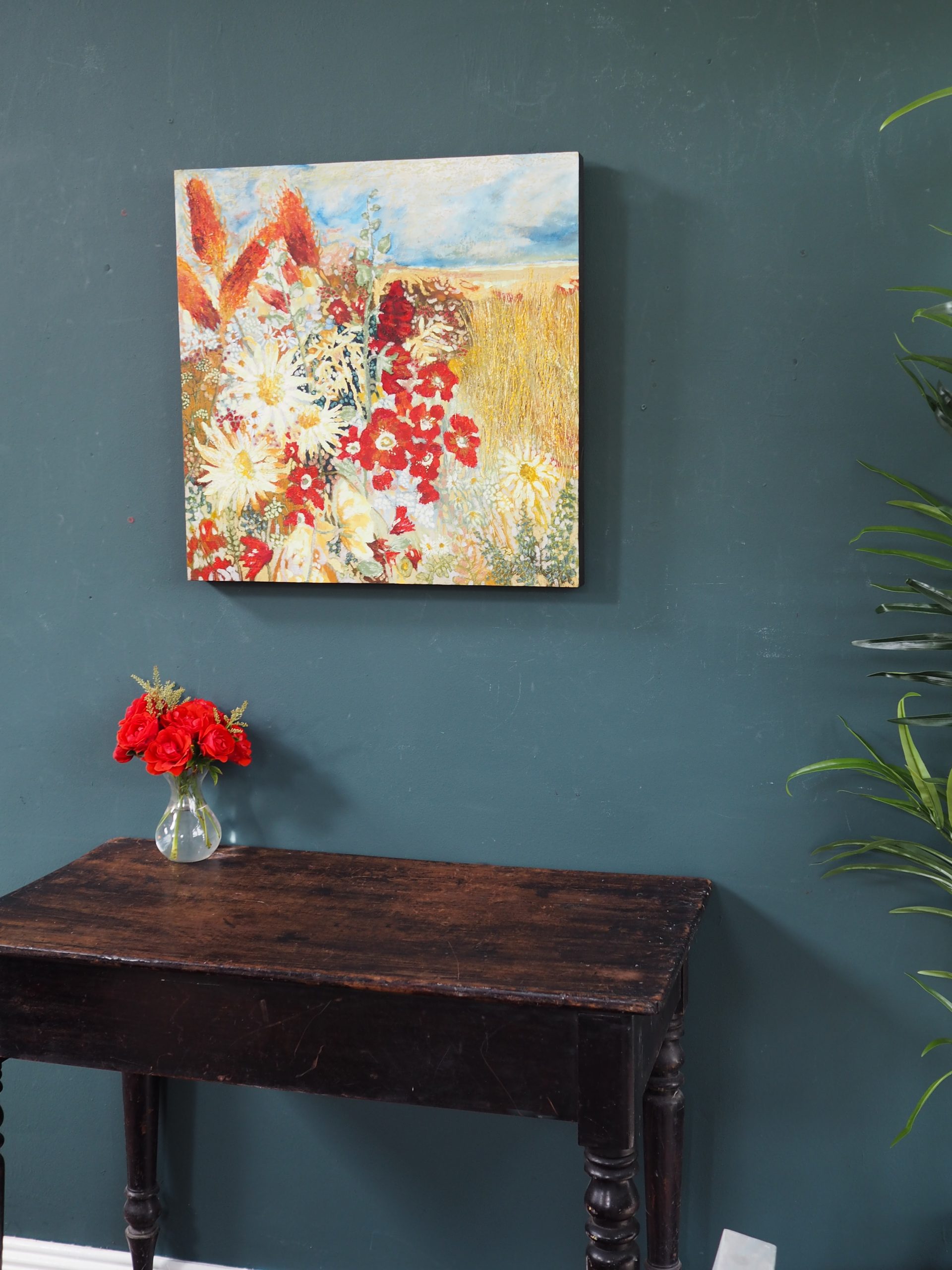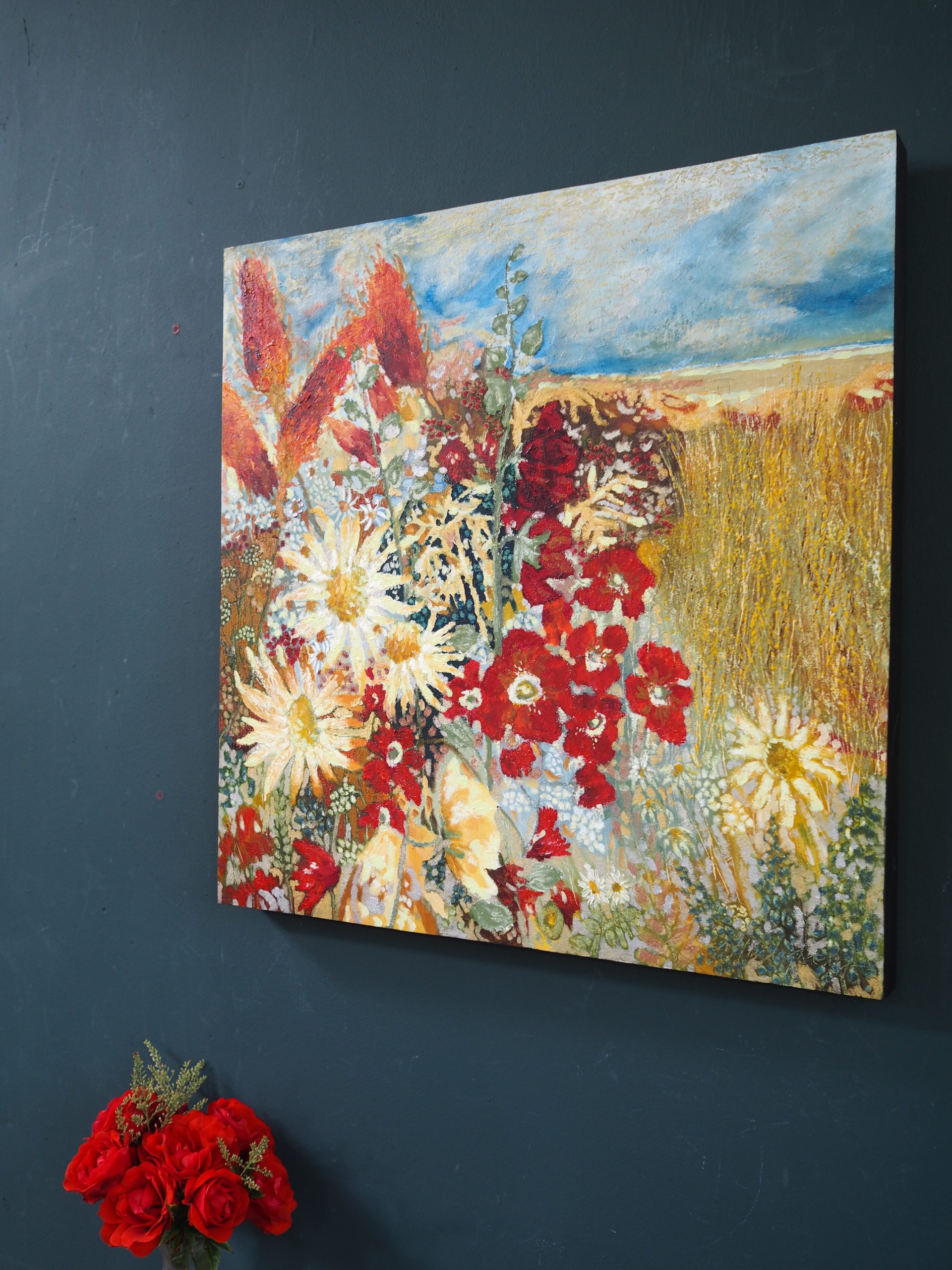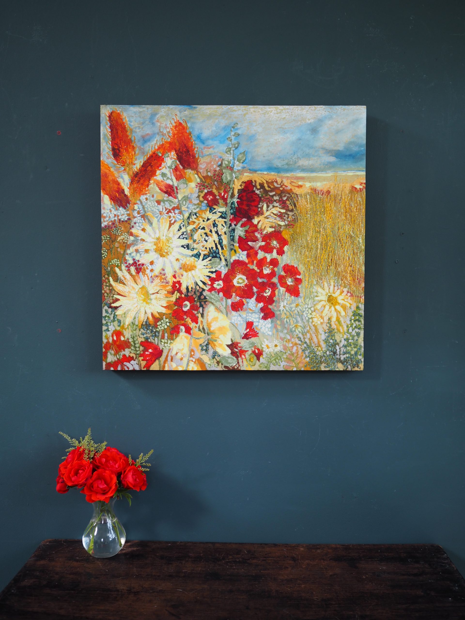 This painting, ‘Atlantic Garden’ is such a brilliant, bright and colourful contemporary piece. It looks wonderfully striking on any wall space and truly embodies the freedom, warmth and beauty of Summer. A signature stamp of Eadaoin’s is that she often has a foreground full of flowers, and the horizon and meadows in the distance. So, stunningly, pretty.