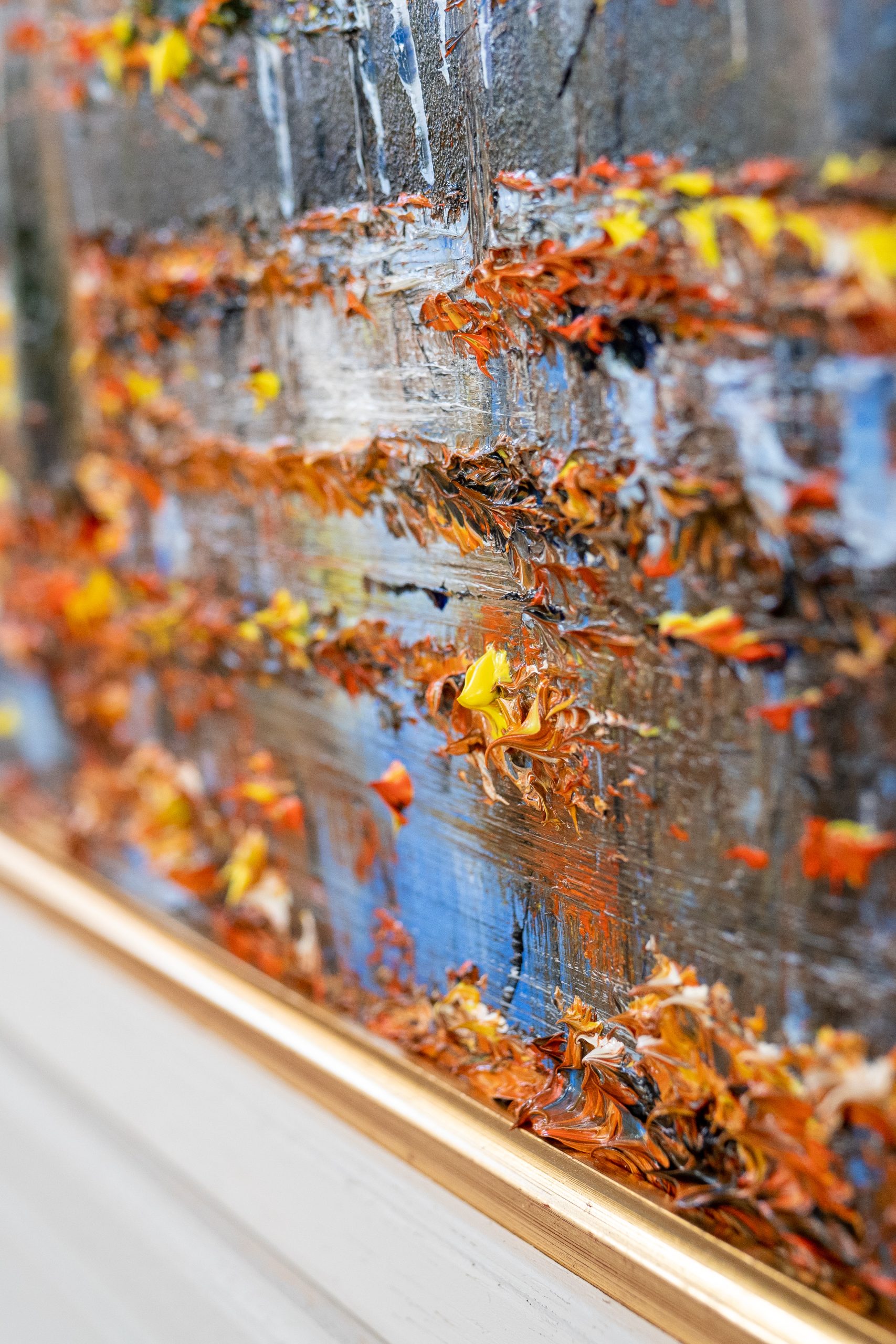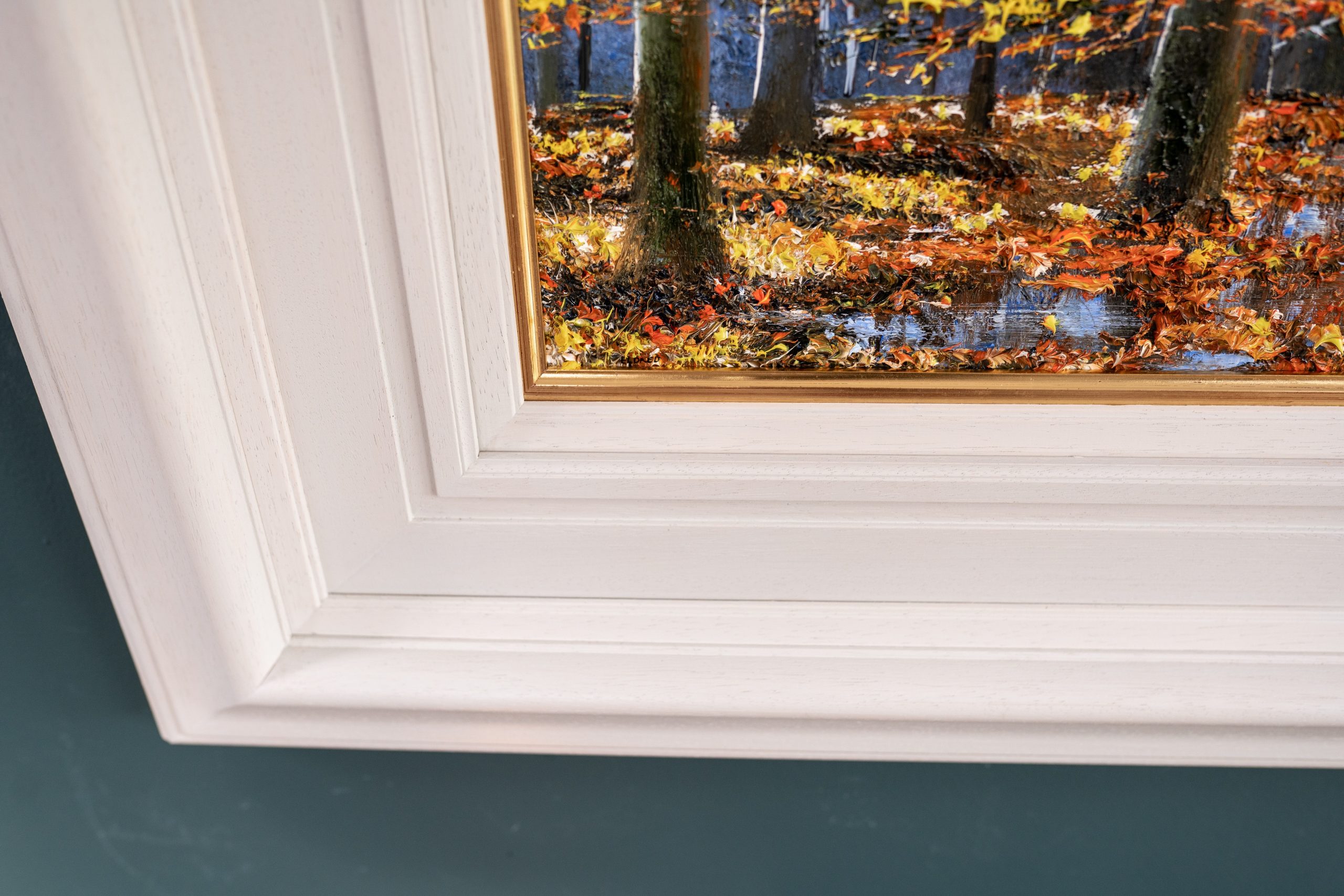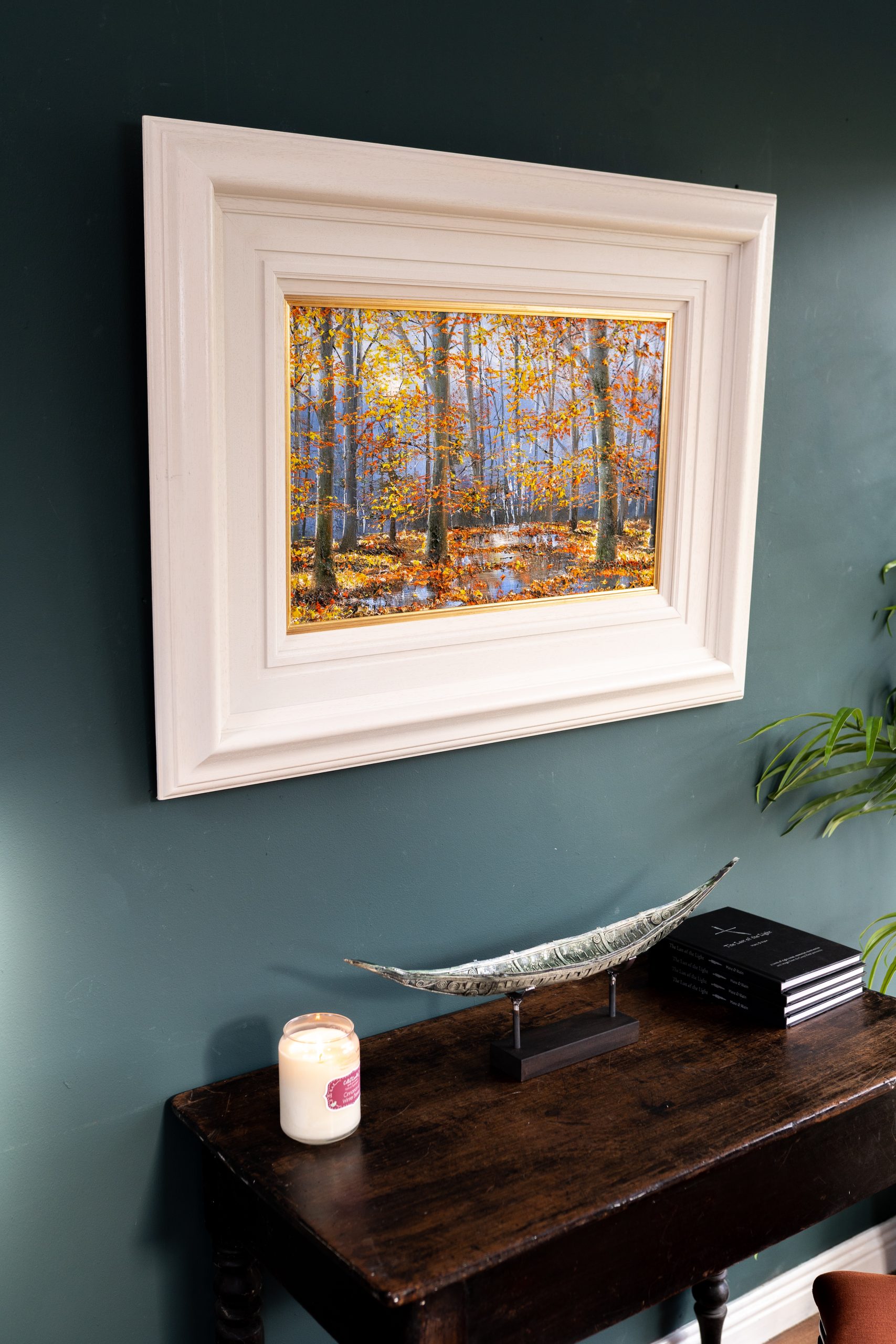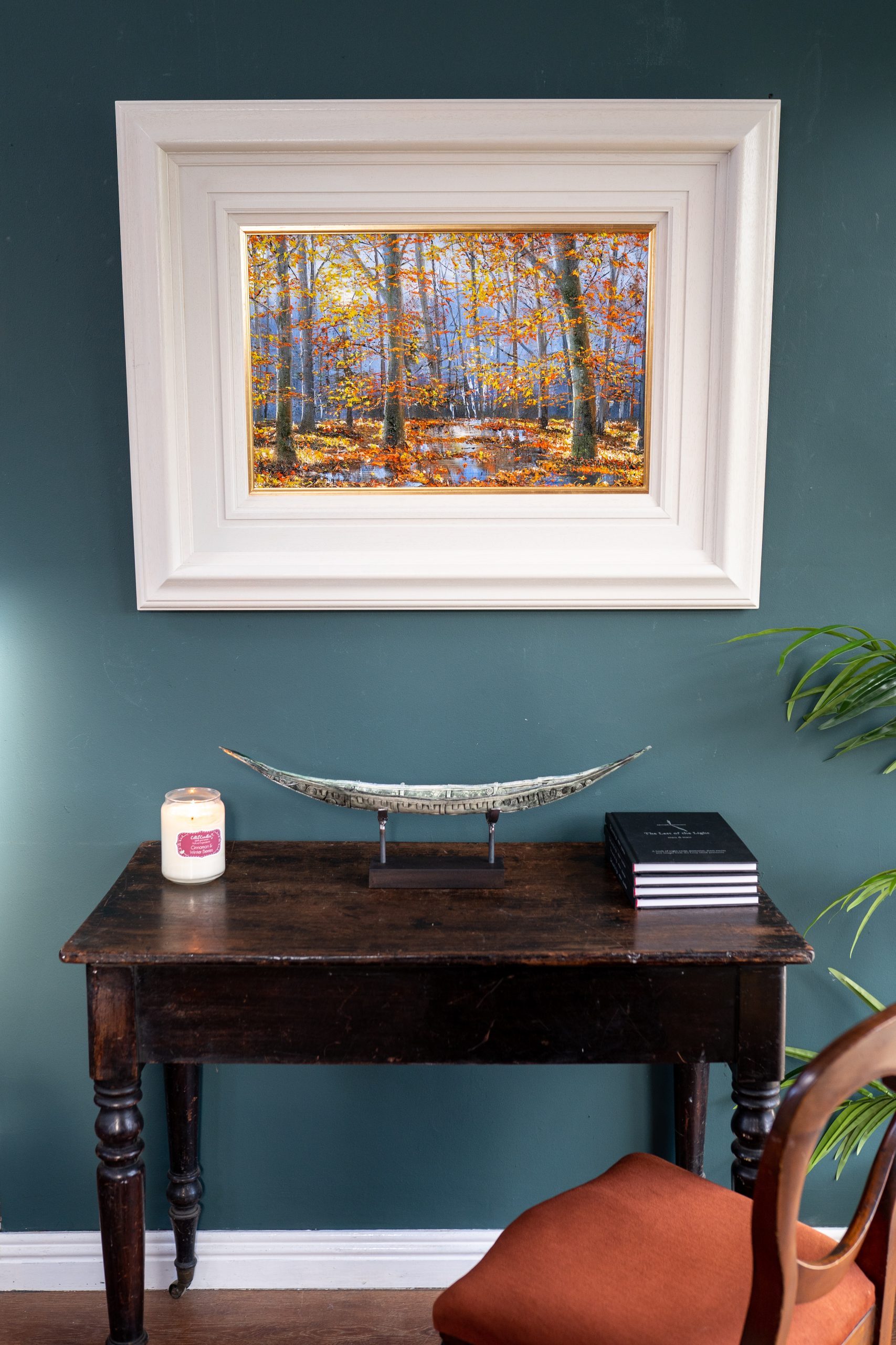 The layers and layers of oils, and Eldred’s masterly application, brings light and perspective to the work. The reflections on the water on the ground, the trees off in the heart of the forest, that you can make out in the distance, and the yellows and burnt oranges of Autumn leaves, as they start to form a carpet on the forest floor, all make this painting the stunning piece that it is.