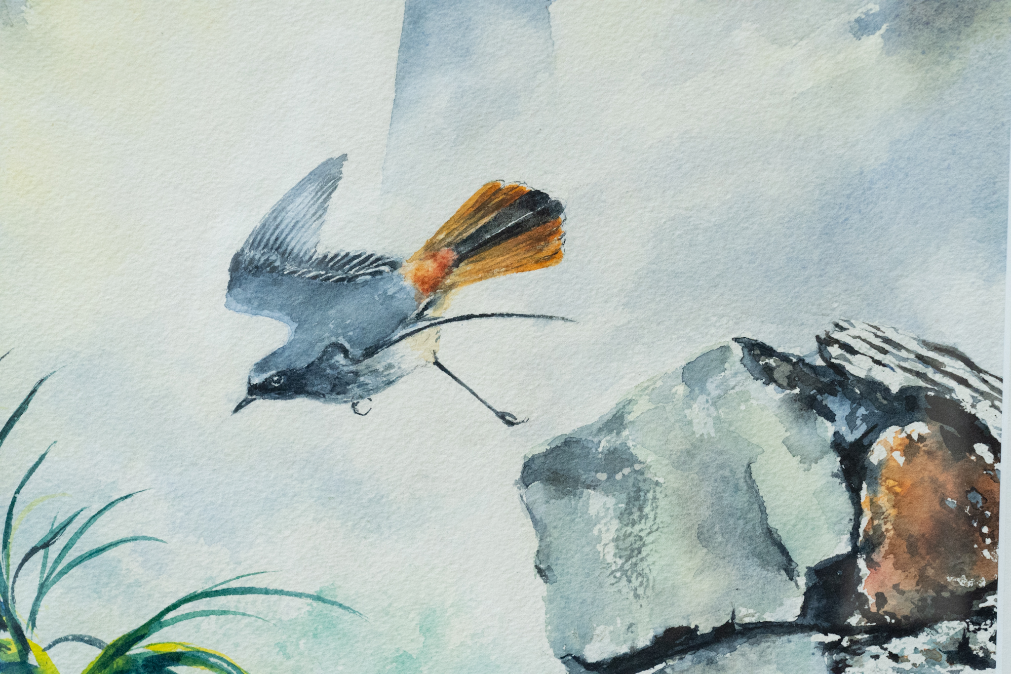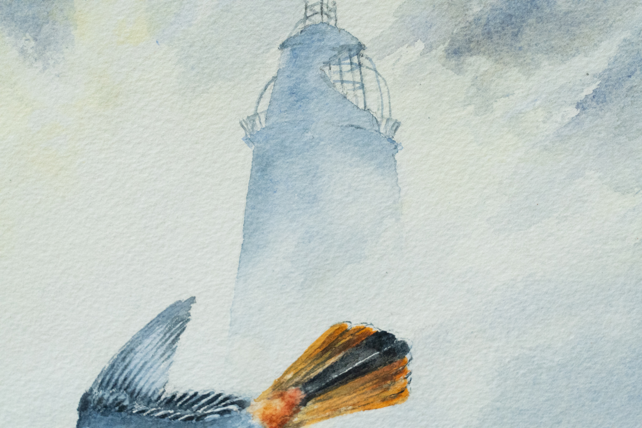 A beautiful hand, a delicate touch and gorgeously handled details by the artist Phil Brennan. This is an original watercolour painting of the a Black Redstart, in full flight, in front of a looming Loop Head Lighthouse in the background.