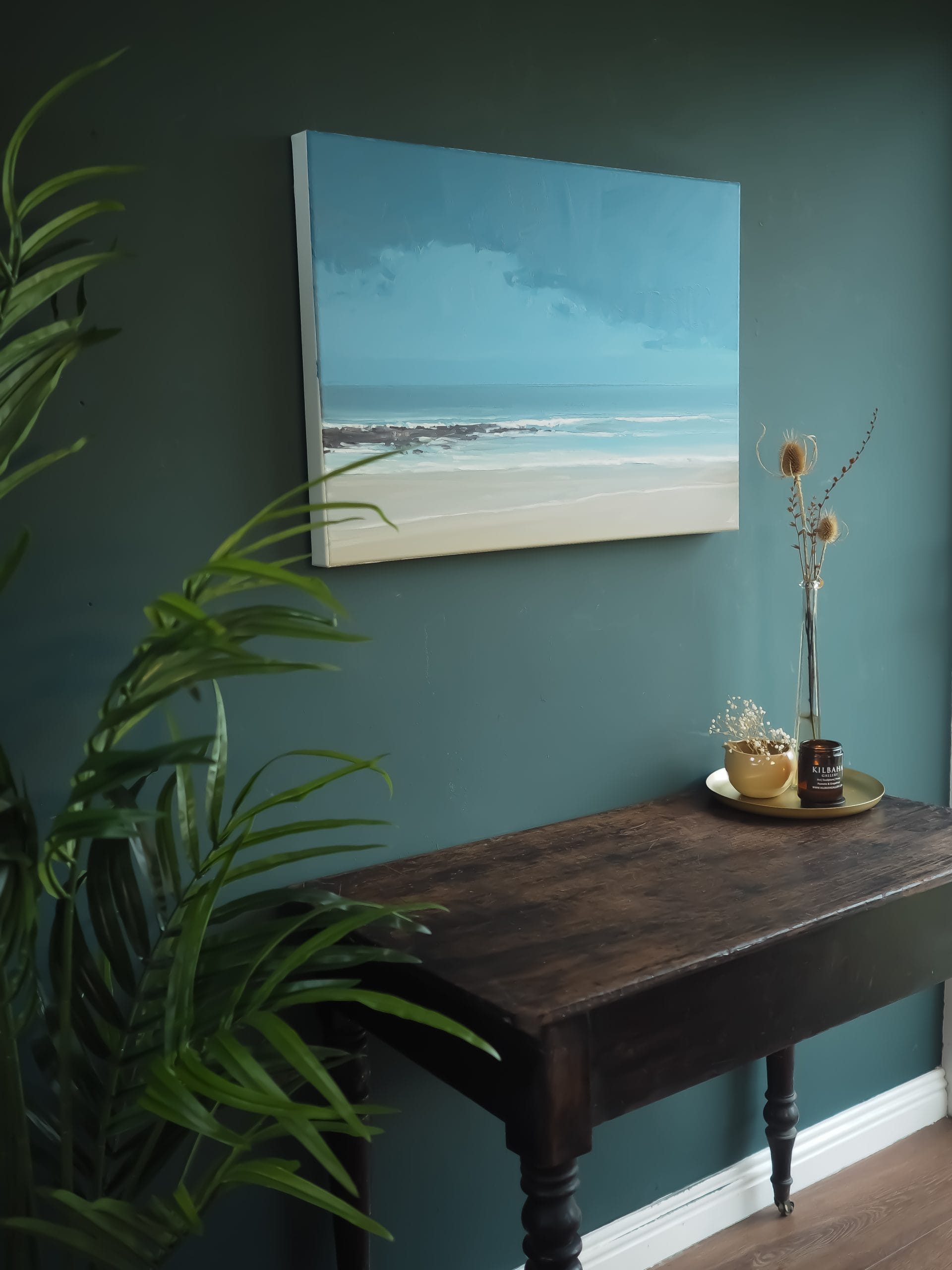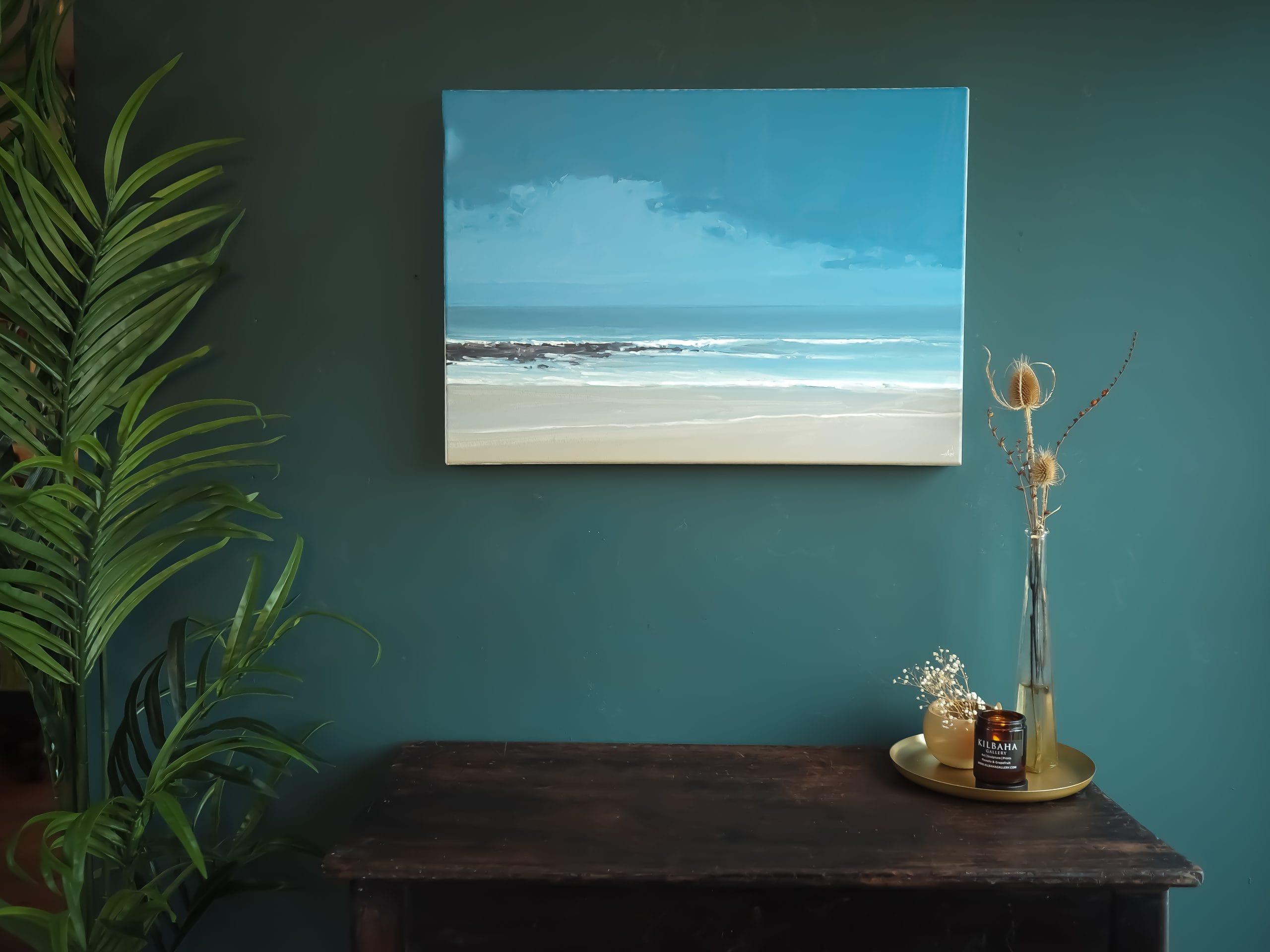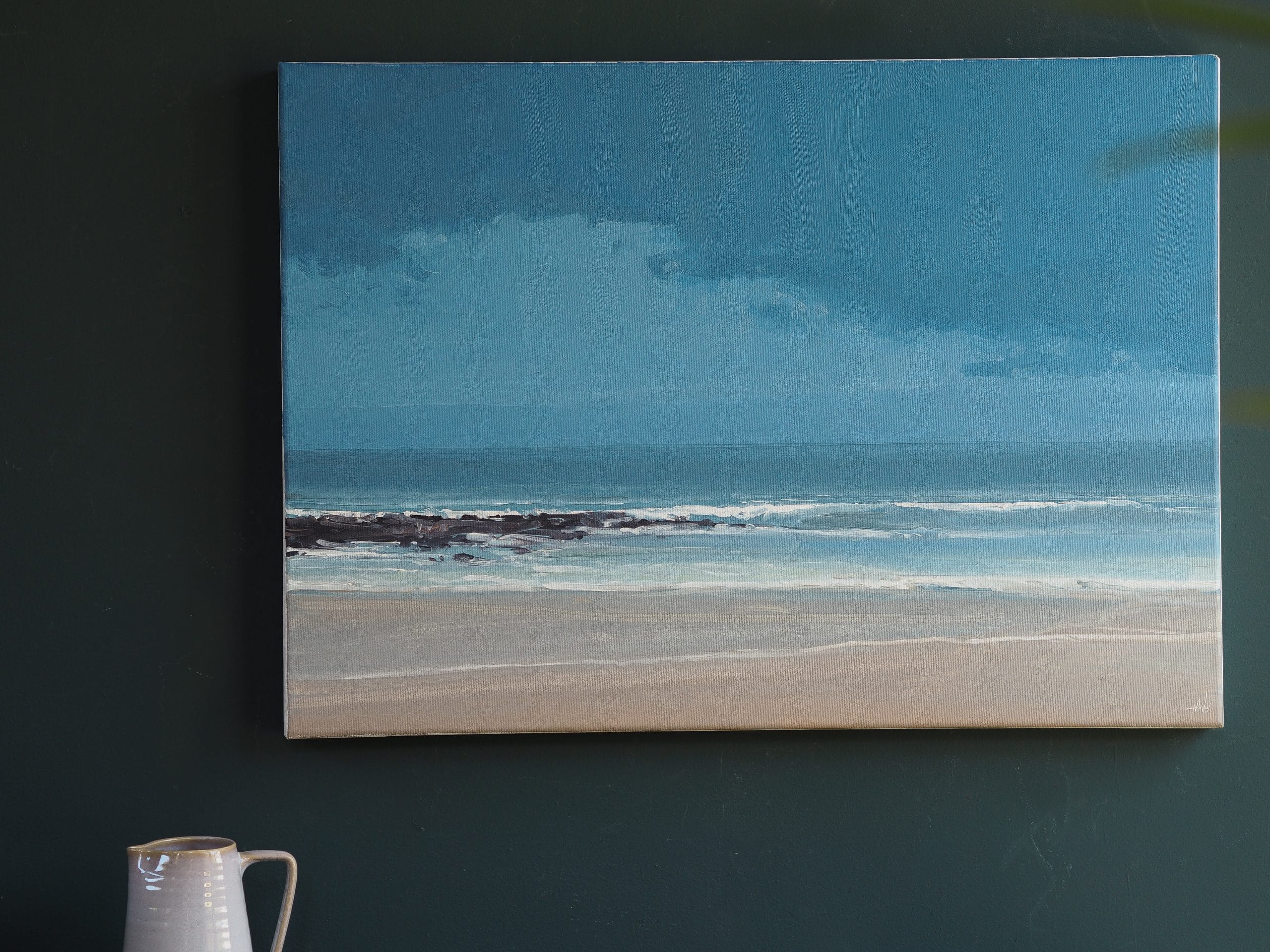 Originally hailing from the Kingdom of Kerry, it is no surprise that artist Kaye Maahs has taken inspiration from her home beach, the Black Rocks, Ballybunion. This oil on canvas is an exquisite depiction of this expansive beach. Delicately but confidently handled, the waves breaking beyond the rocks; the tide creeping its way in along the sand. A stunning piece of original art.