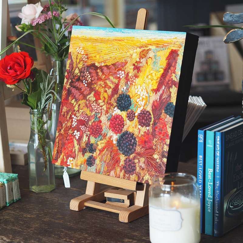 - Ah … that beautiful transition from Summer to Autumn heralds the arrival of the Smeara Dubha (blackberries) on the hedgerows around the West of Ireland. These are a familiar and welcoming sight; one that brings delight to children everywhere and brings adults back to their childhoods, wandering along with a basket – (with more blackberries smeared around your mouth than were collected). This gorgeous piece, one of a series of blackberry paintings by Eadaoin, brings that sense of warmth and nostalgia into your home or office. It’s a gorgeous original oil on board and is the perfect size for either hanging or freestanding.