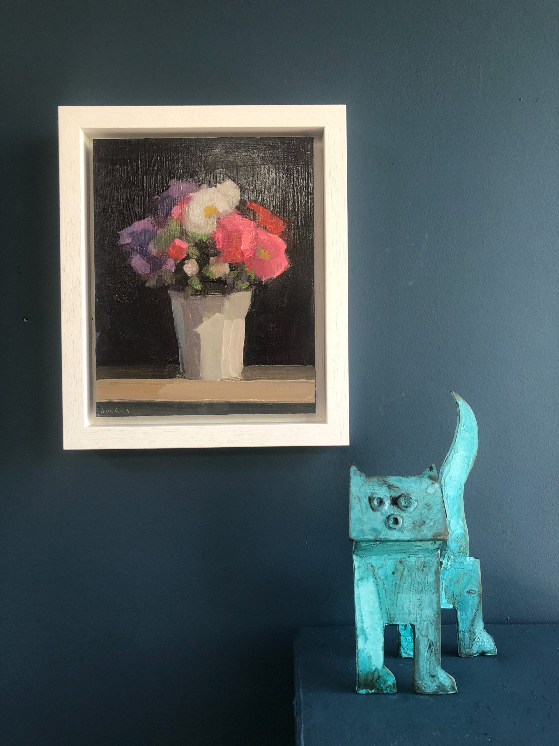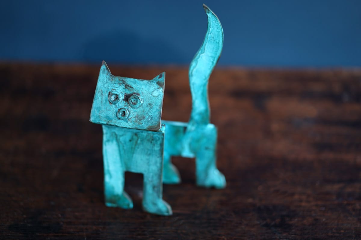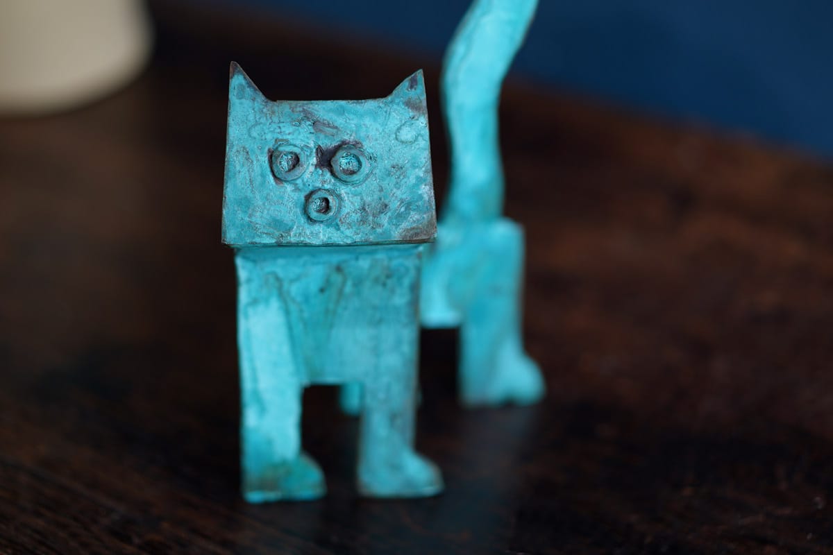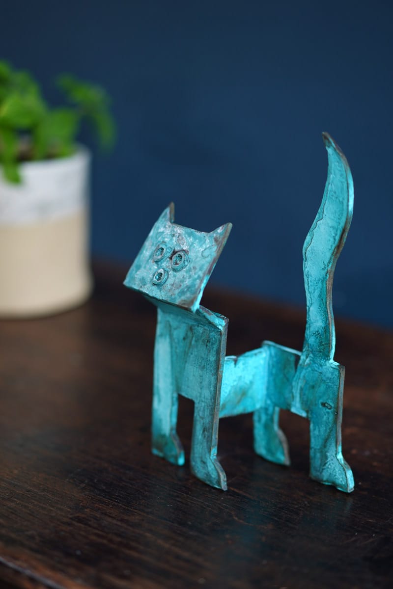 With its upturned head, crazy but curious little expression and tail pointing high in the air, this adorable stylized bronze cat is eagerly awaiting his new home. In Connolly’s signature boxy style and patinated in layered greys and greens, this piece is wonderfully quirky and helps to copperfasten how something that is cast in bronze and so clearly abstract in form, is still so incredibly full of personality. Seamus sculpts, casts and patinates all his own work in his foundry in Loop Head, West Clare.