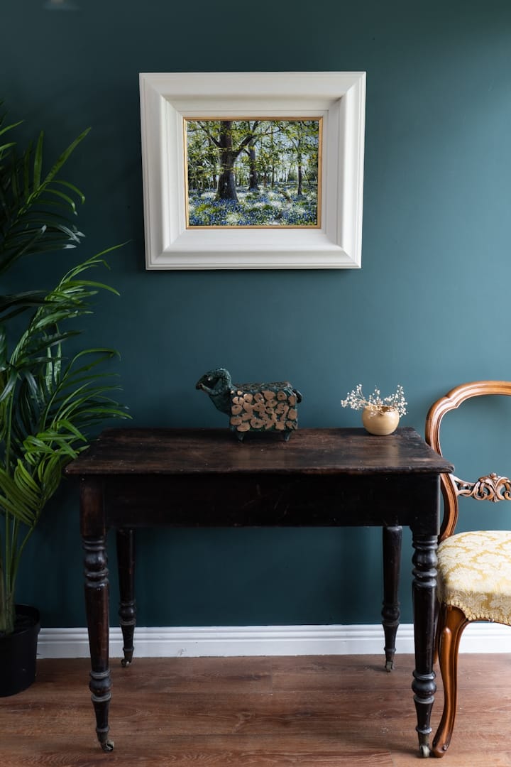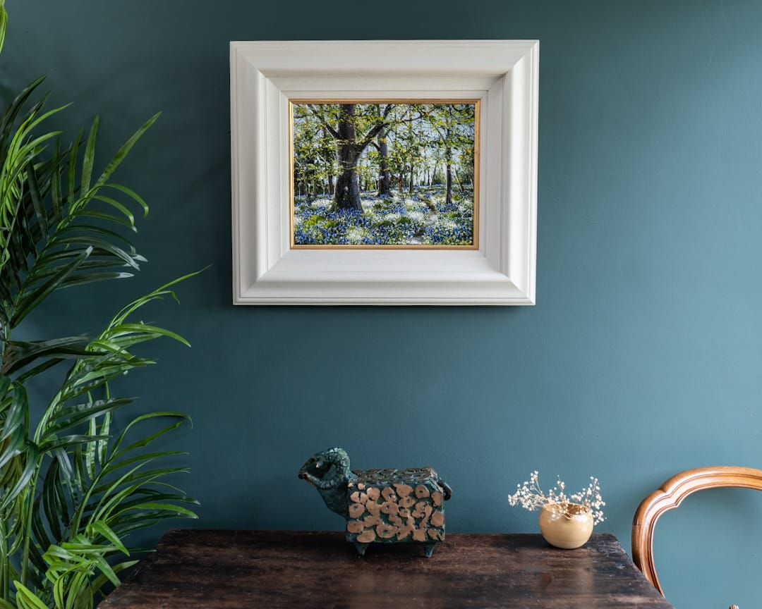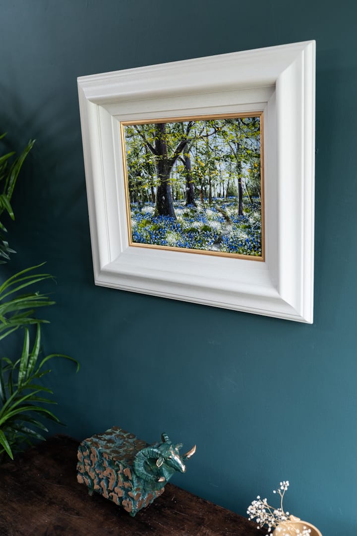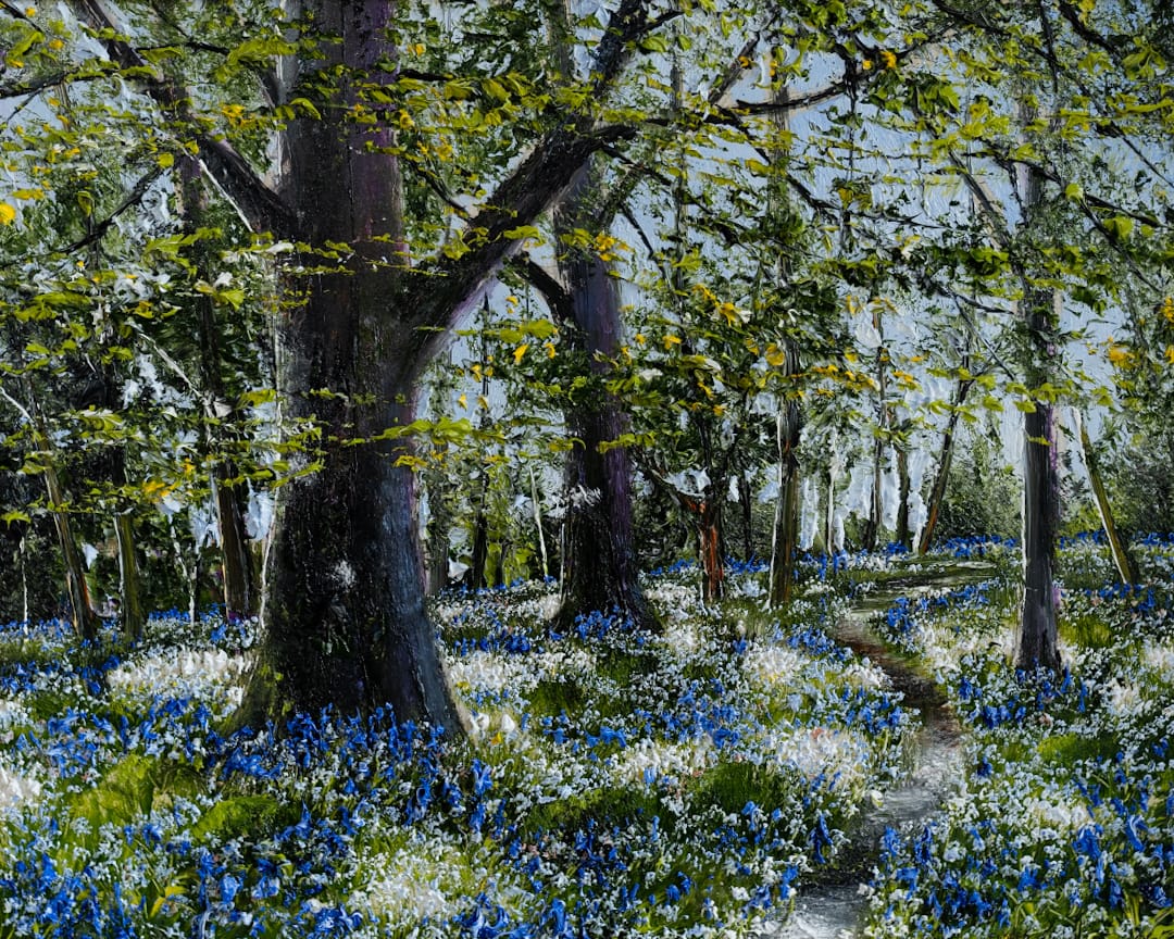 Another extraordinary oil painting by the master himself, Mark Eldred. This accomplished artist has chosen a beautiful vantage point for his painting, from right in the centre of the forest; where shafts of sunlight flood between the branches, shining down on the carpet of bluebells, grass and wild garlic below.