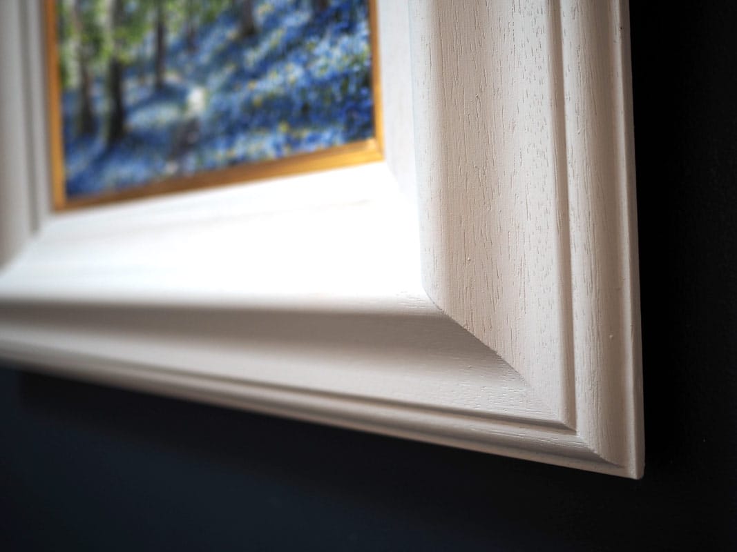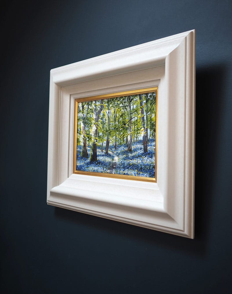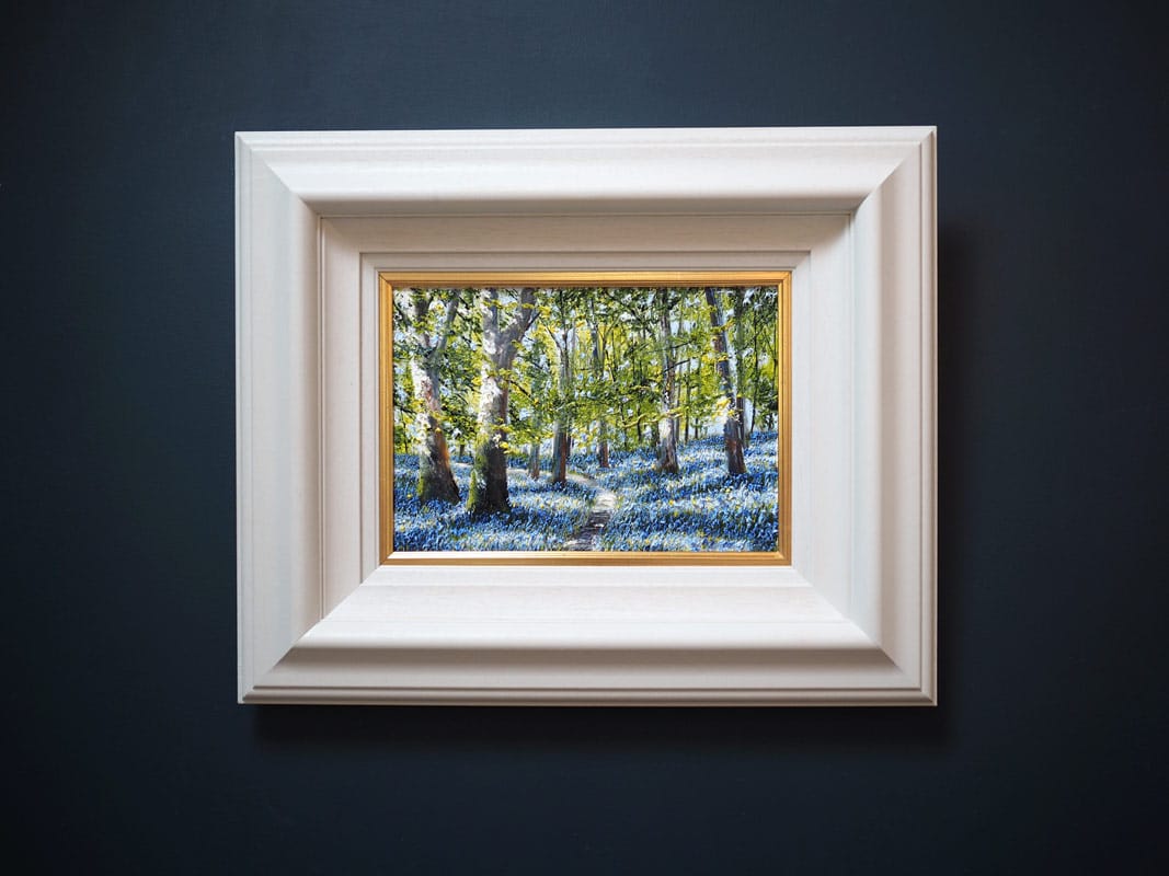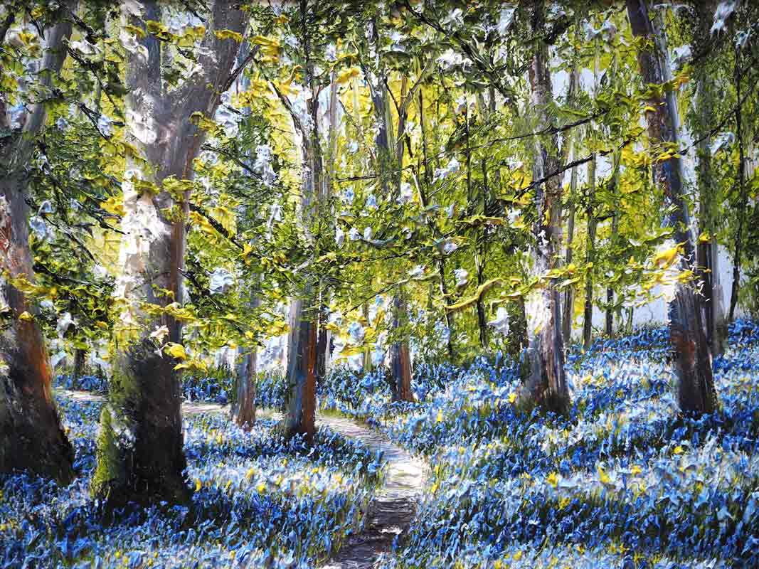 With the sun high in the afternoon sky and its light cascading fabulously down through the leaves and branches of the beech trees, enveloping the carpet of bluebells below, you only wish you could breathe in and smell natures bounty in front of you. No scene is captured quite as true to life, quite as perfect in that split second of nature, as a Mark Eldred painting.