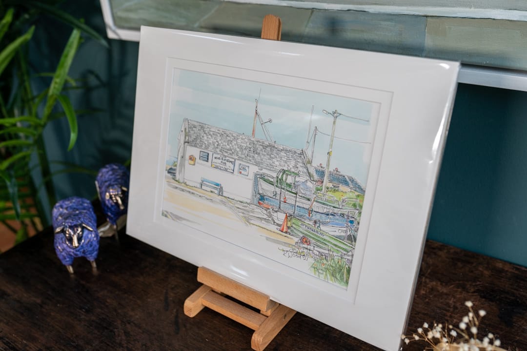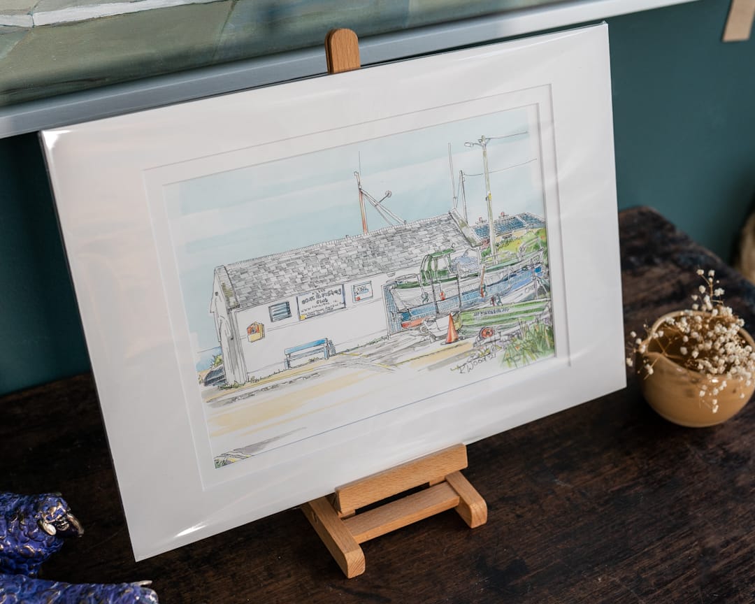 In the artists own words: “For the local people of Kilkee, the Boathouse embodies generational memories of those who lives and livelihood depended on the sea. I have included a currach to the left of this watercolour. The currach was the traditional fishing vessel of in west Clare”.