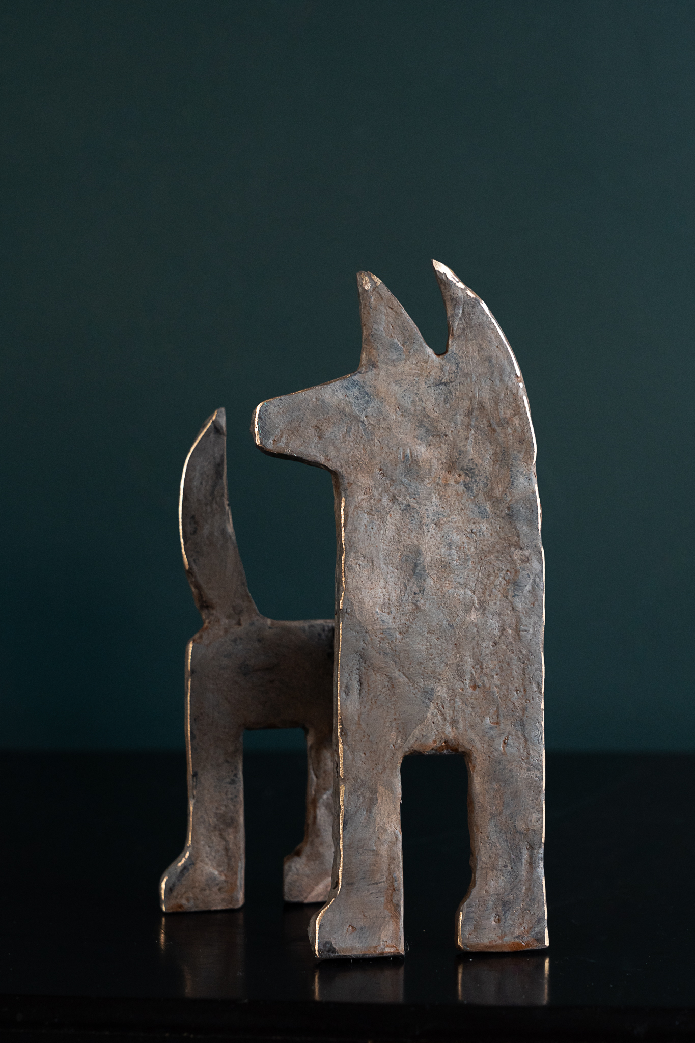 Seamus is one of Ireland’s leading bronze portrait sculptors. When not busy with commemorative life-size commissions, Seamus loves to focus on his stylized animal sculptures. One of his signature styles is this way of turning these two dimensional sculptural elements into what becomes an adorable three dimensional piece, full of personality and charm. Part of his series of dog sculptures, this is a beautiful wee fellow – light brown in colour with layered patina in a matte finish that allows for some interesting flecks of the lighter and darker hues beneath to peak through and polished edges. Stunning.