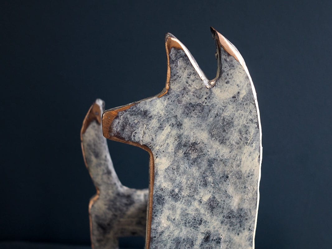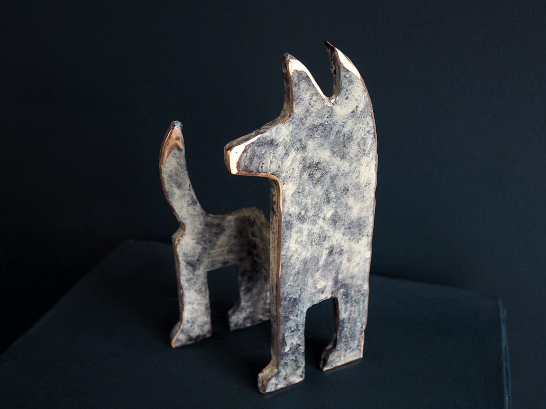 This is a beautiful stylized bronze dog in Connolly’s signature 2-dimensional, flat face form and with a delicate blue-grey patina. Connolly draws on his love of animals for these pieces and they are truly ridiculously cute as well as being distinctly quirky and different. This little guy is free standing and at €300 is a superb price for an original piece of Irish bronze sculpture.