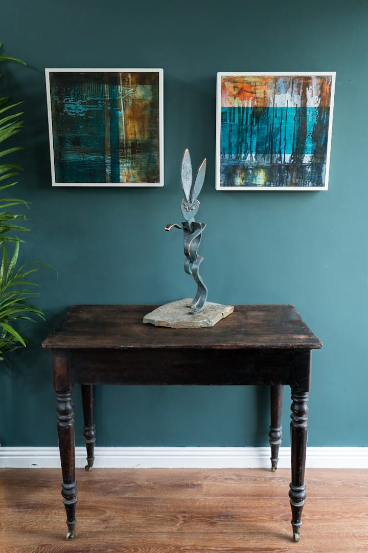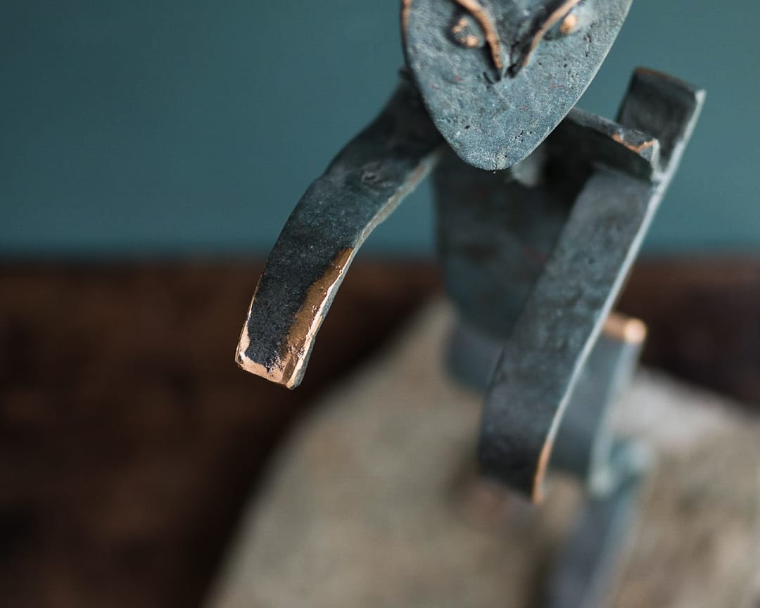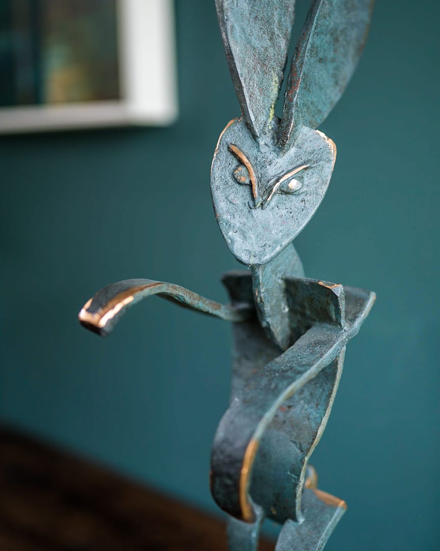 This rather quirky hare, sculpted and cast into bronze, with a dark layered blue and grey patina, makes for a very impactful and fun piece of art to own. Standing rather tall at approximately 25″, he really is a talking point piece. Sculpted by Seamus Connolly here in his own studios and bronze foundry in Kilbaha – one of his signature stylized bronze animals. Connolly is busy creating life-size commemorative statues for various committees around the country, so these little stylized pieces are few and far between right now!