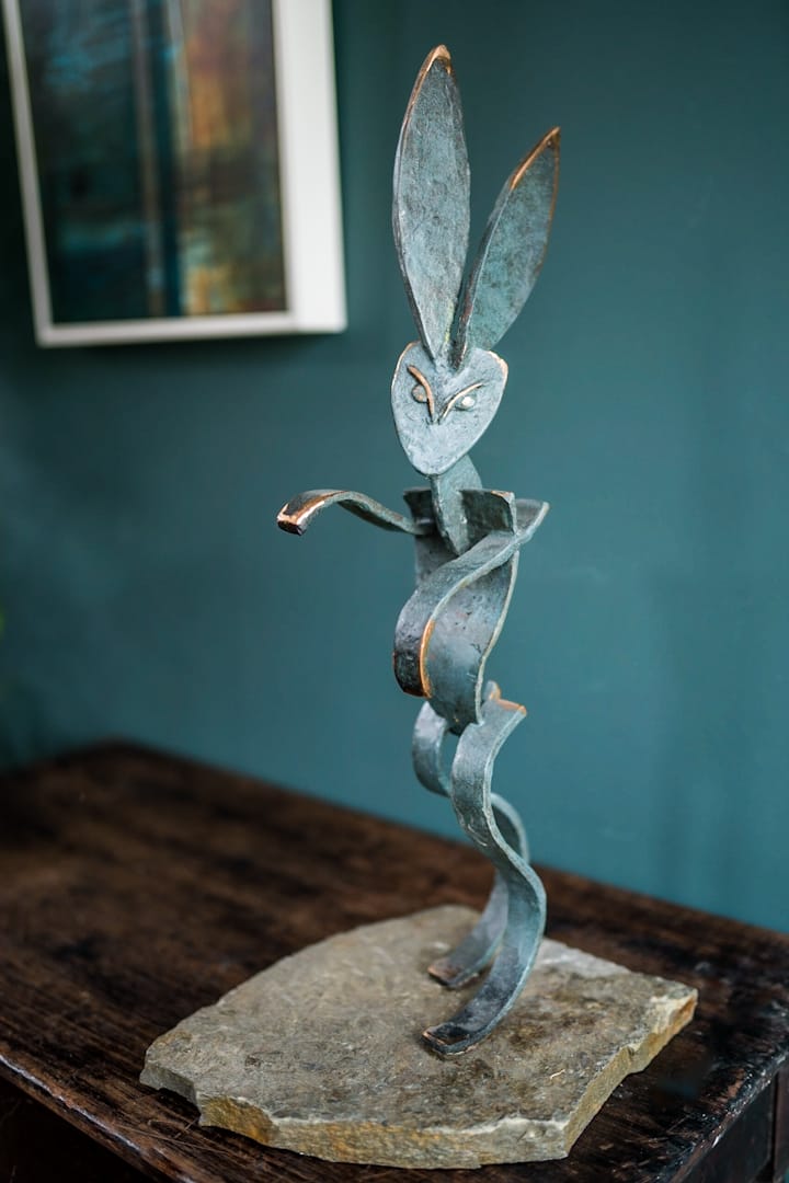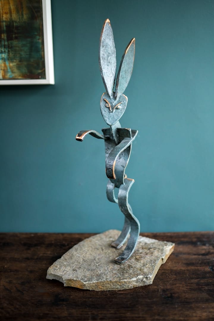 Collectable artwork – bronze hare – stone base – heavy piece – quirky – talking point – stylized work –