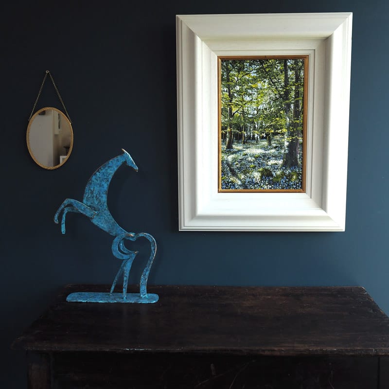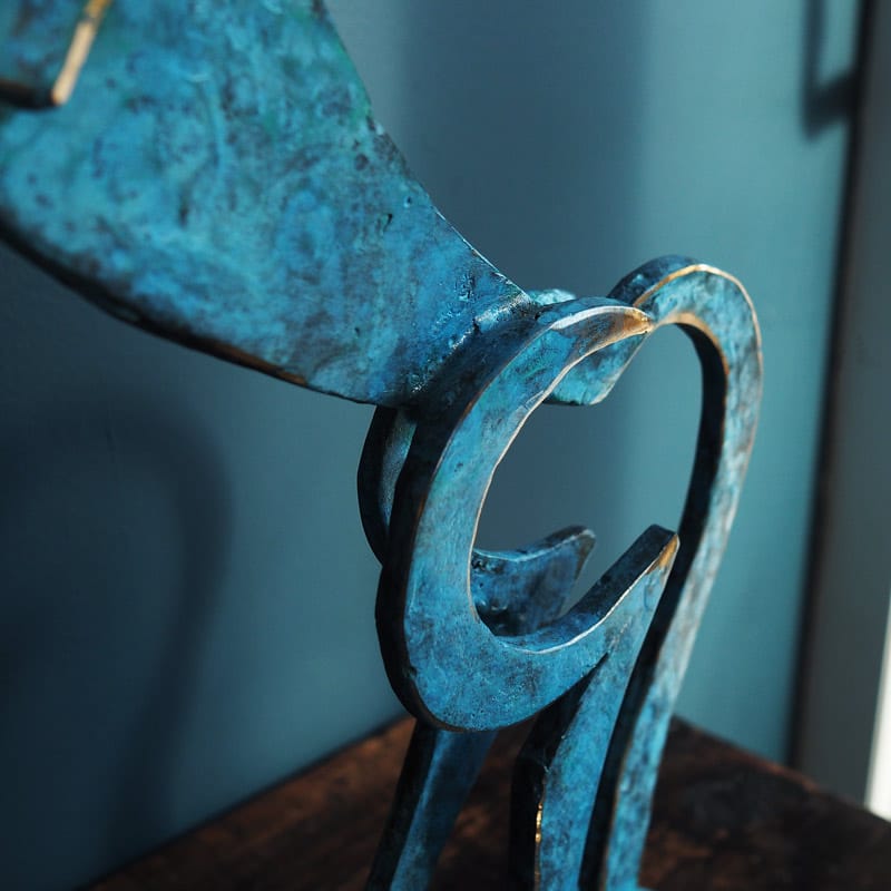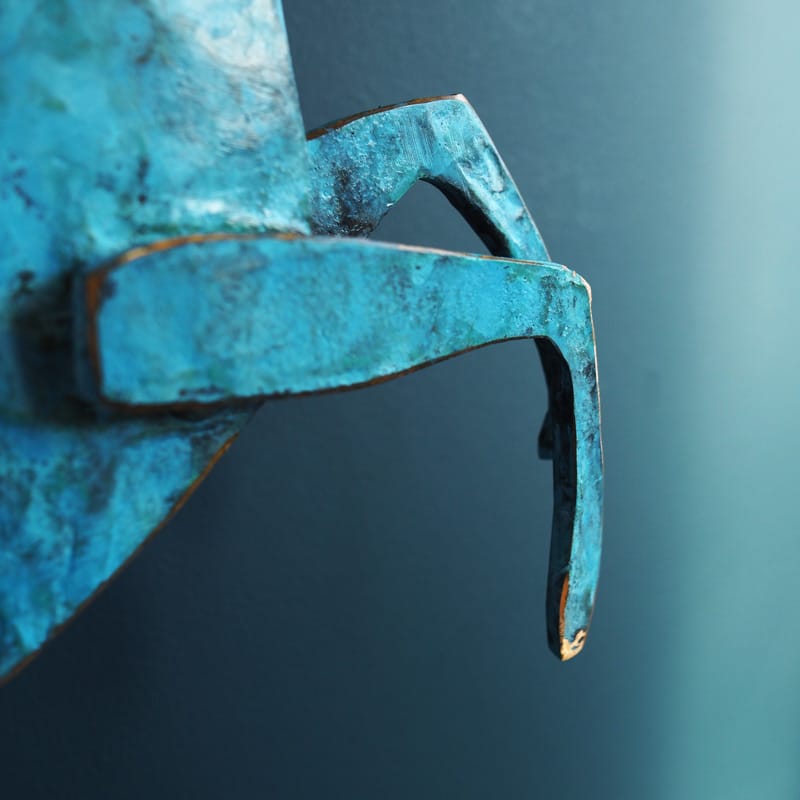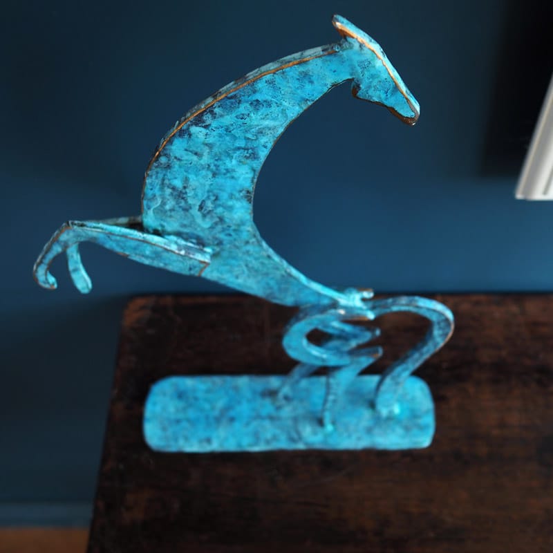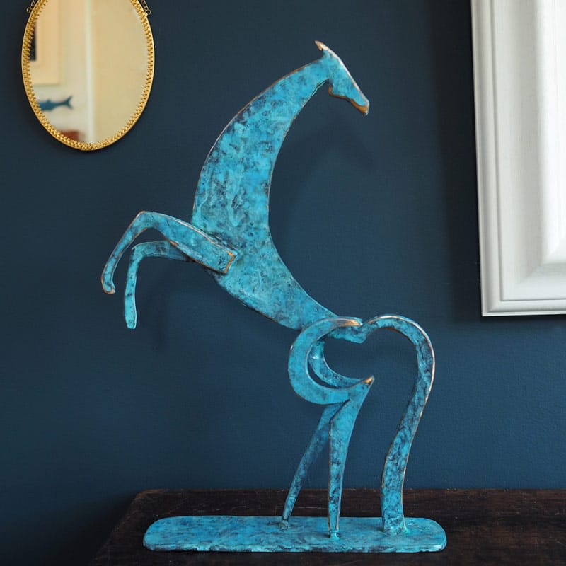 With rearing body and back turned head, this magnificent contemporary horse by Seamus Connolly, certainly catches the eye. Aesthetically beautiful with a striking green / blue patina, this elegant bronze stands tall at approx 17″ high and makes quite a very strong visual impact. Would make an exciting addition to any art collection.