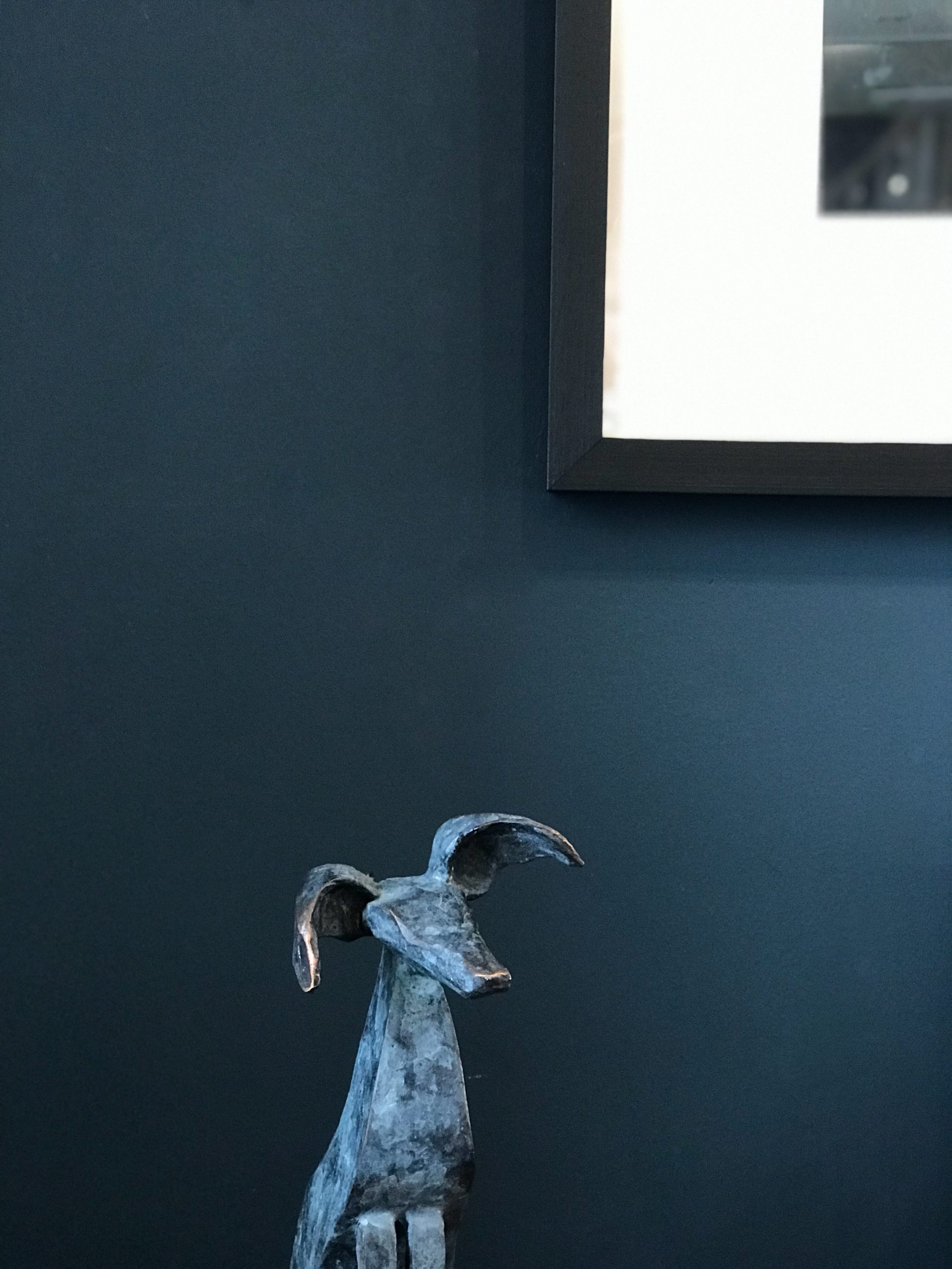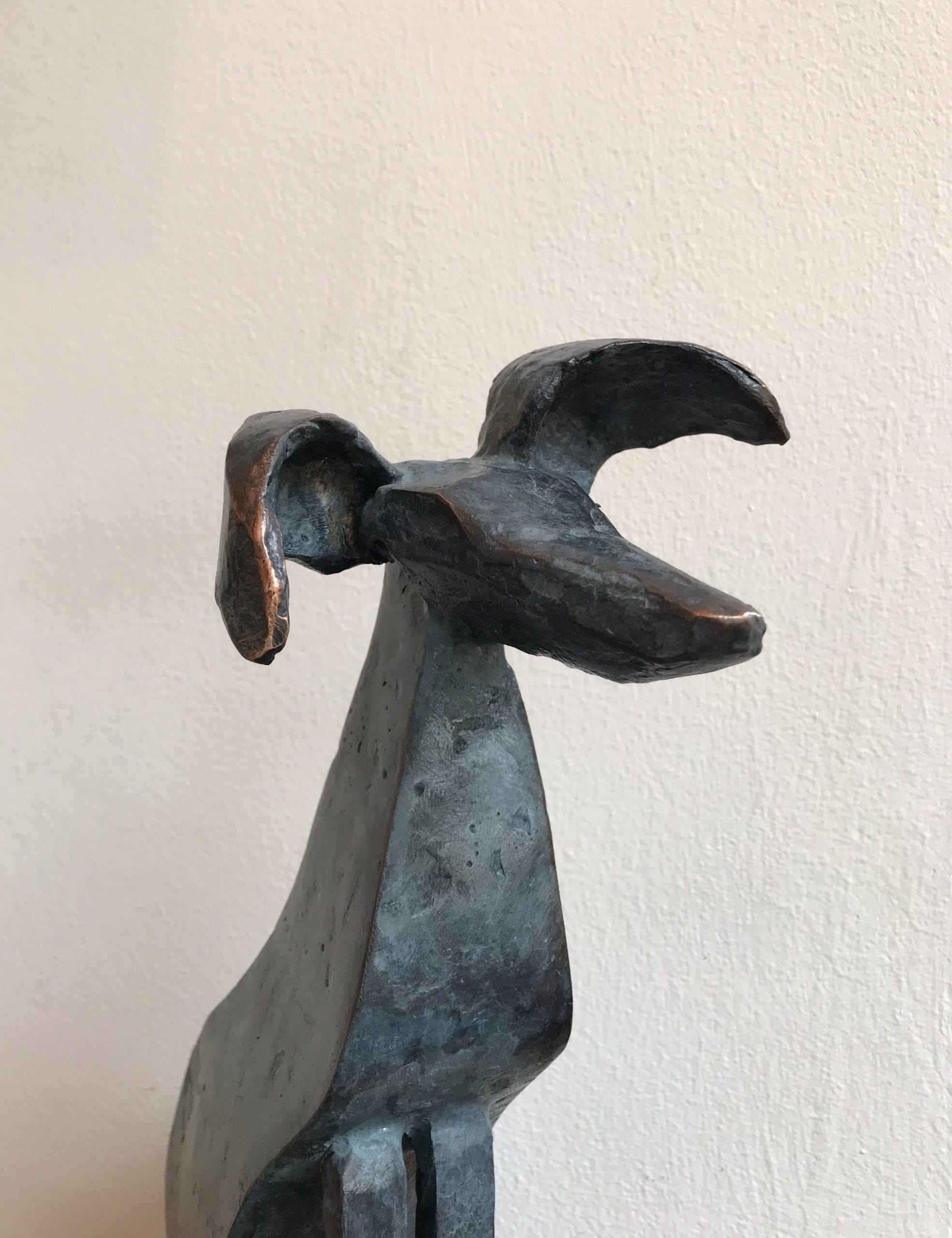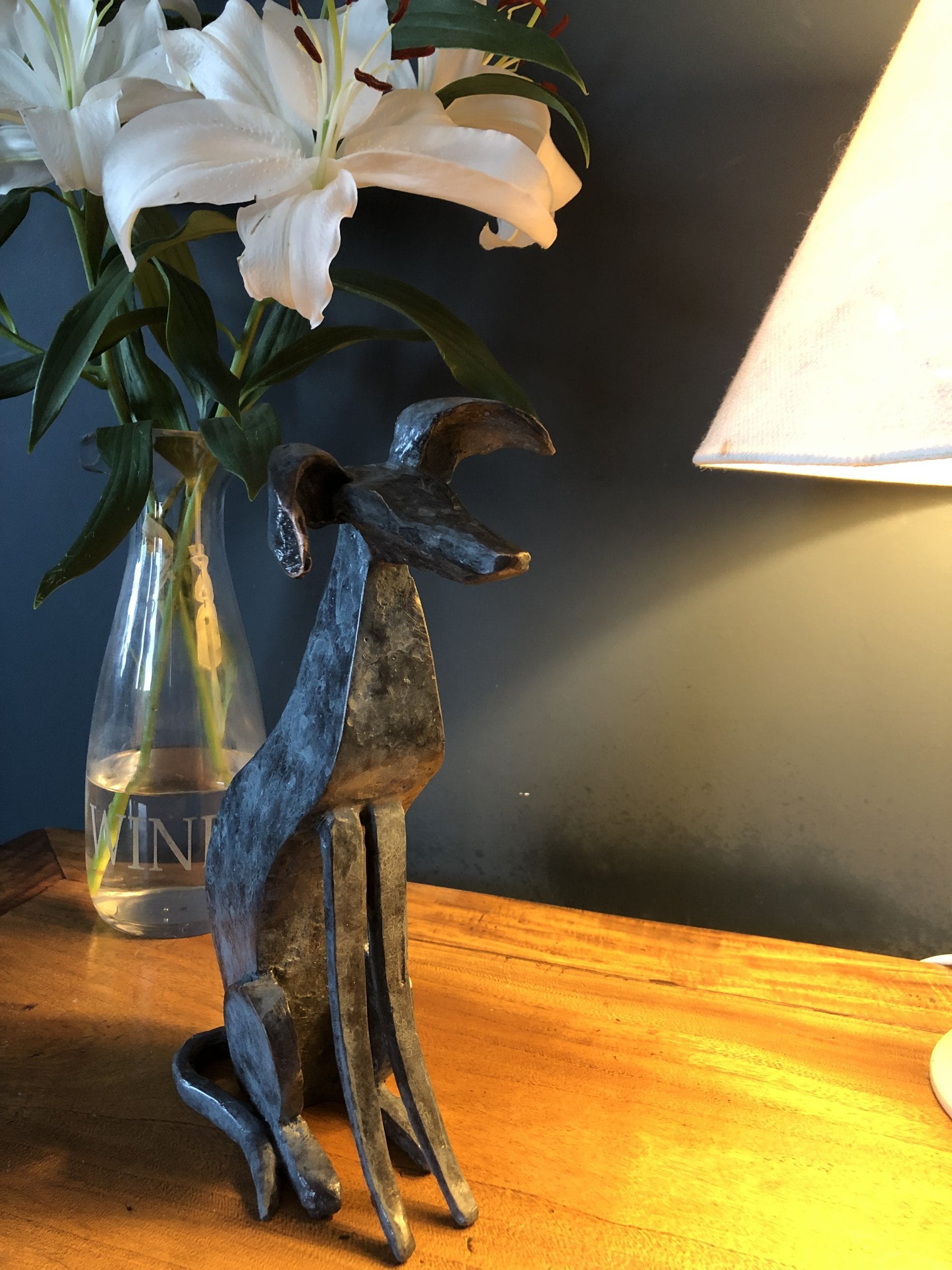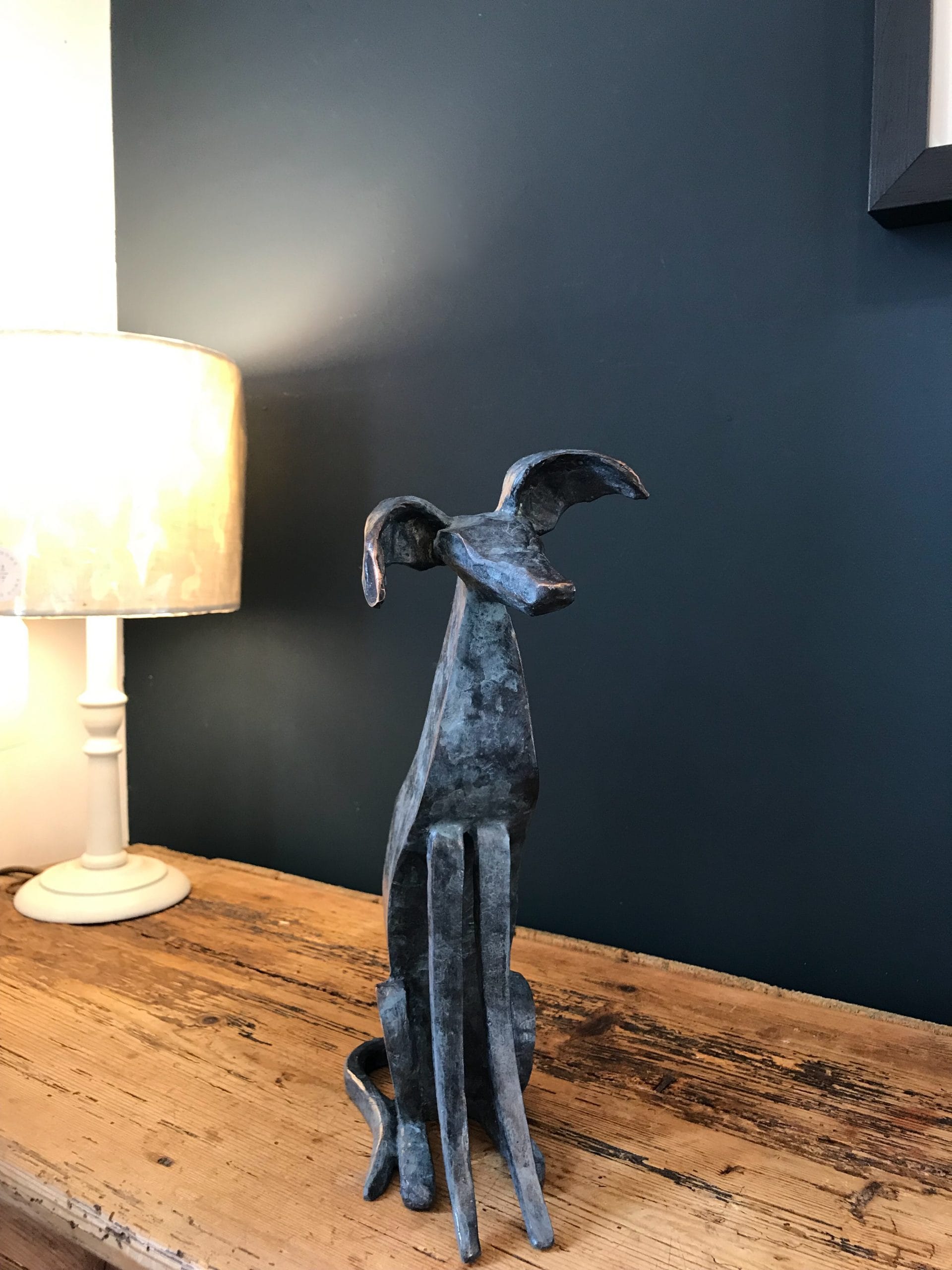 The squeals, oohs and the aahs were audible around the gallery when these adorable sculptures arrived. Cast in bronze, there was the whippet puppy (this one) and also its mammy (a larger, taller and heavier piece) It is safe to say that all the team (and all who were in the building at the time) fell heavily in love with them. This one, the pup, is a fully 3-dimensional piece and is a sight to behold. With its tilted face, cocked whippet ears and stunningly cute stance, you just want to immediately bring him home with you. Another fabulous Connolly piece, sculpted and cast in his own foundries here in West Clare, it is clear that Seamus himself is an animal lover as he never fails to bring his heart out in these gorgeously stylized sculptures.