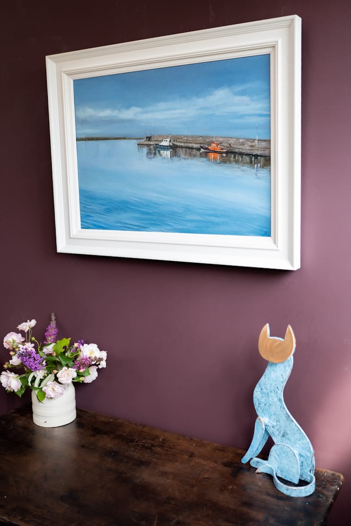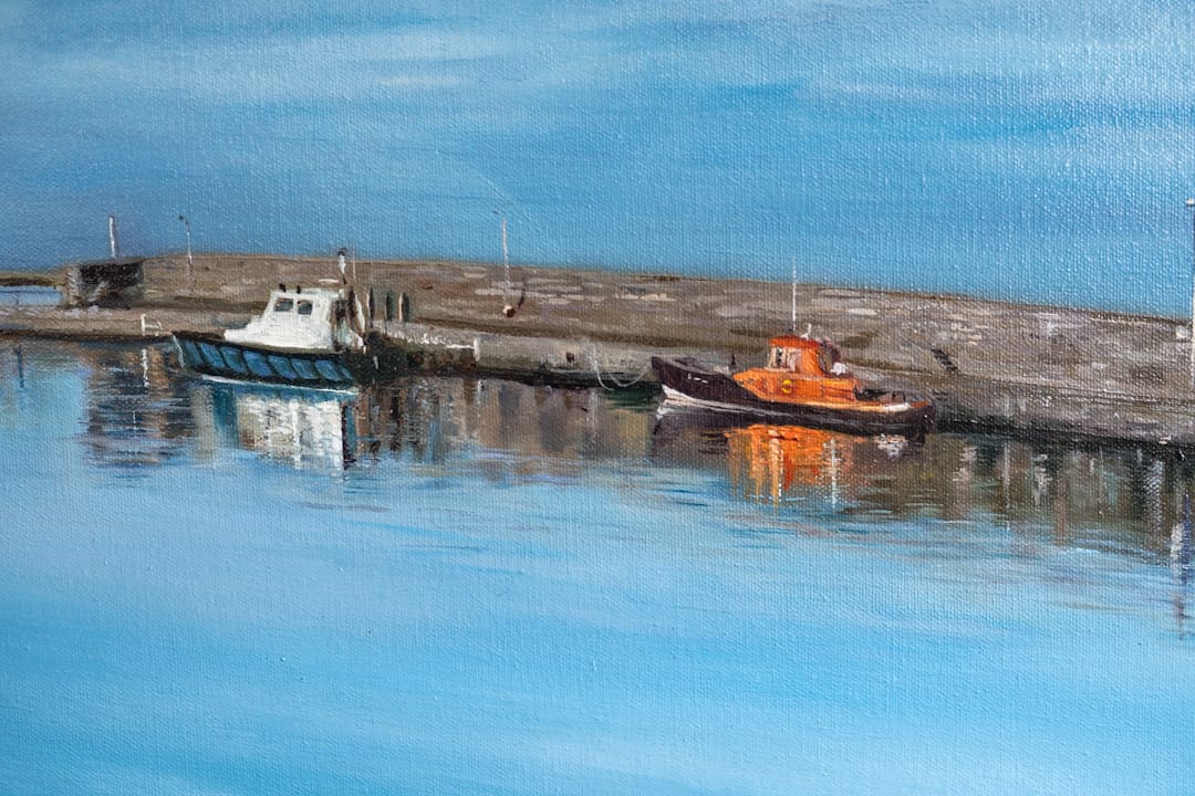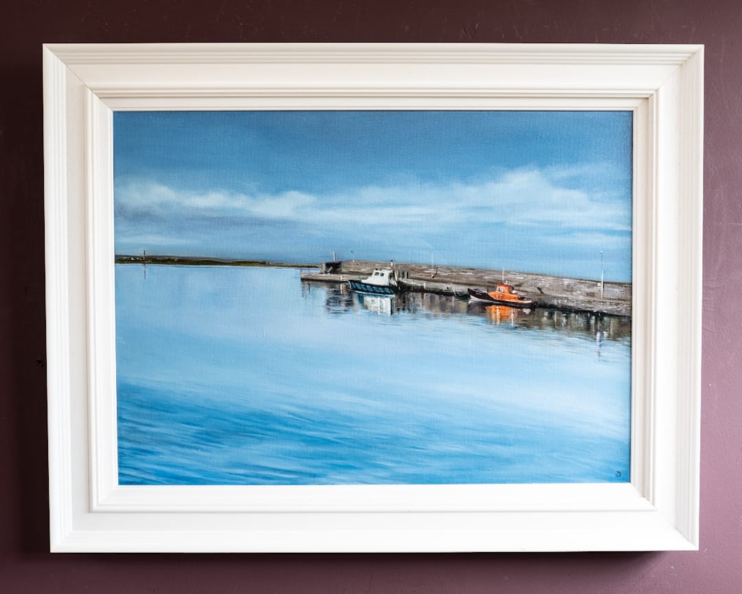 Painting some of their favourite places to be, the West Clare artist signing their work only as ‘D’, has perfectly captured the stillness and the warmth of a hot summers day at Cappa Pier. As was evident during one of our more recent mini heat waves, we sometimes are lucky enough to experience days like this in the West of Ireland, where the sky and the sea are so blue and so clear, that they almost become one – broken only by the horizon in the distance and enhanced by the boats bobbing gently on the lapping tide.