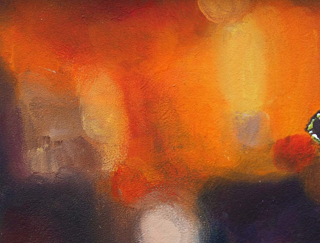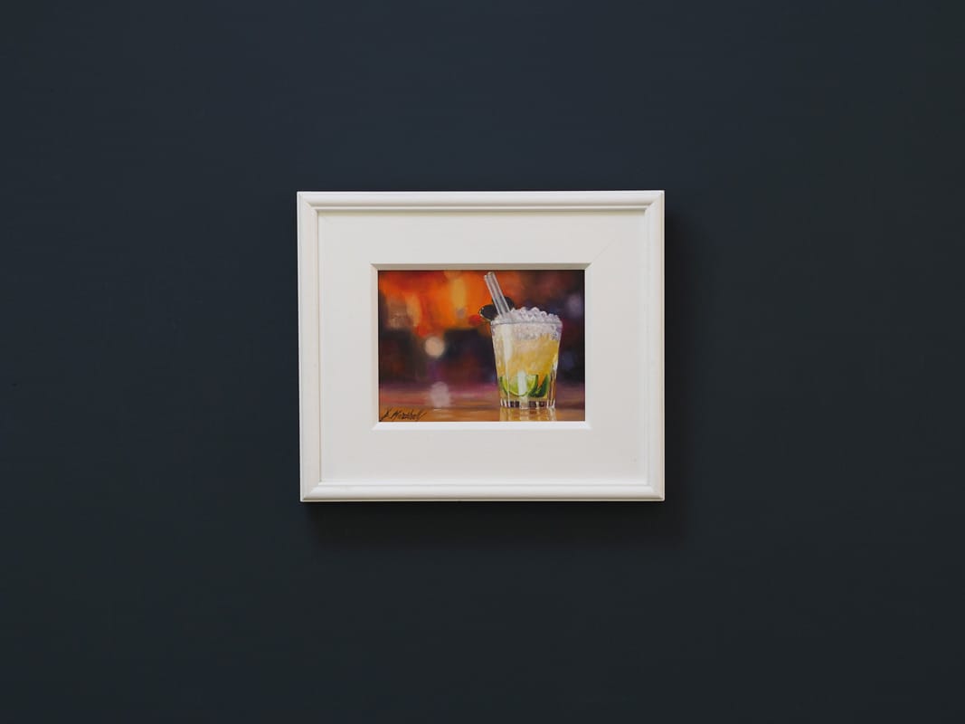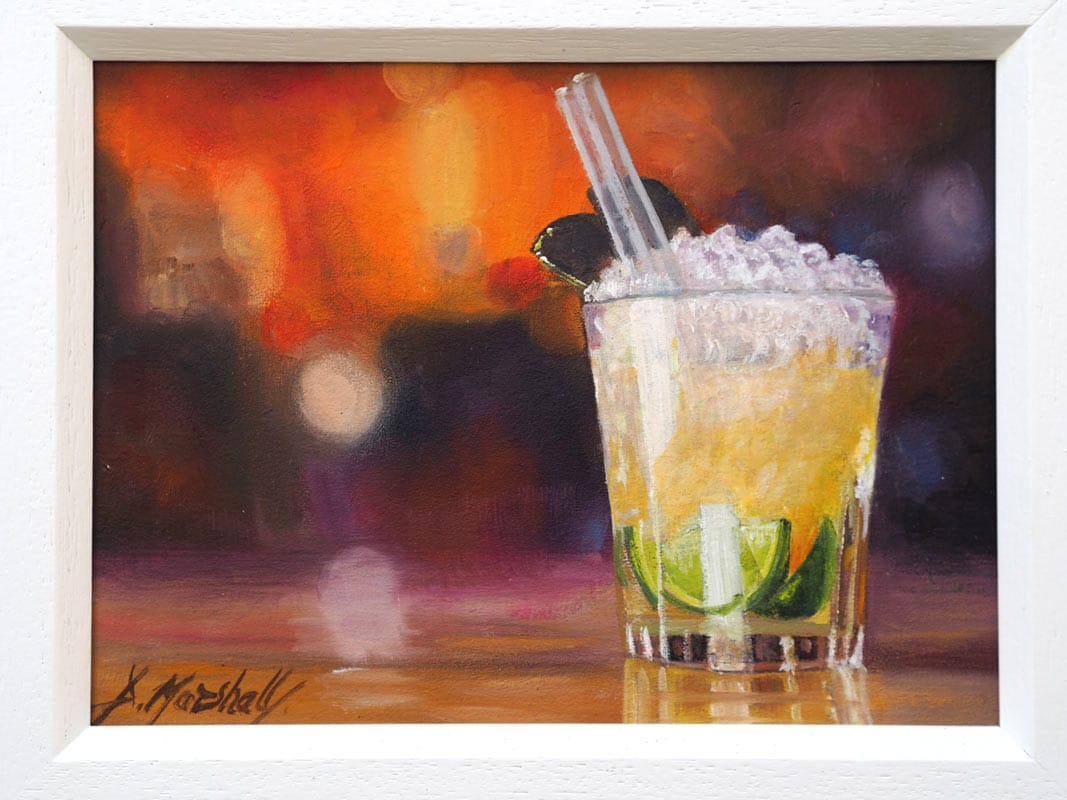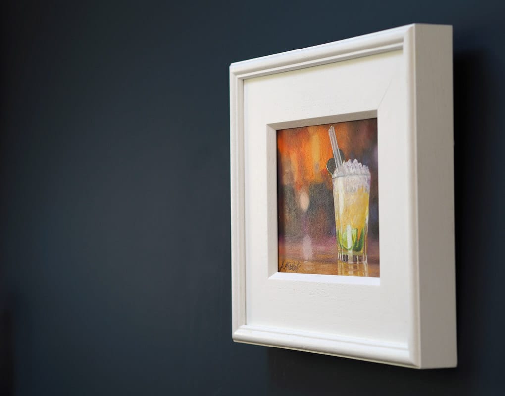 This small but perfectly formed still life oil painting by Diana Marshall would bring a gorgeous little splash of colour and interest to an office or study or maybe to a contemporary sitting room space. With a beautiful melding of background colours that manage to suggest a vibrant cityscape; you could be having the night of your life with friends, or perhaps you are sitting with your thoughts in a more reflective mood, watching the world go by, with that refreshing cocktail waiting to be enjoyed. Either way, a fabulous still life and at a favourable price point.