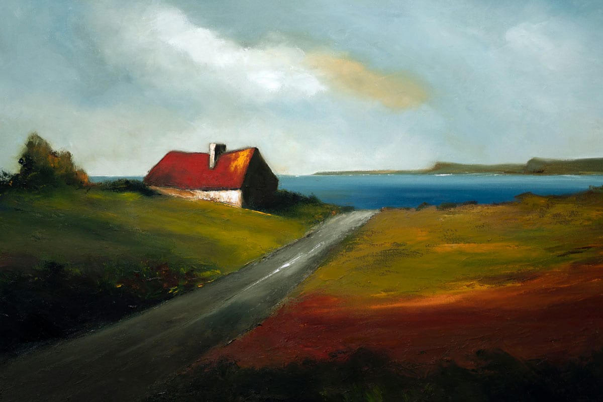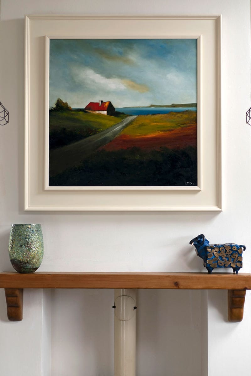 Going Home was certainly made all the more difficult and more poignant this year, in a prolonged period fraught with global restrictions. Padraig McCaul, whose soulful oils on canvas hit a nostalgic note for people everywhere, has produced this large, super impressive, metre x metre artwork, of the road home to the West of Ireland. That familiar cottage with its red tin roof and the welcoming sight of the sea ahead of you. Going Home is a painting to remind us of the importance of those very special moments and indeed places in our lives.