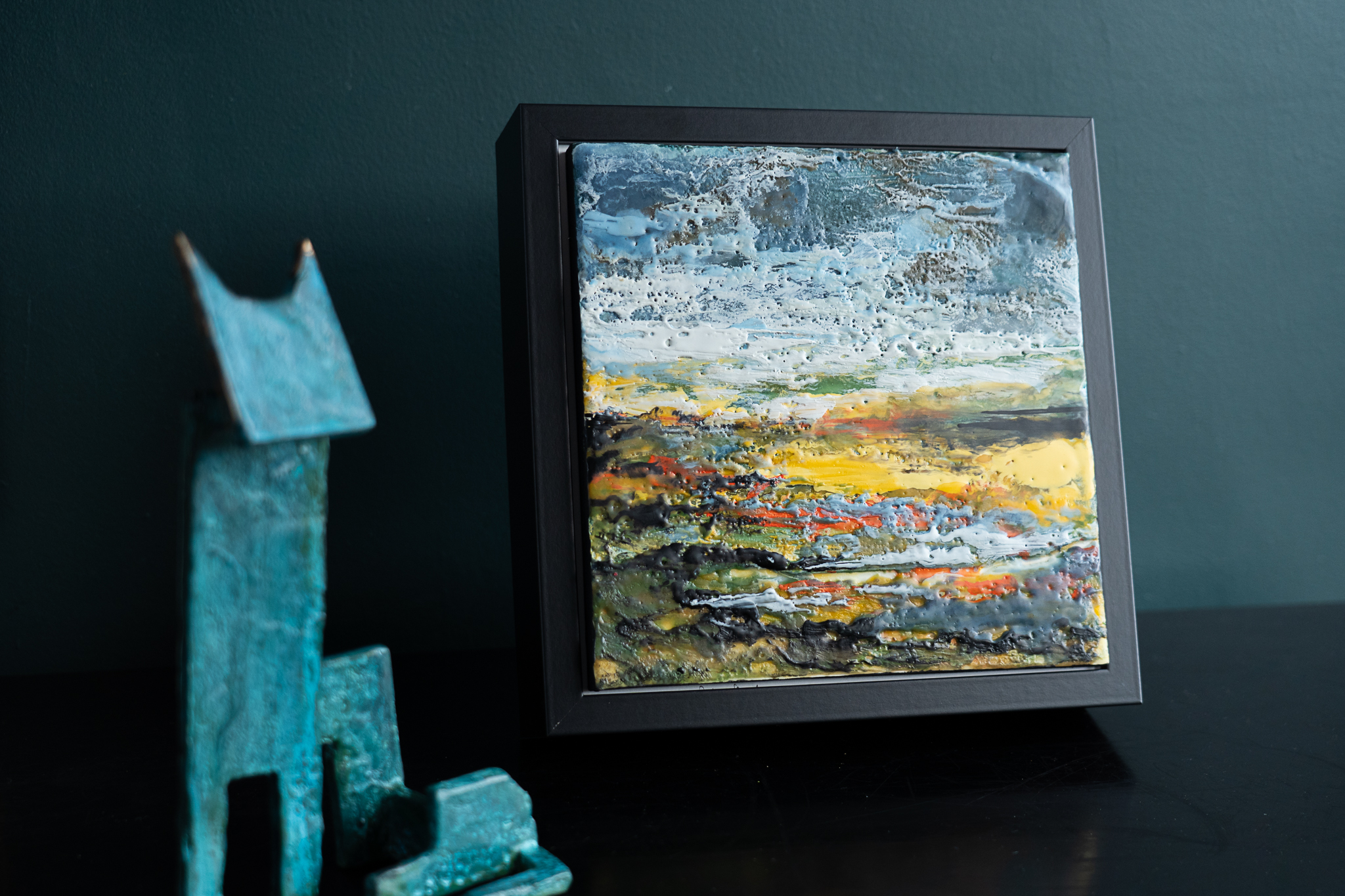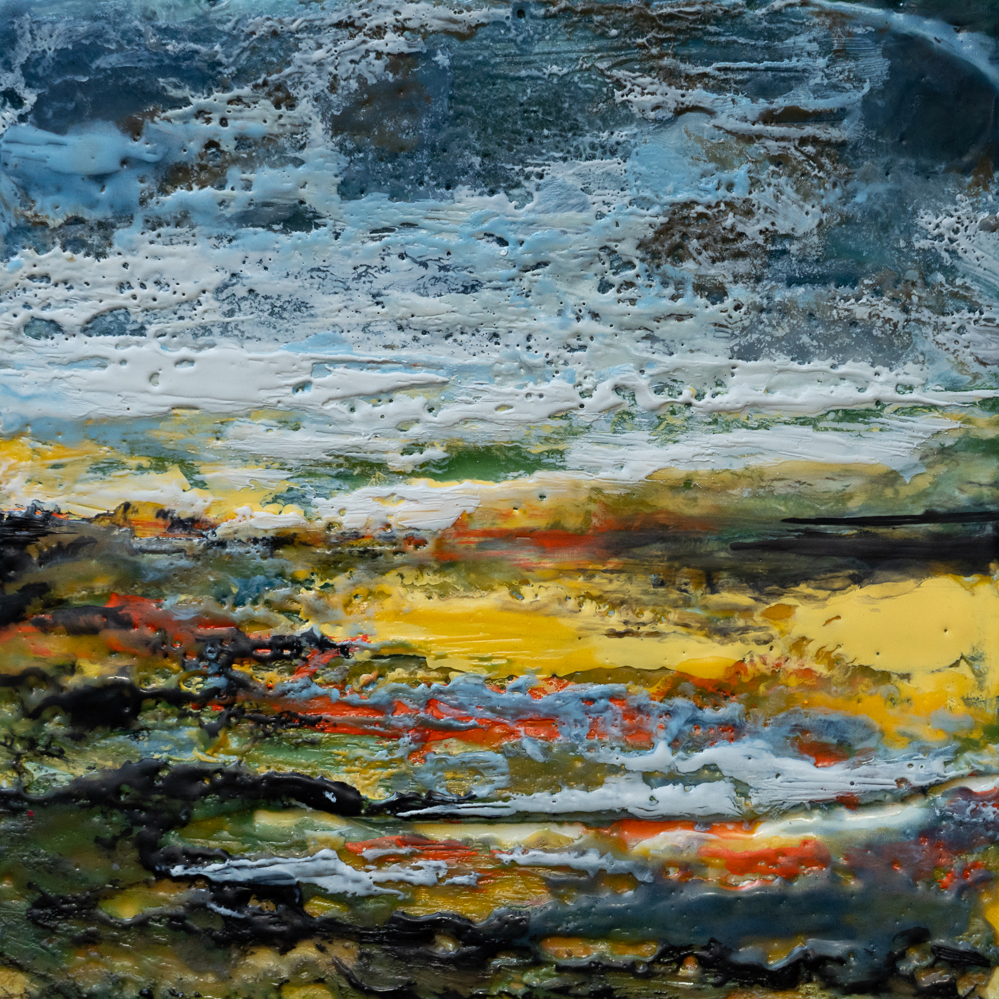 Encaustic Art is an ancient medium using molten pigmented beeswax. It’s an immediate and tactile method of painting, as when the layers of wax are laid, using a blow torch, the effect is dramatic and immediate.