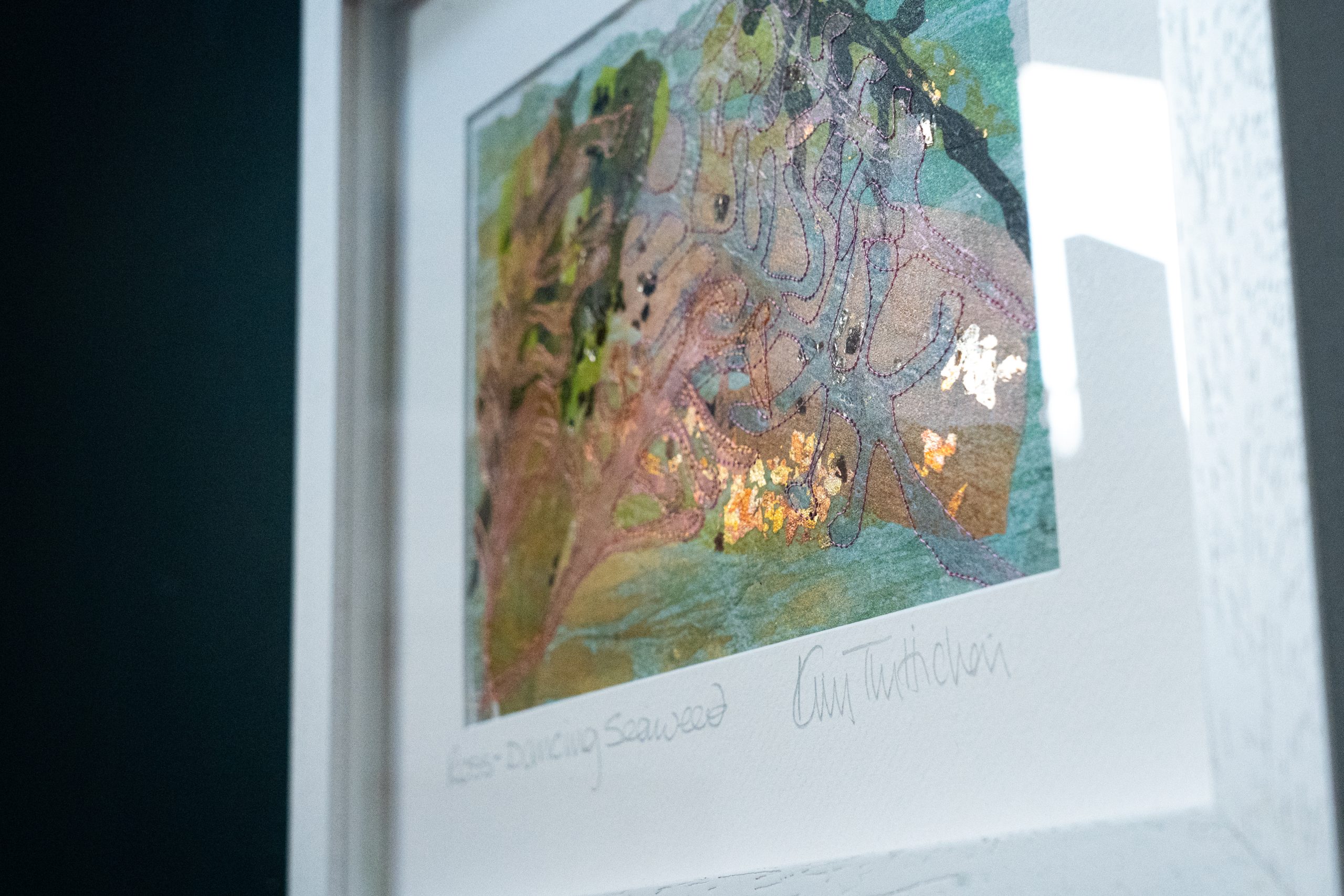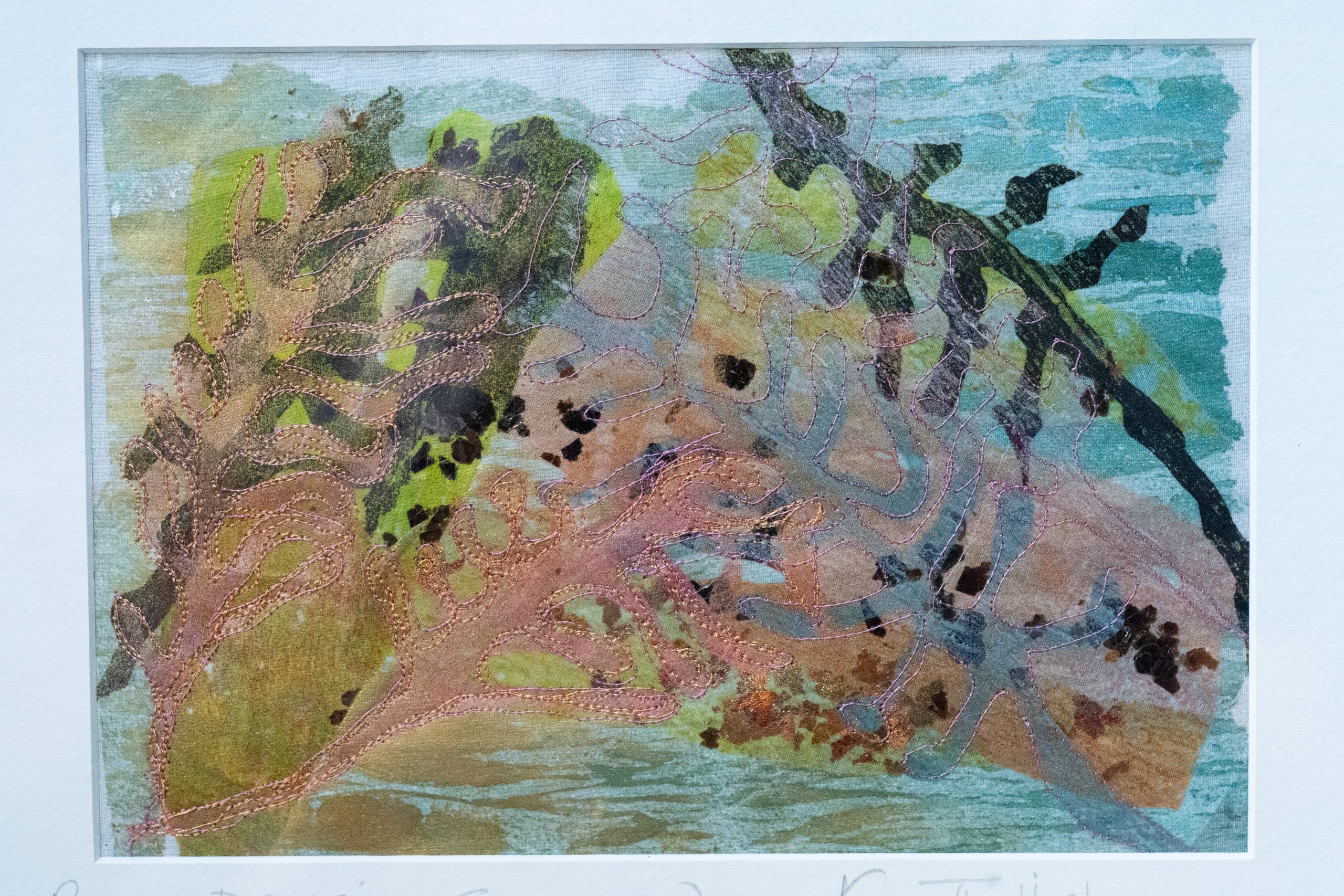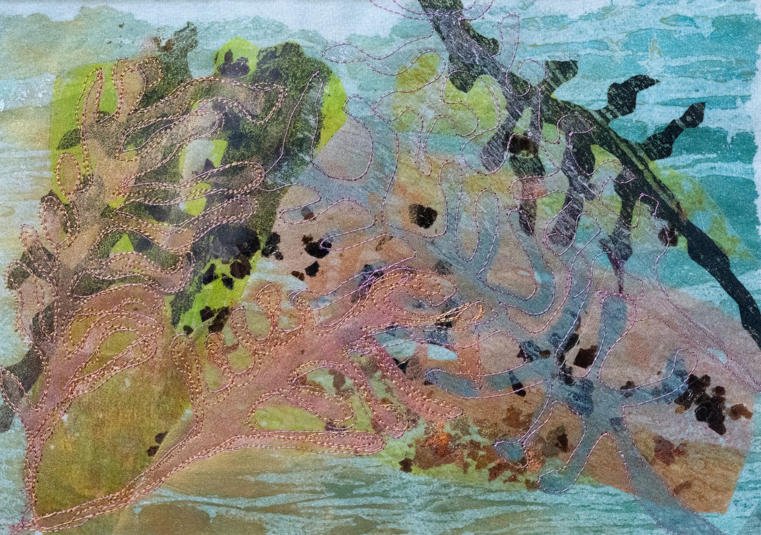 Using a combination of painted fusible web and hand and machine stitched materials, this gorgeous piece of art depicts a piece of seaweed from Ross Bay. Using a rather beautiful and delicate colour palette, this piece feels very rustic and lovely.