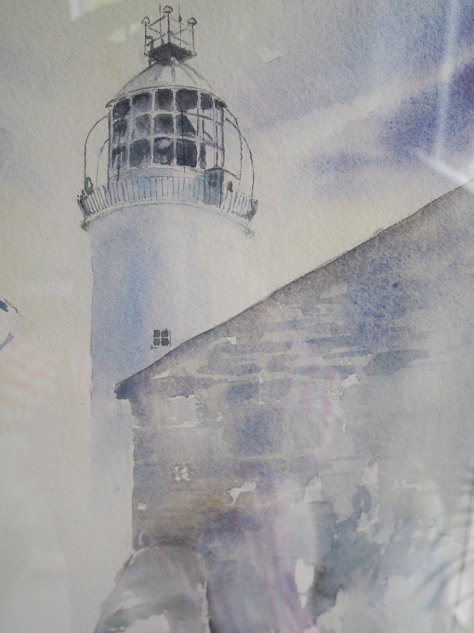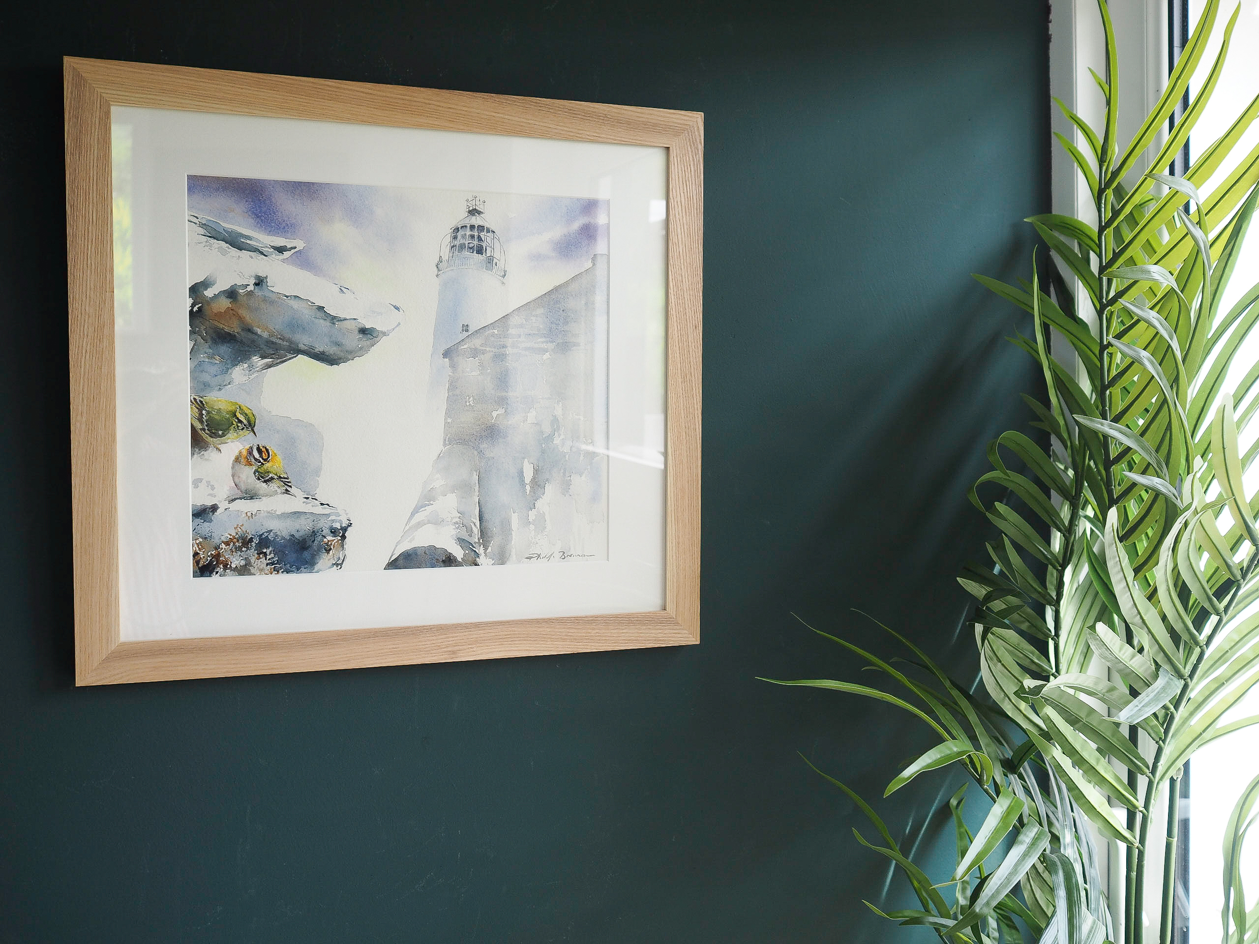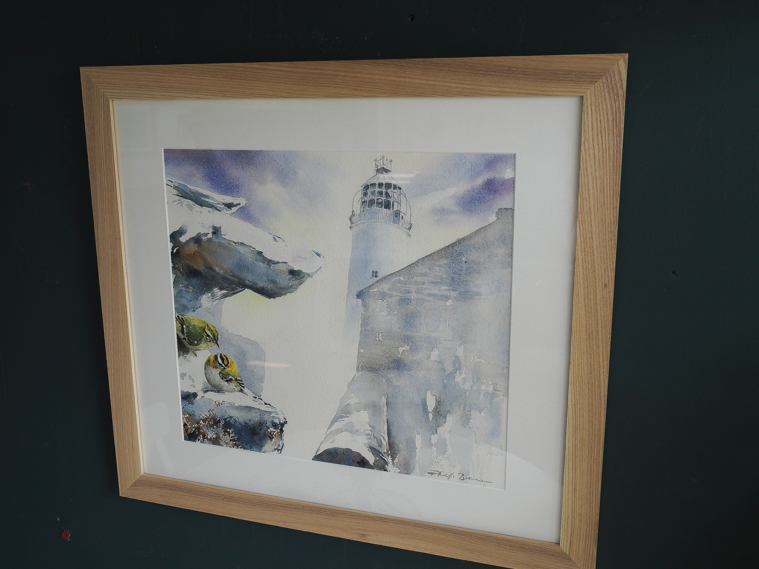 A beautiful hand, a delicate touch and gorgeously handled details by the artist Phil Brennan. This is an original watercolour painting of two dawn migrants (a Brown Warbler and a Firecrest) sitting, resting, tucked into the stonework, under the shelter from the Loop Head lighthouse. A beautifully detailed piece of work.
