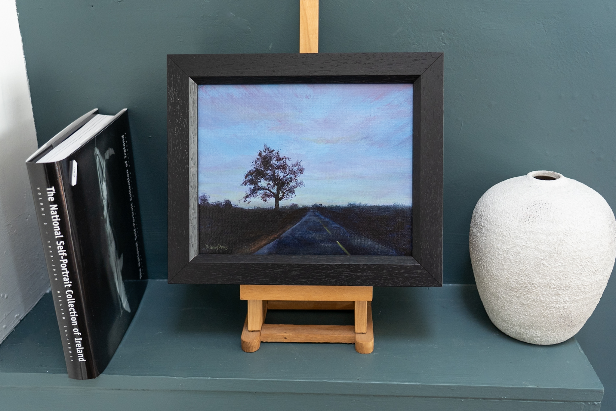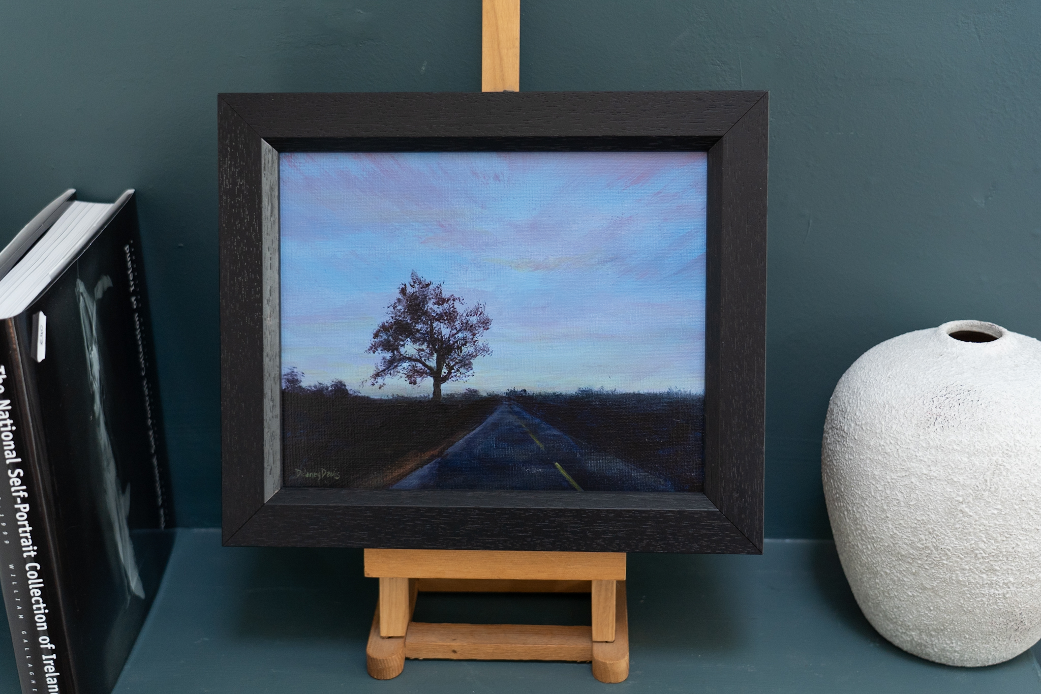 The beauty of a drive at dawn, when the twilight of morning begins to gently illuminate the road ahead. The shadows of the landscape and the silhouette of the passing trees, a reminder that the night is not yet fully over. Another beautiful scene by contemporary artist Delaney Davis.