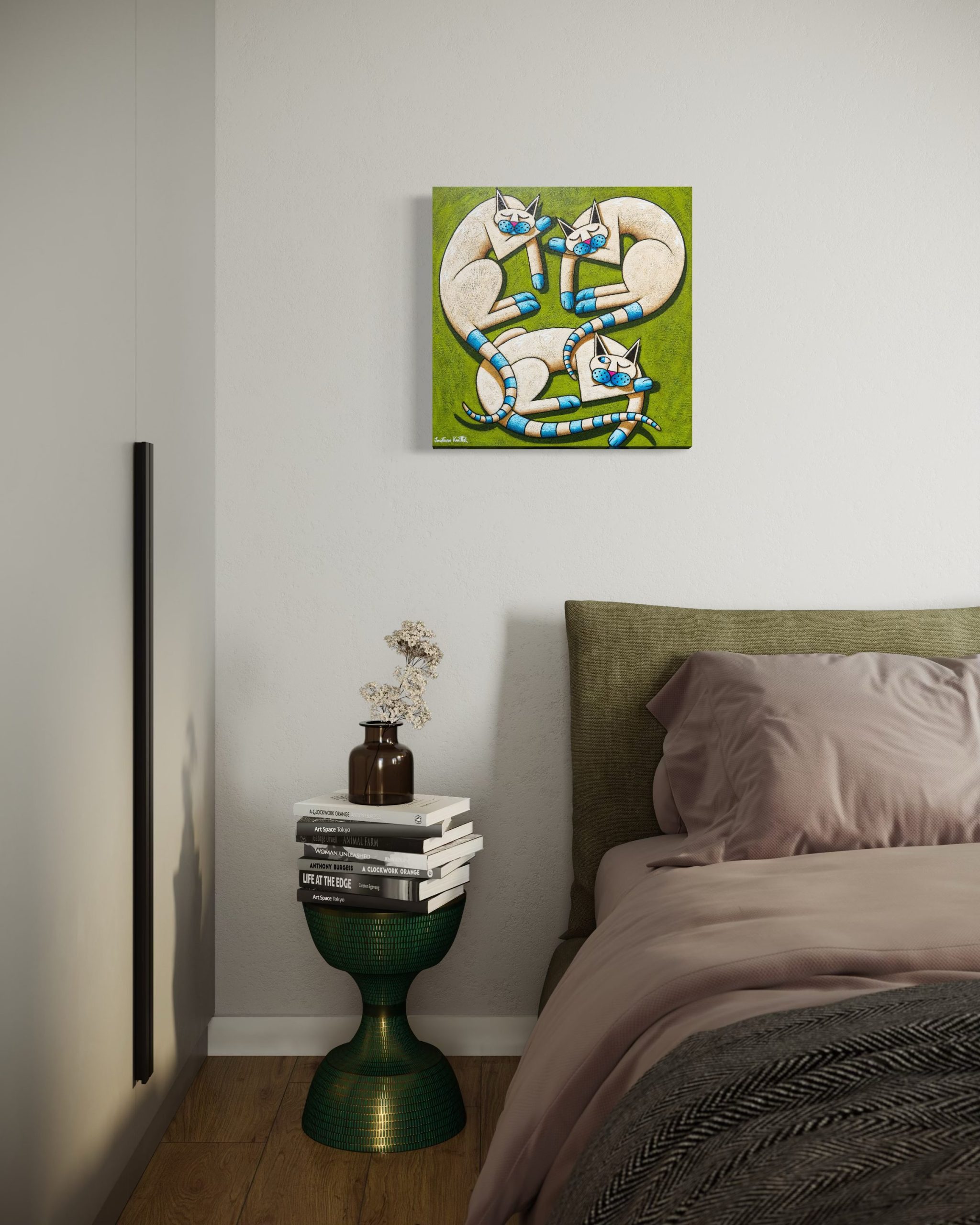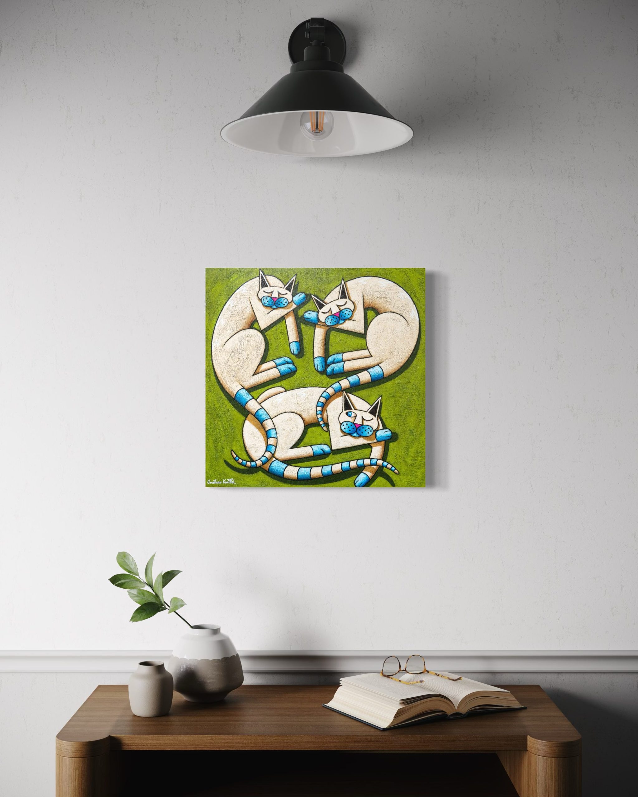 Employing what one might describe as a version of surrealism – Knuttel appears to be challenging the perceptions of reality through the use of exaggerated caricature styles, fun compositions and vivid colours. His original pieces, are distinctive, bright and uplifting.