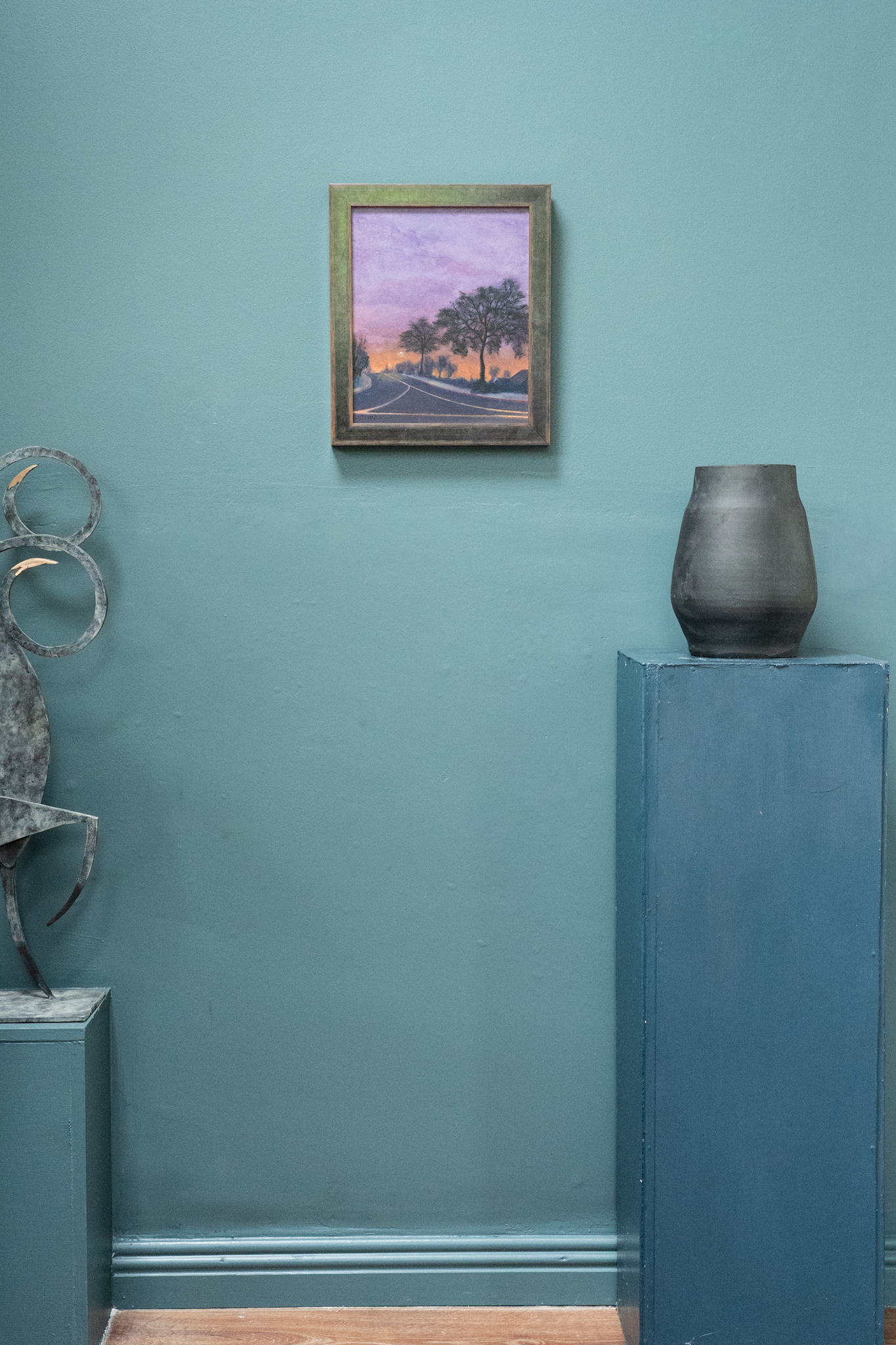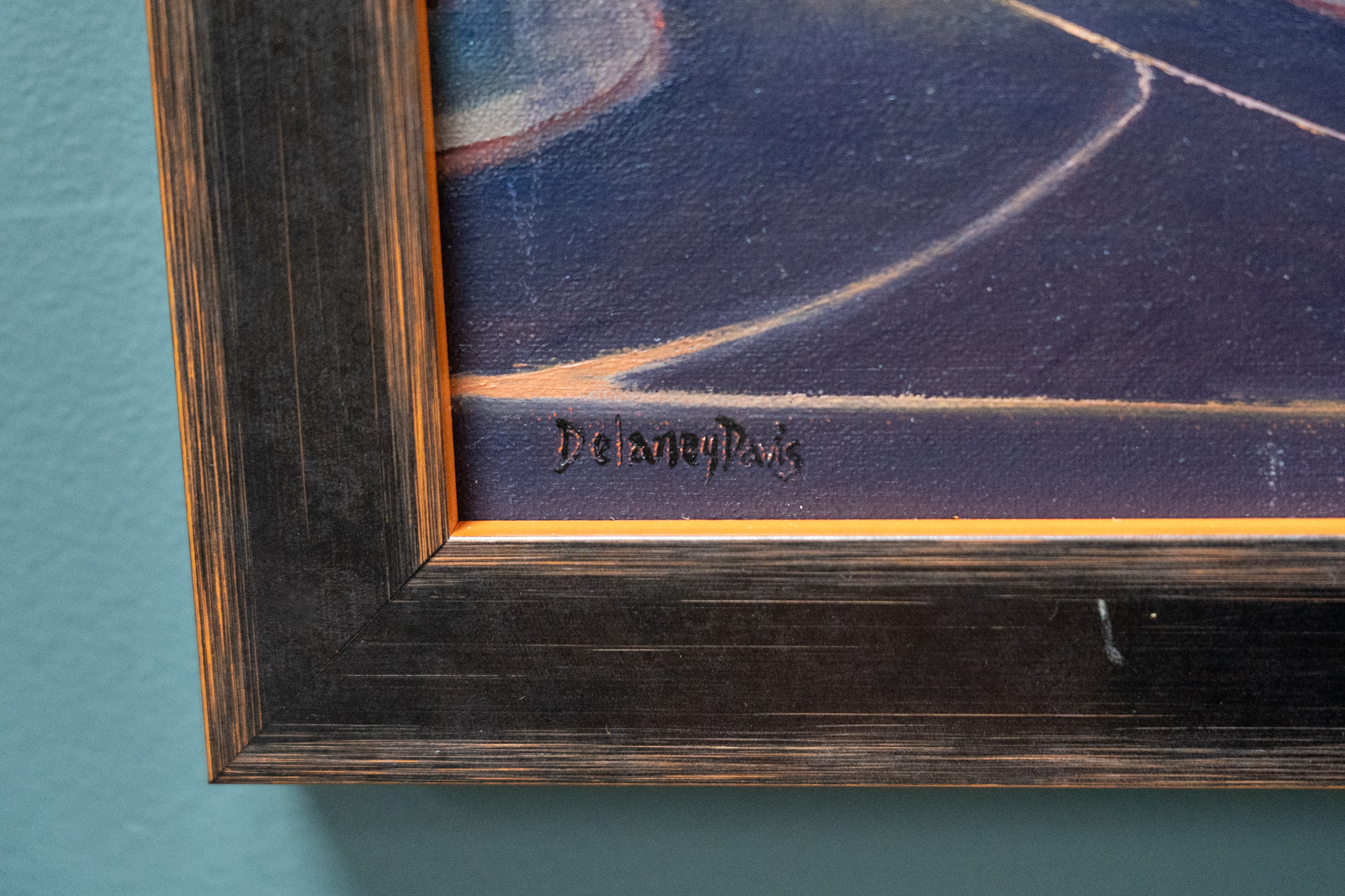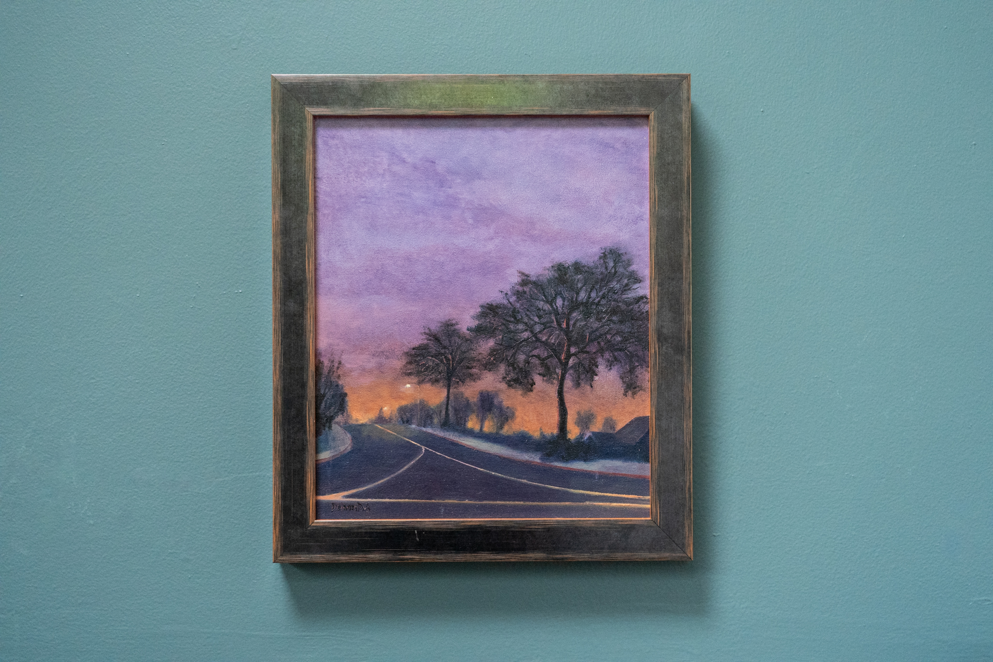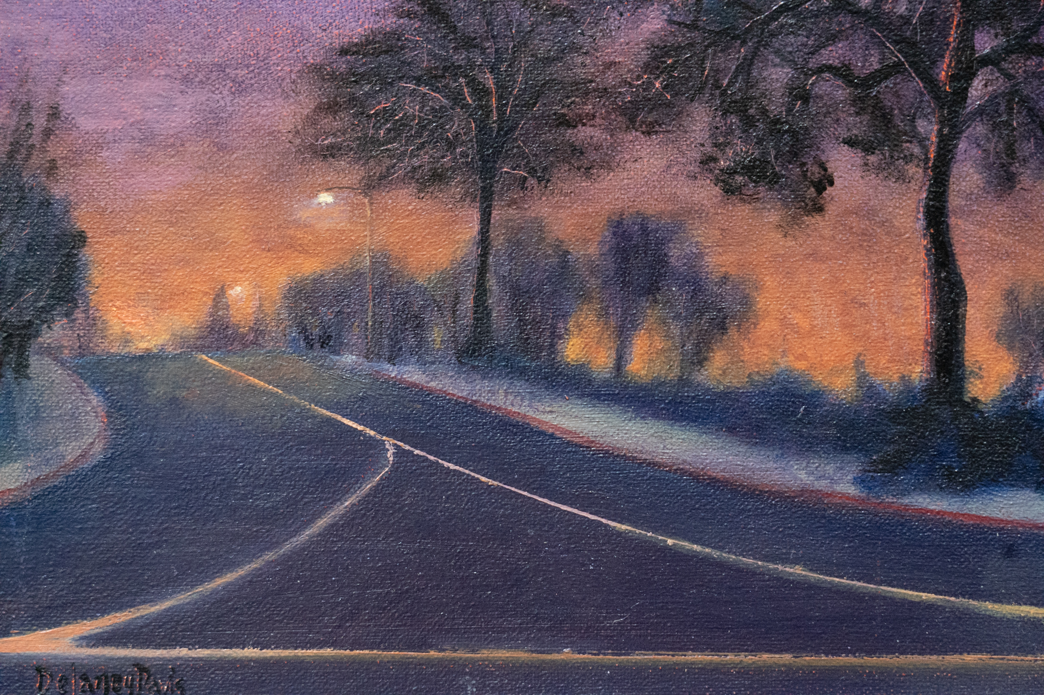 Gorgeous, lavender skies, form the backdrop for this Evening Stroll by contemporary artist Delaney Davis. An avenue of trees lines this quiet, urban, street scene by this American Irish contemporary artist – whose work is being chosen by collectors.
