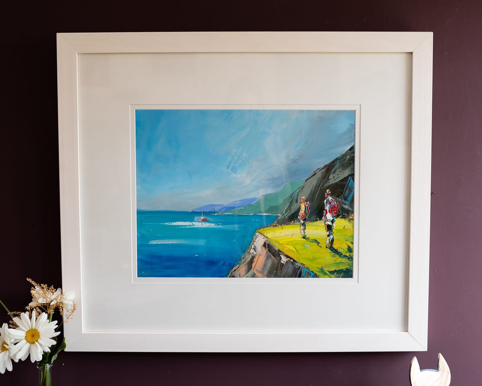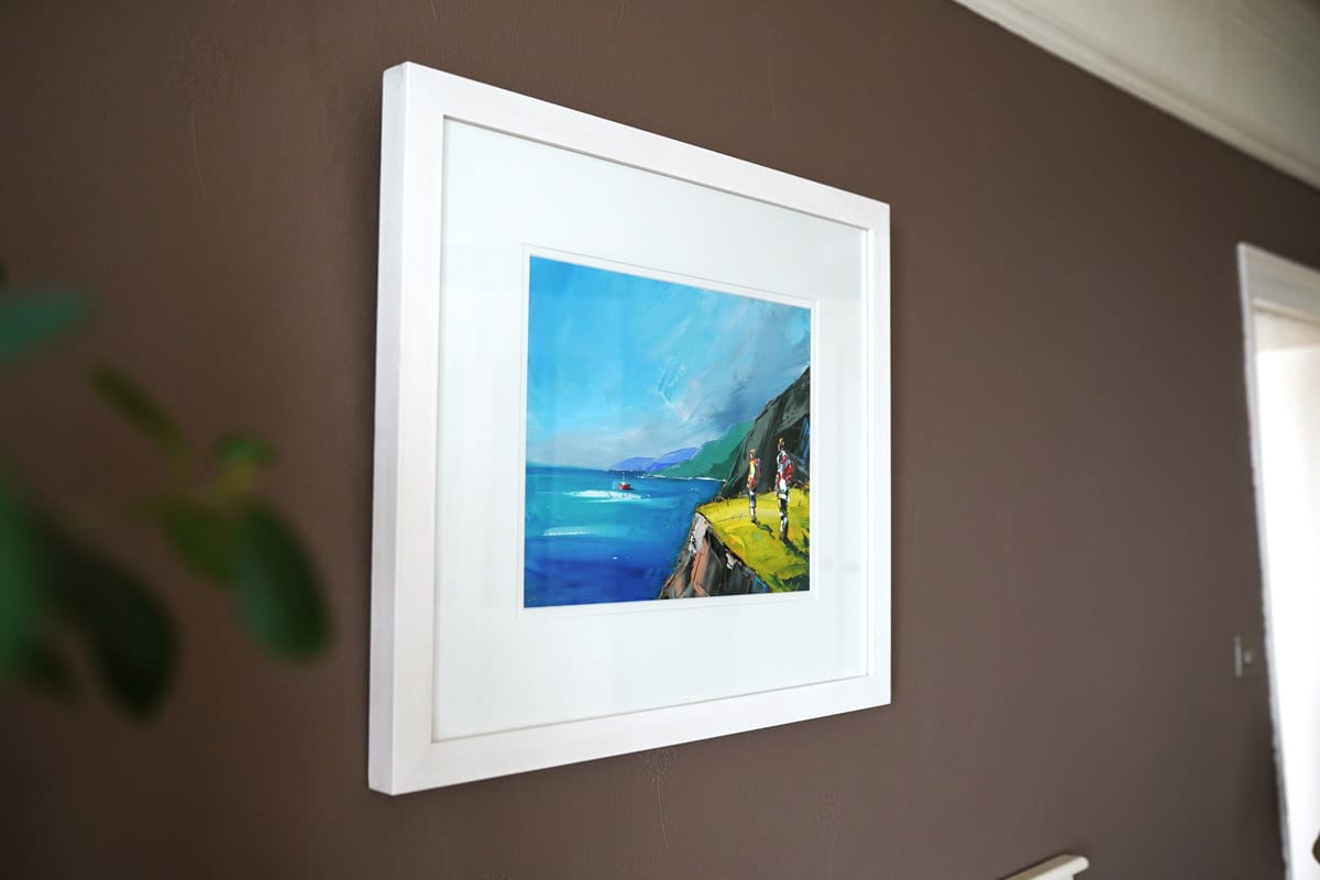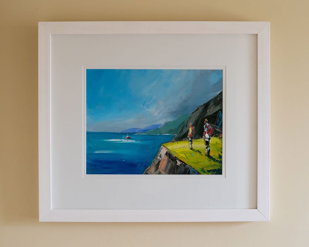 ‘Faraway Fishing’ is a perfect example of how David Coyne can bring summer into your heart at a moments notice. The warmth of the greens used in the foreground, the deep blue of the sea reflecting the warm blue skies and the calm waters allowing the onlookers to watch the trawler in the distance.