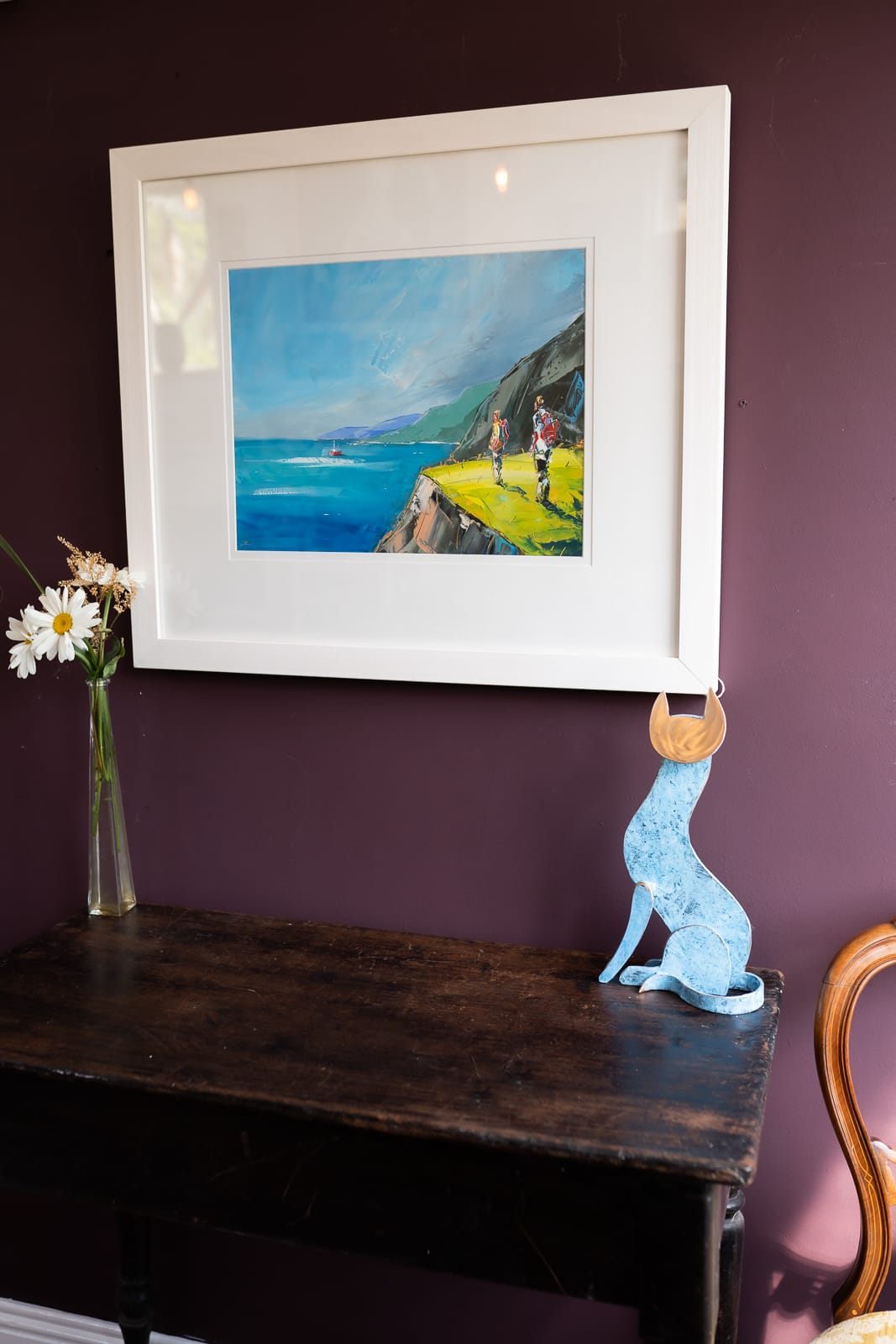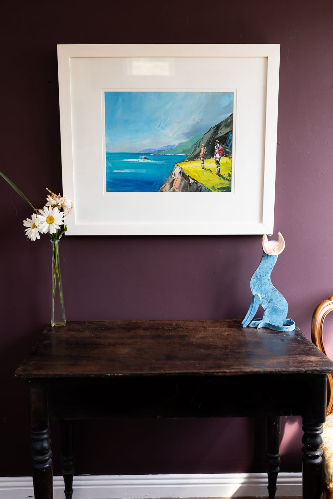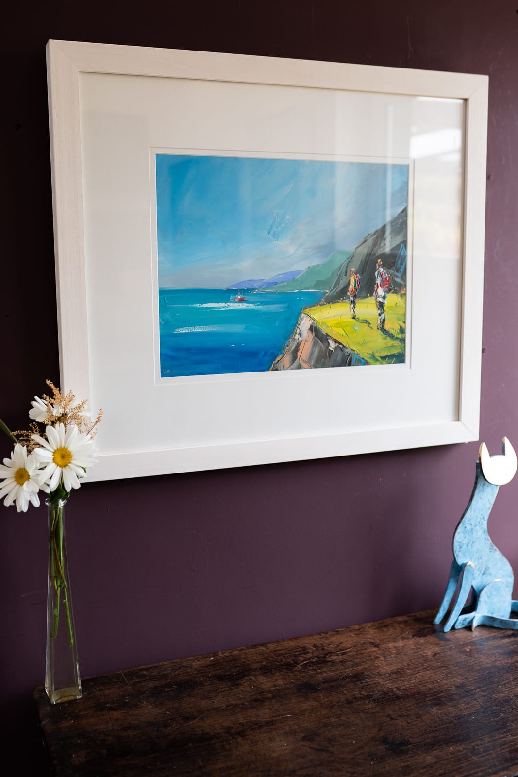 ‘Faraway Fishing’ is a perfect example of how David Coyne can bring summer into your heart at a moments notice. The warmth of the greens used in the foreground, the deep blue of the sea reflecting the warm blue skies and the calm waters allowing the onlookers to watch the trawler in the distance.