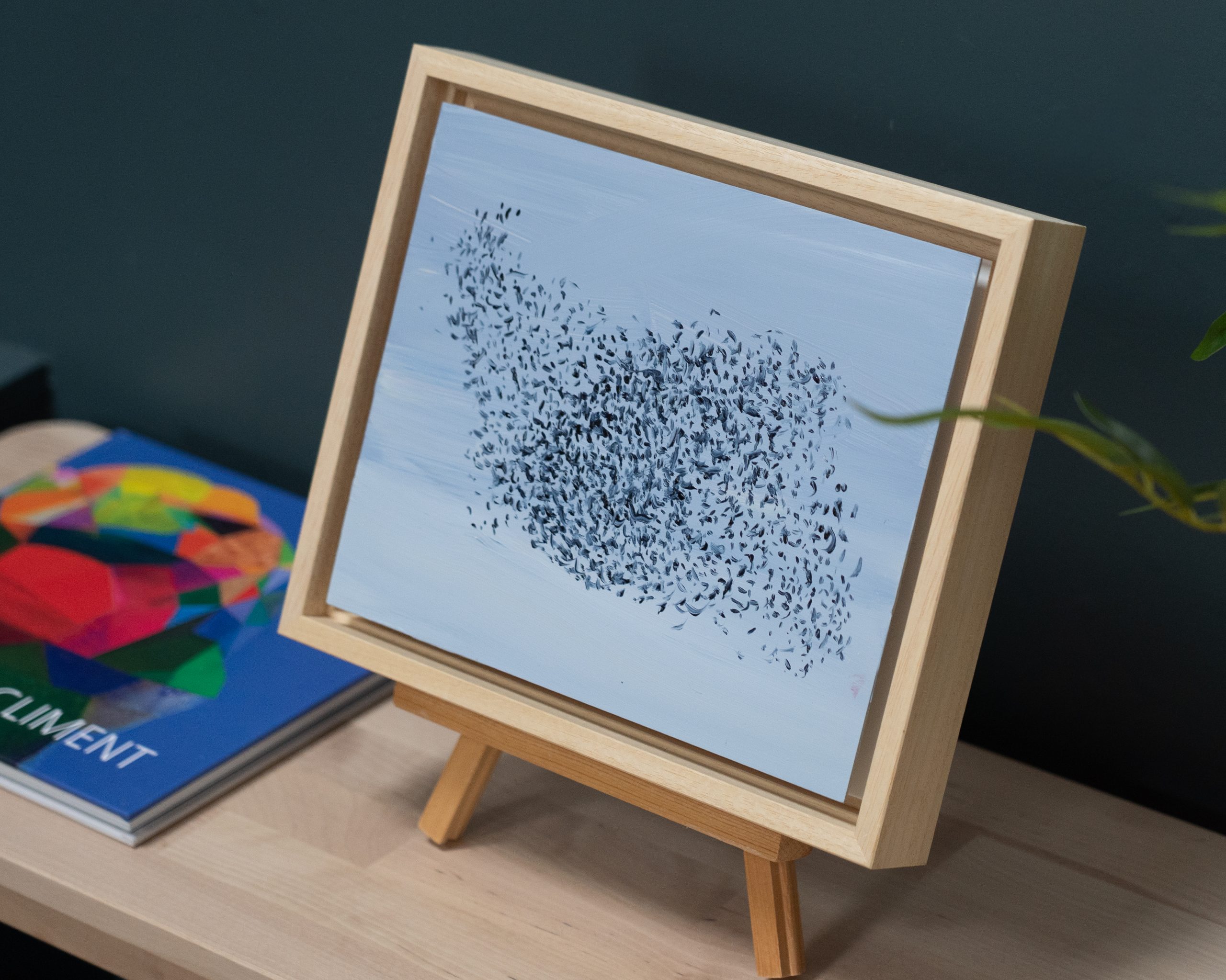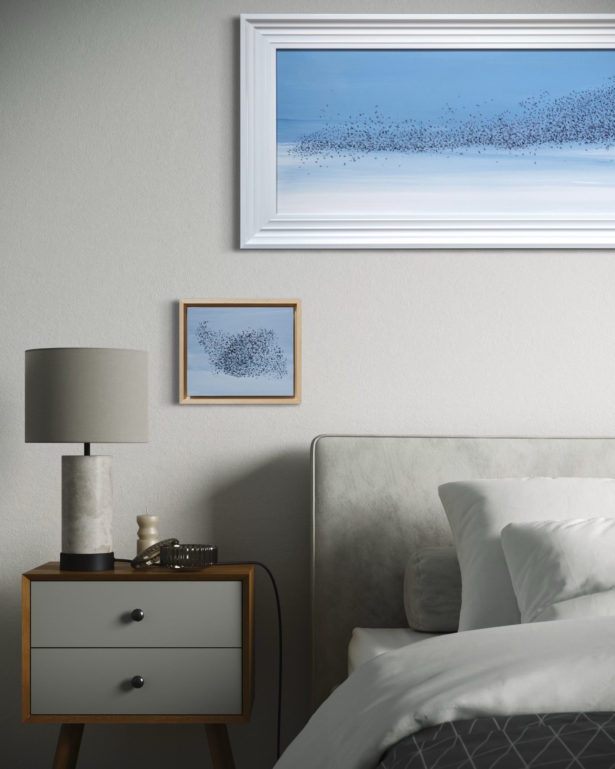 The seasons ‘First Murmuration’ of starlings – beautifully depicted in oils, against a striking blue sky – by artist Kaye Maahs.