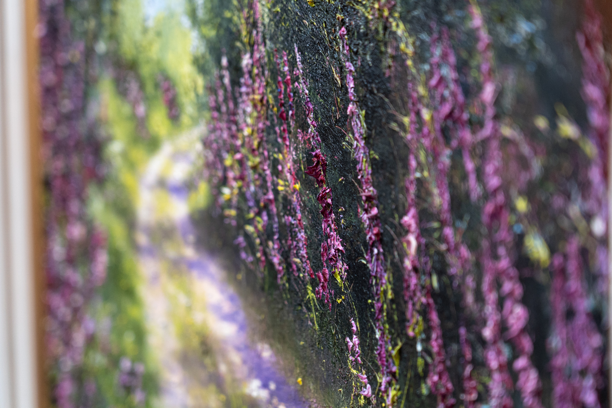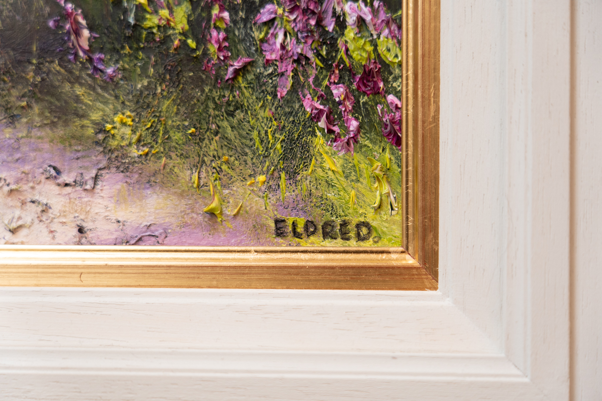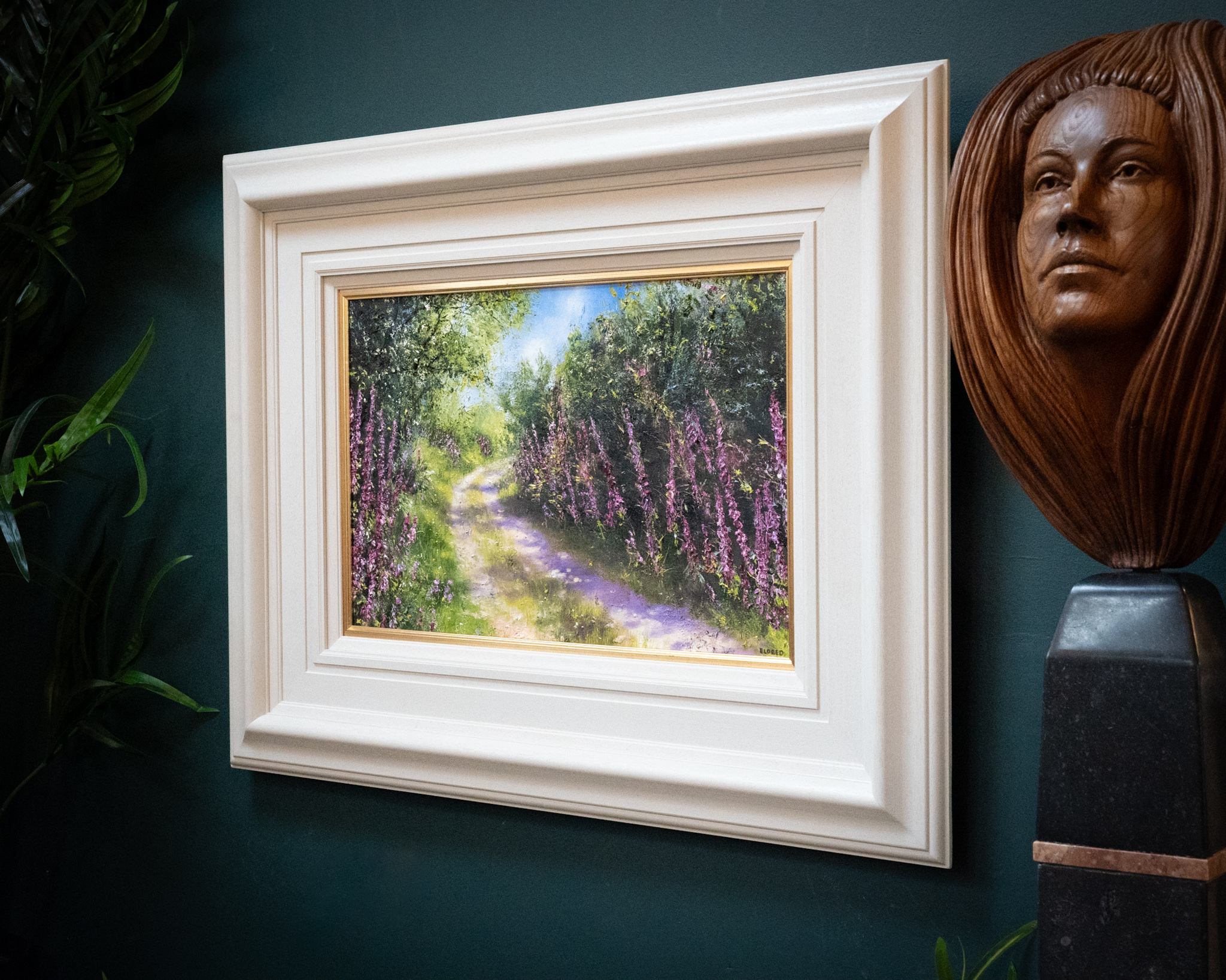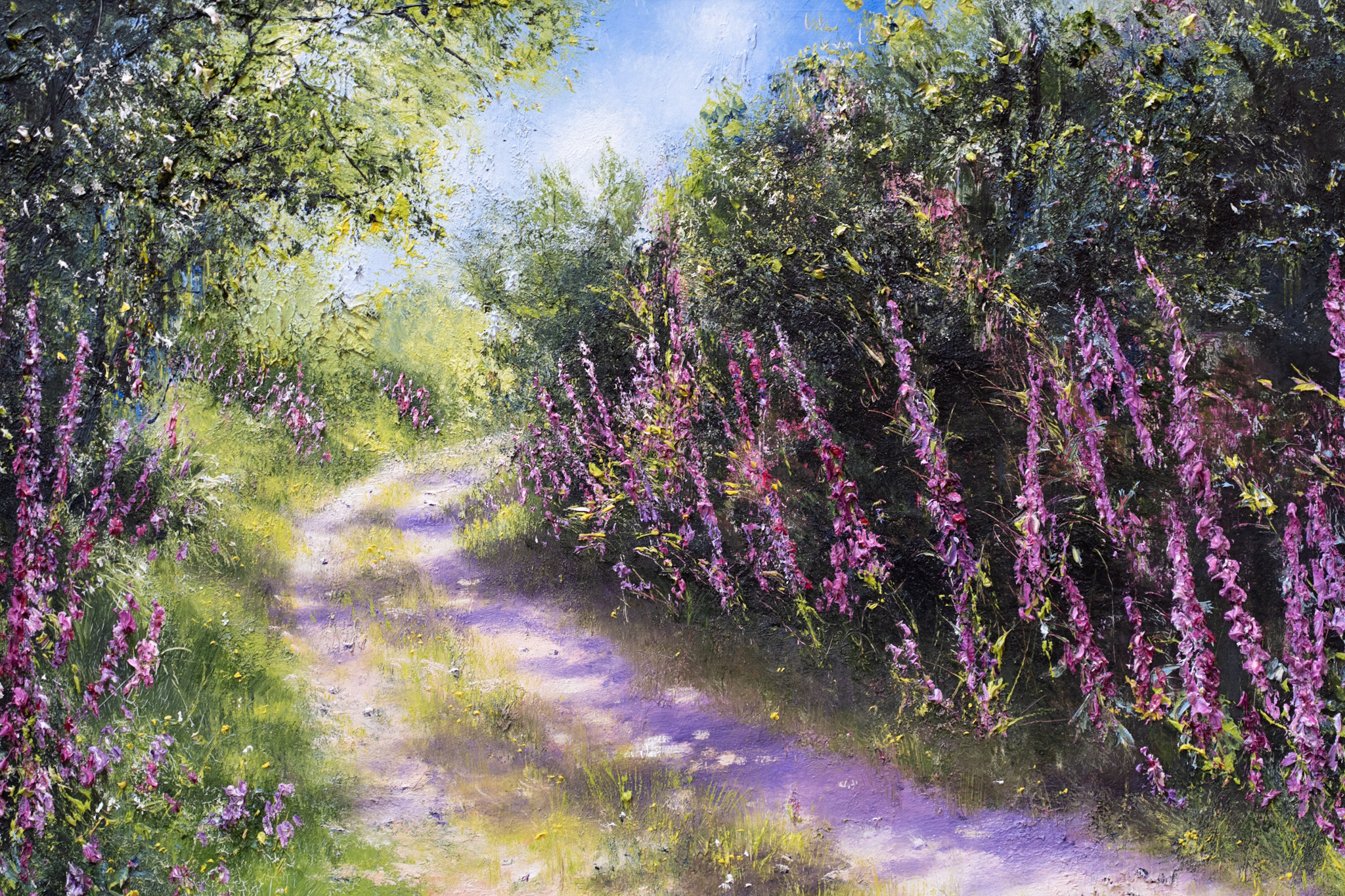 The beautiful and instantly recognisable hand of artist Mark Eldred; a true master of oils. His knowledge of colour and his ability to use light to bring a sense of life, of warmth and of depth to his work, is unparalleled. This beautiful scene, of a country lane (or bóthairín) lined by the colourful embrace of the most foxglove wildflowers, is truly breath-taking.