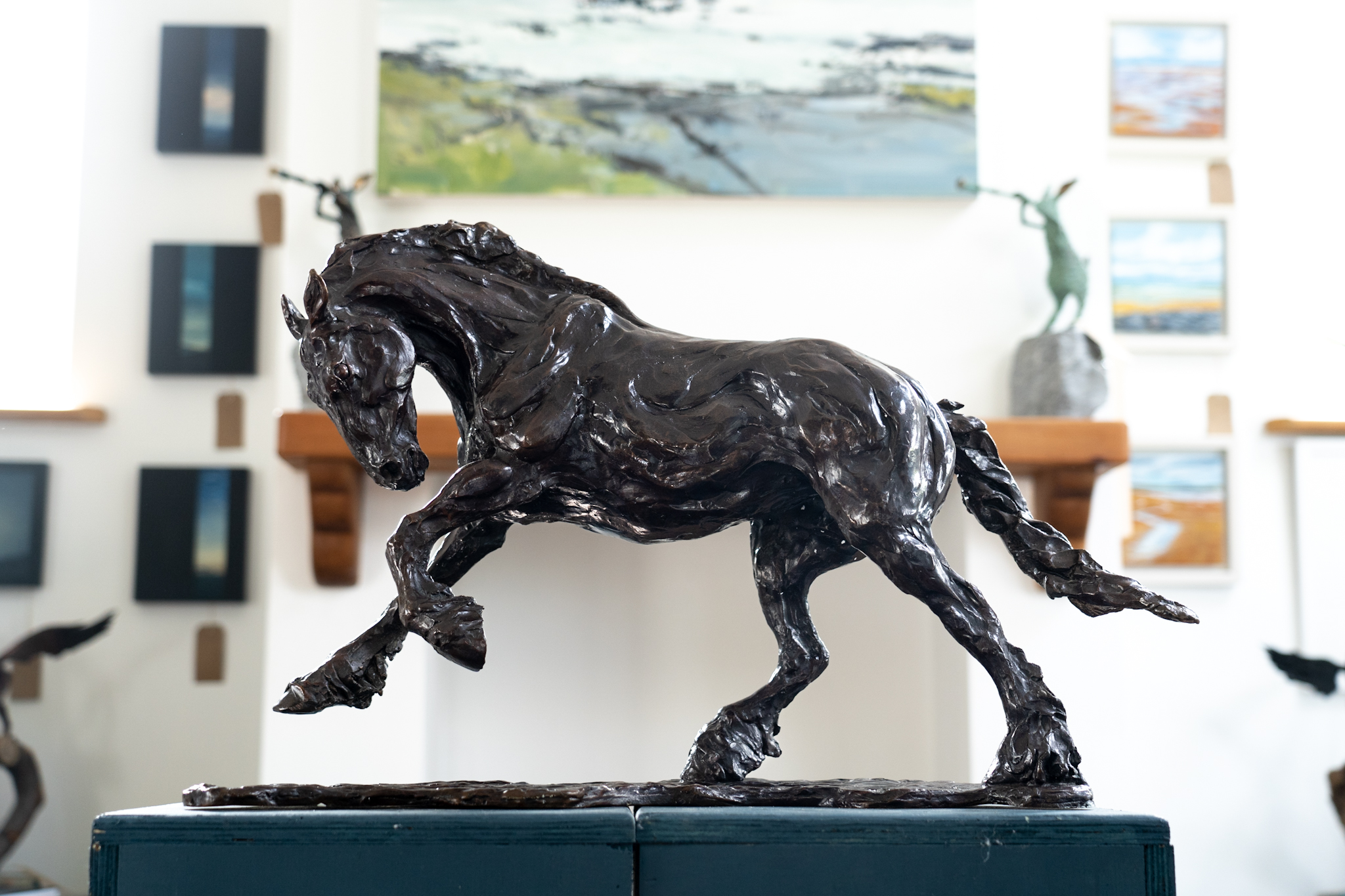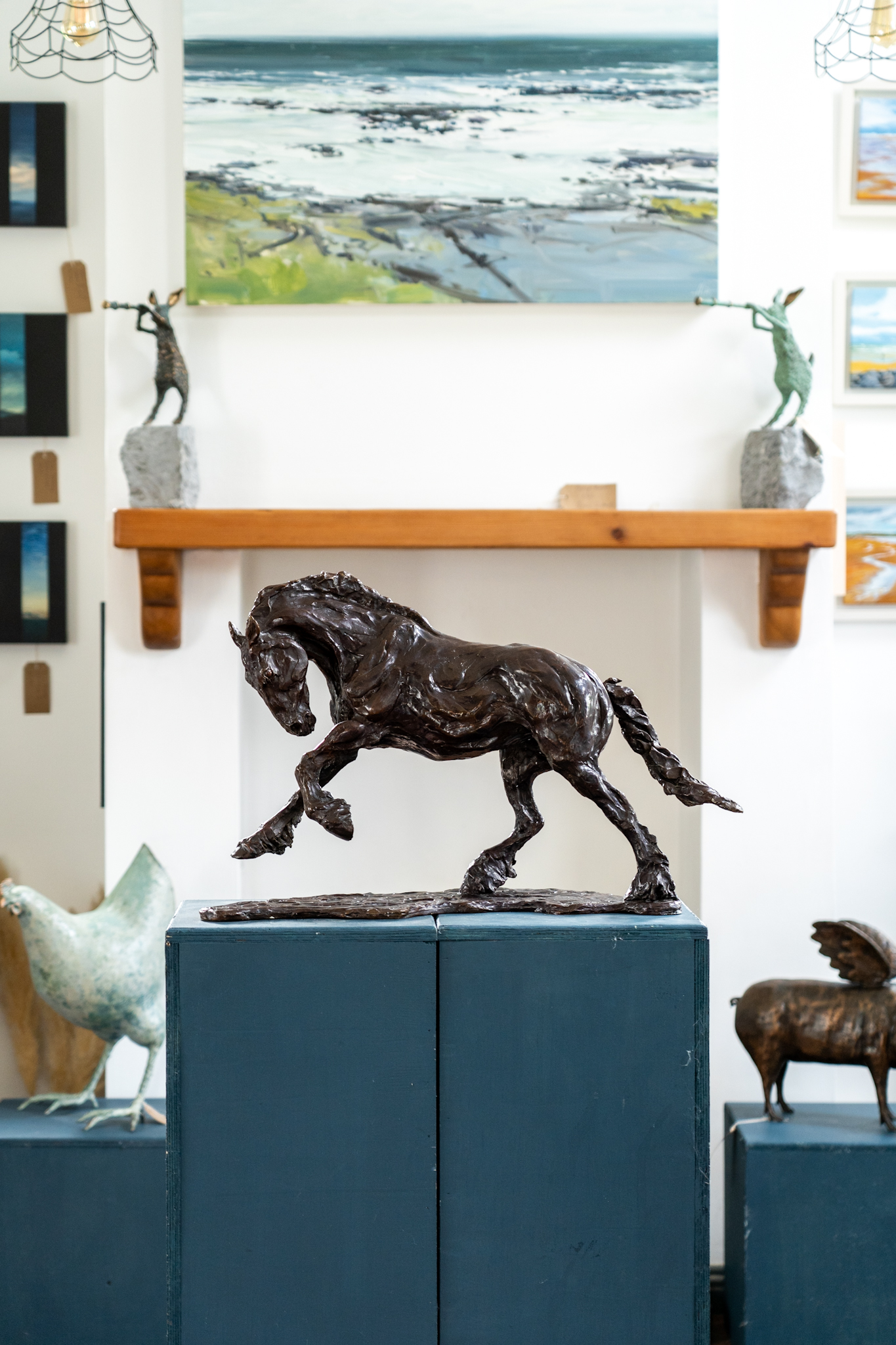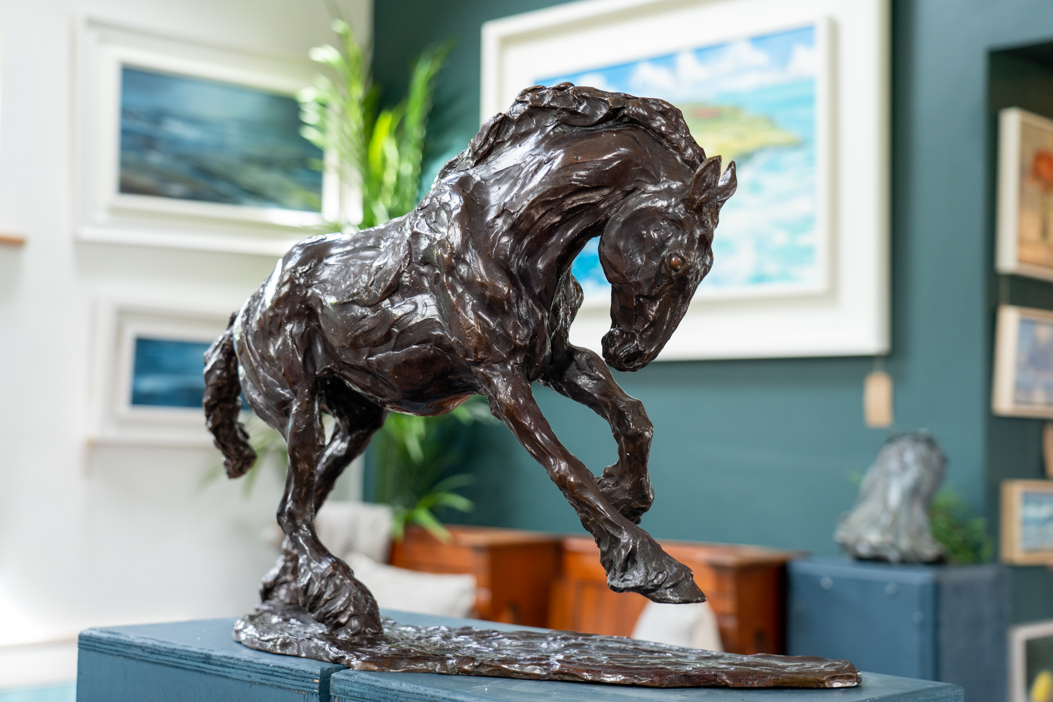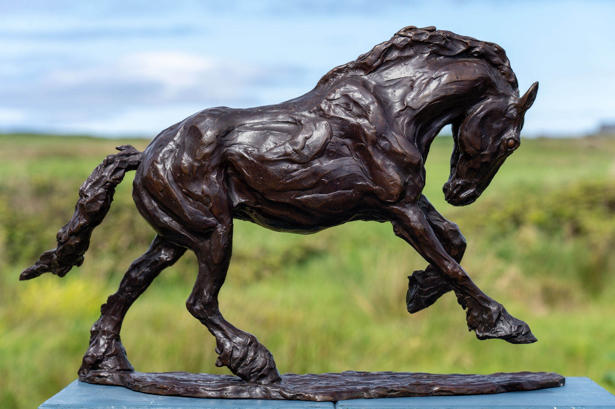 We are always incredibly excited to have work by renowned sculptor, Siobhan Bulfin, in the gallery. Siobhan is the lady responsible for some of the most beautiful and probably the most notably important life-size and larger than life-size horse sculptures in Ireland and abroad, over the years. Here, she has provided us with a beautifully sculpted, proportioned and cast bronze statue of a ‘Galloping Workhorse’. . Like all her pieces, this piece embodies incredible movement and anatomical perfection. Although a substantial piece, at approx 27″ from from tip to tail, and at a height of approx 17″ to the highest point, it is accessible in size and this piece would be a stand out in any art collection – domestic, commercial or corporate. Cast in Lauragaise, France, the piece is part of an edition on 9 sculptures. This piece is number 5.