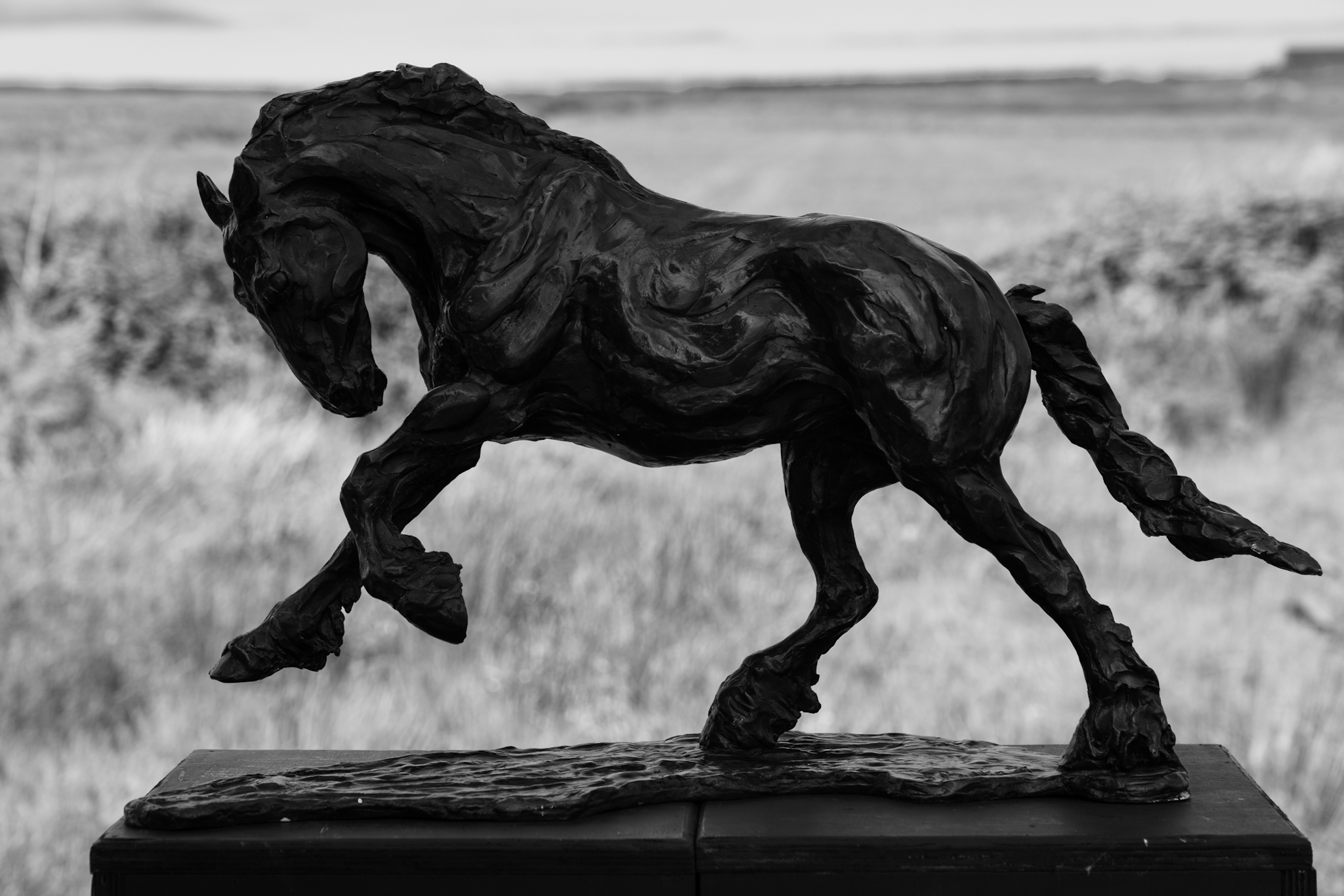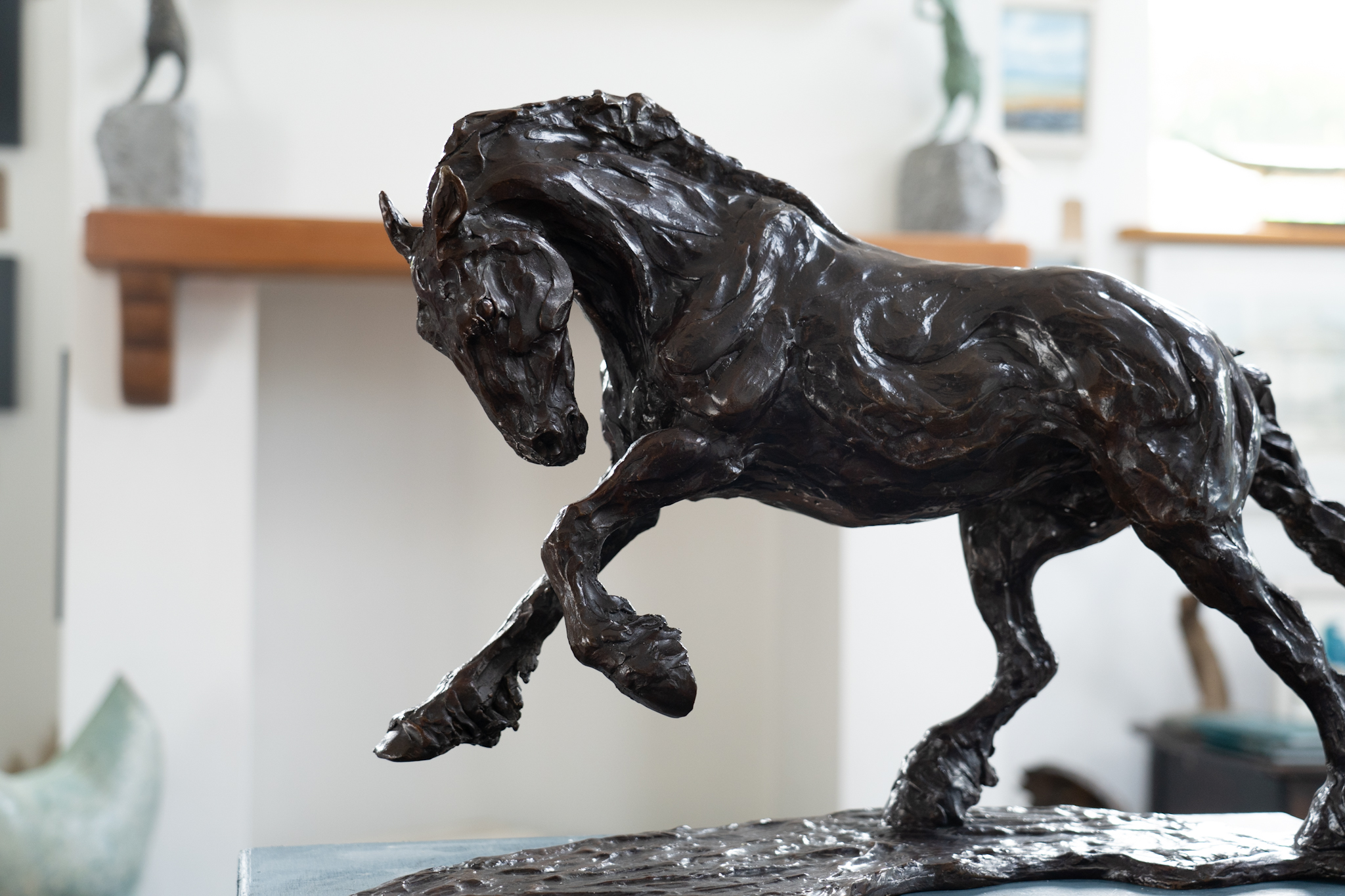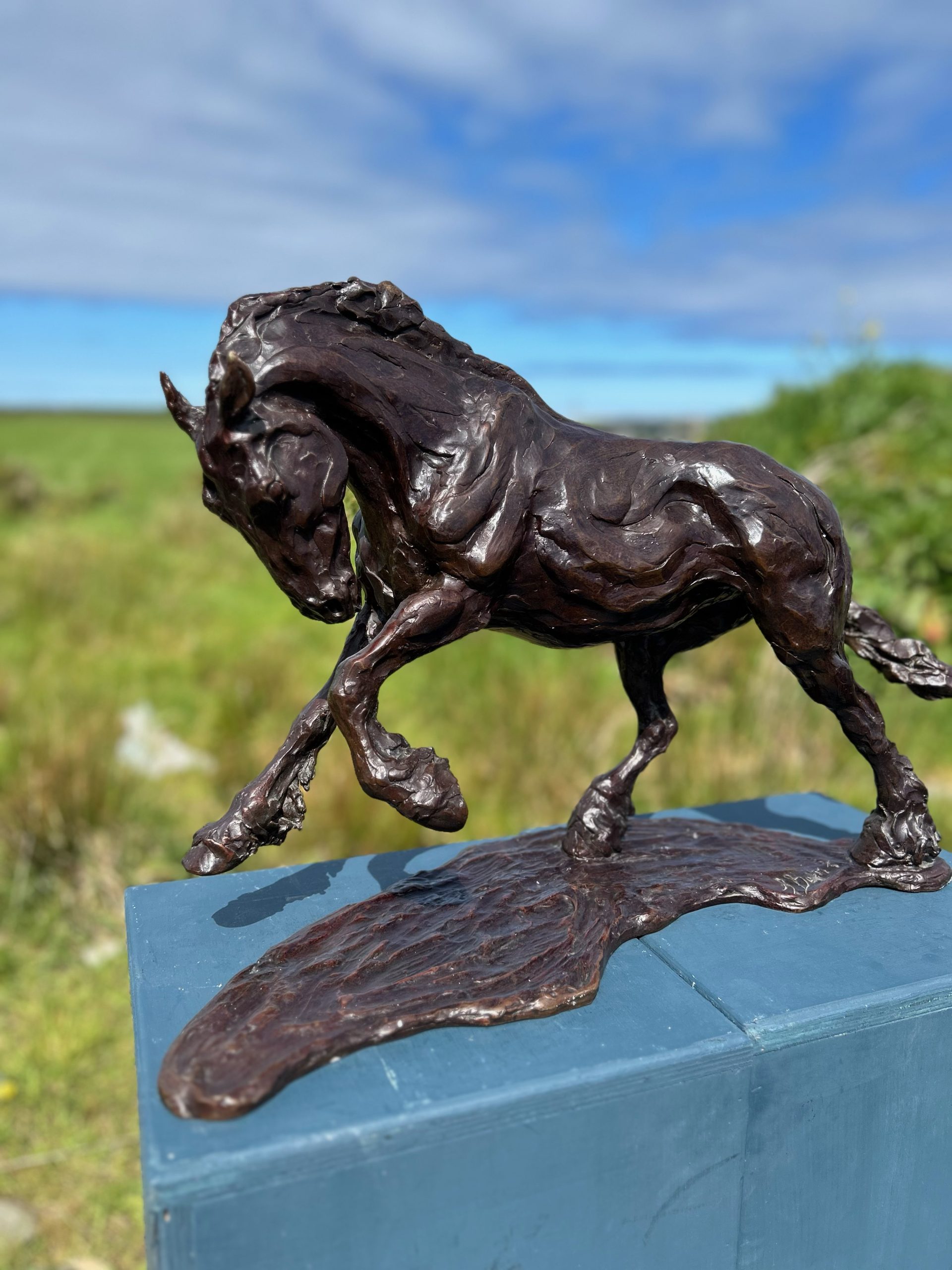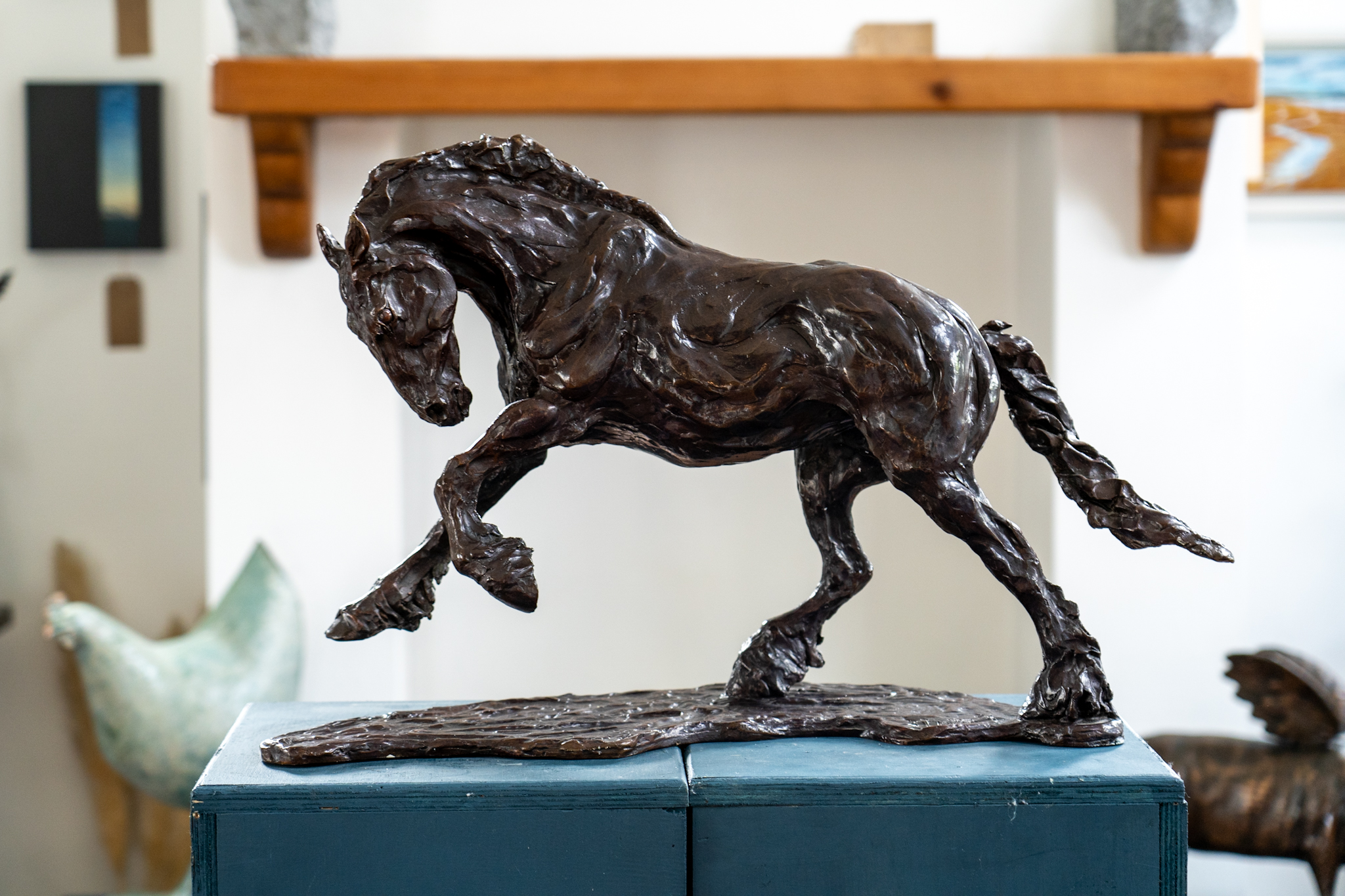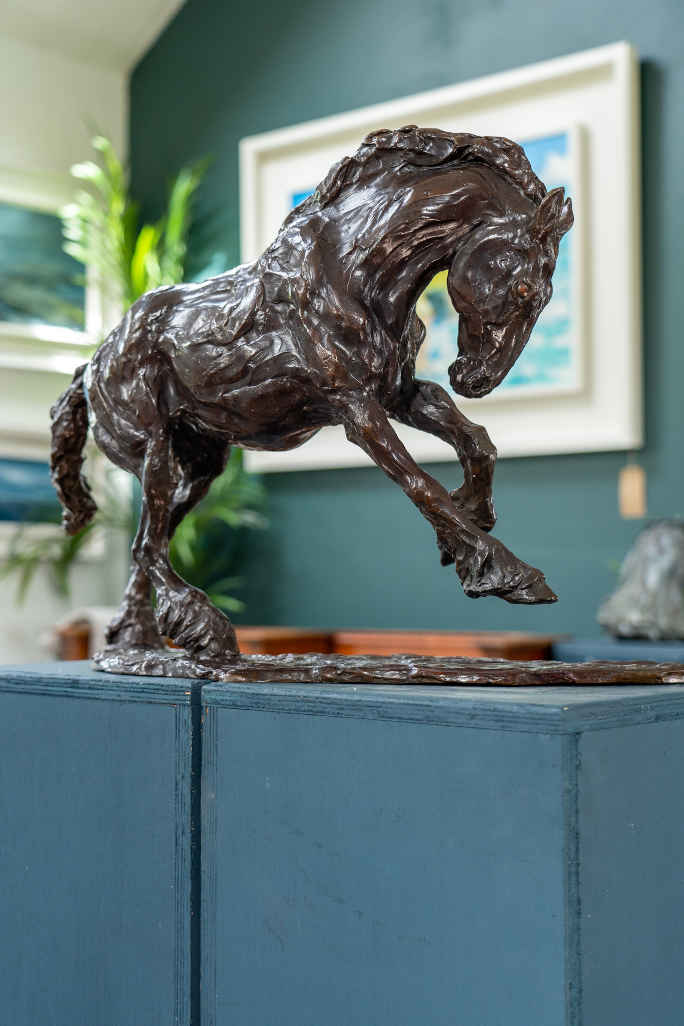 We are always incredibly excited to have work by renowned sculptor, Siobhan Bulfin, in the gallery. Siobhan is the lady responsible for some of the most beautiful and probably the most notably important life-size and larger than life-size horse sculptures in Ireland and abroad, over the years. Here, she has provided us with a beautifully sculpted, proportioned and cast bronze statue of a ‘Galloping Workhorse’. . Like all her pieces, this piece embodies incredible movement and anatomical perfection. Although a substantial piece, at approx 27″ from from tip to tail, and at a height of approx 17″ to the highest point, it is accessible in size and this piece would be a stand out in any art collection – domestic, commercial or corporate. Cast in Lauragaise, France, the piece is part of an edition on 9 sculptures. This piece is number 5.