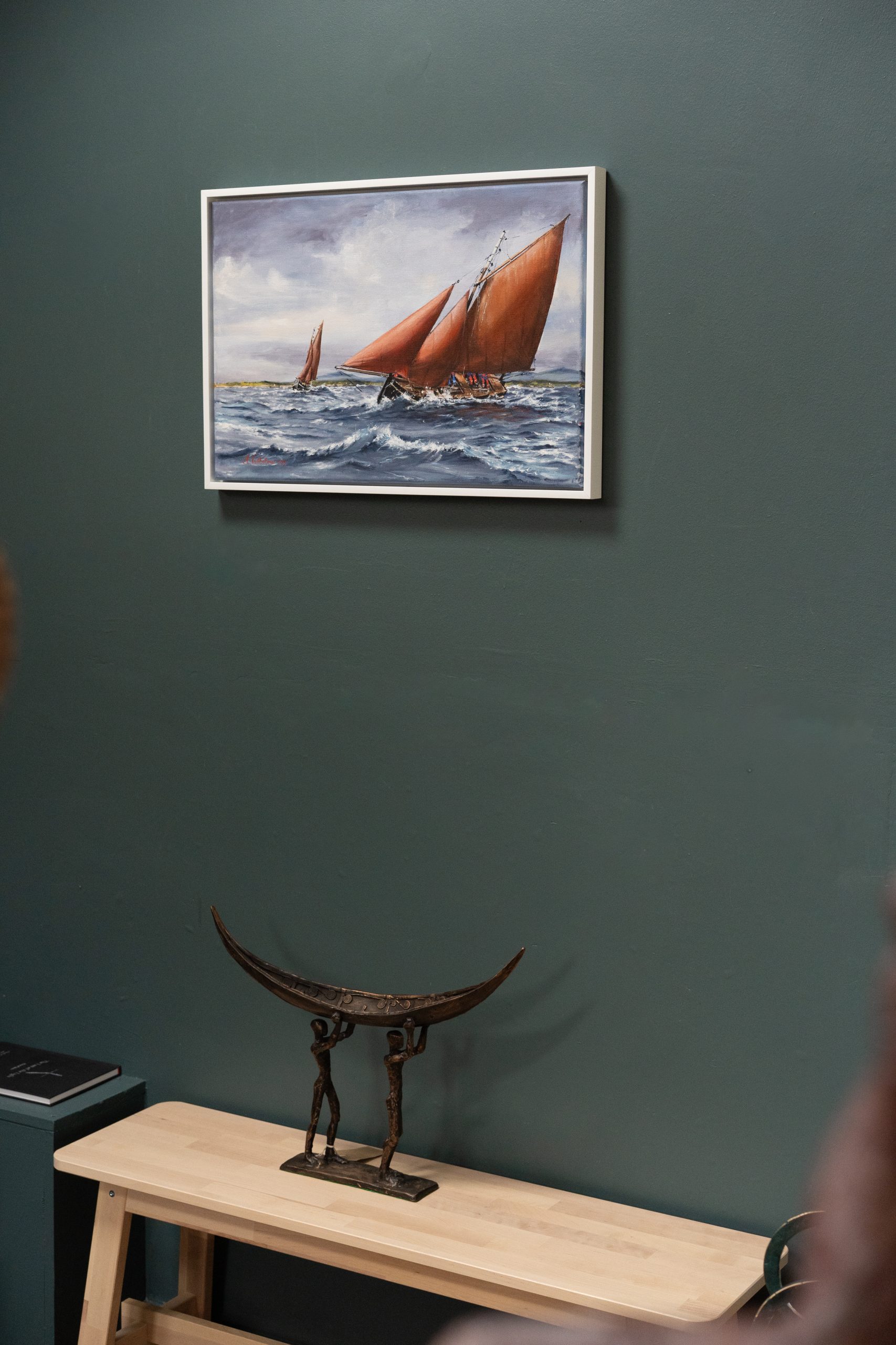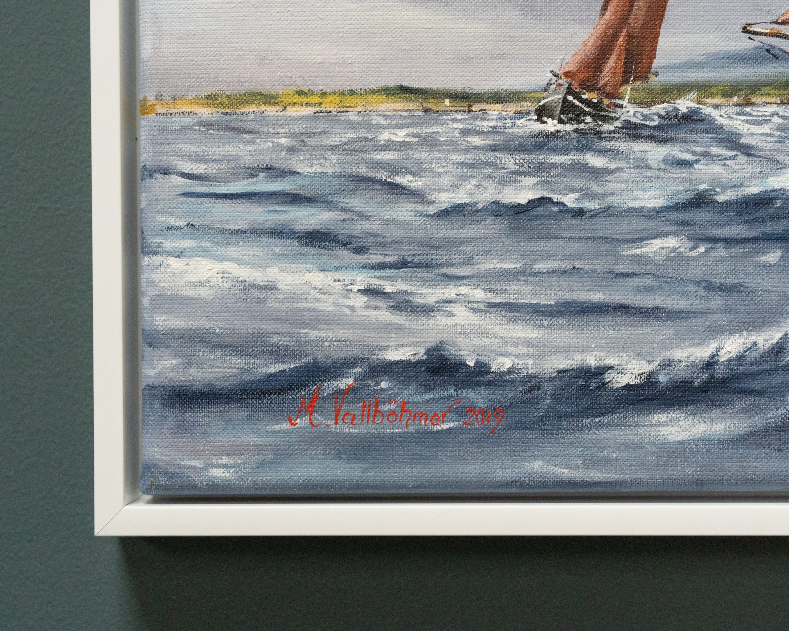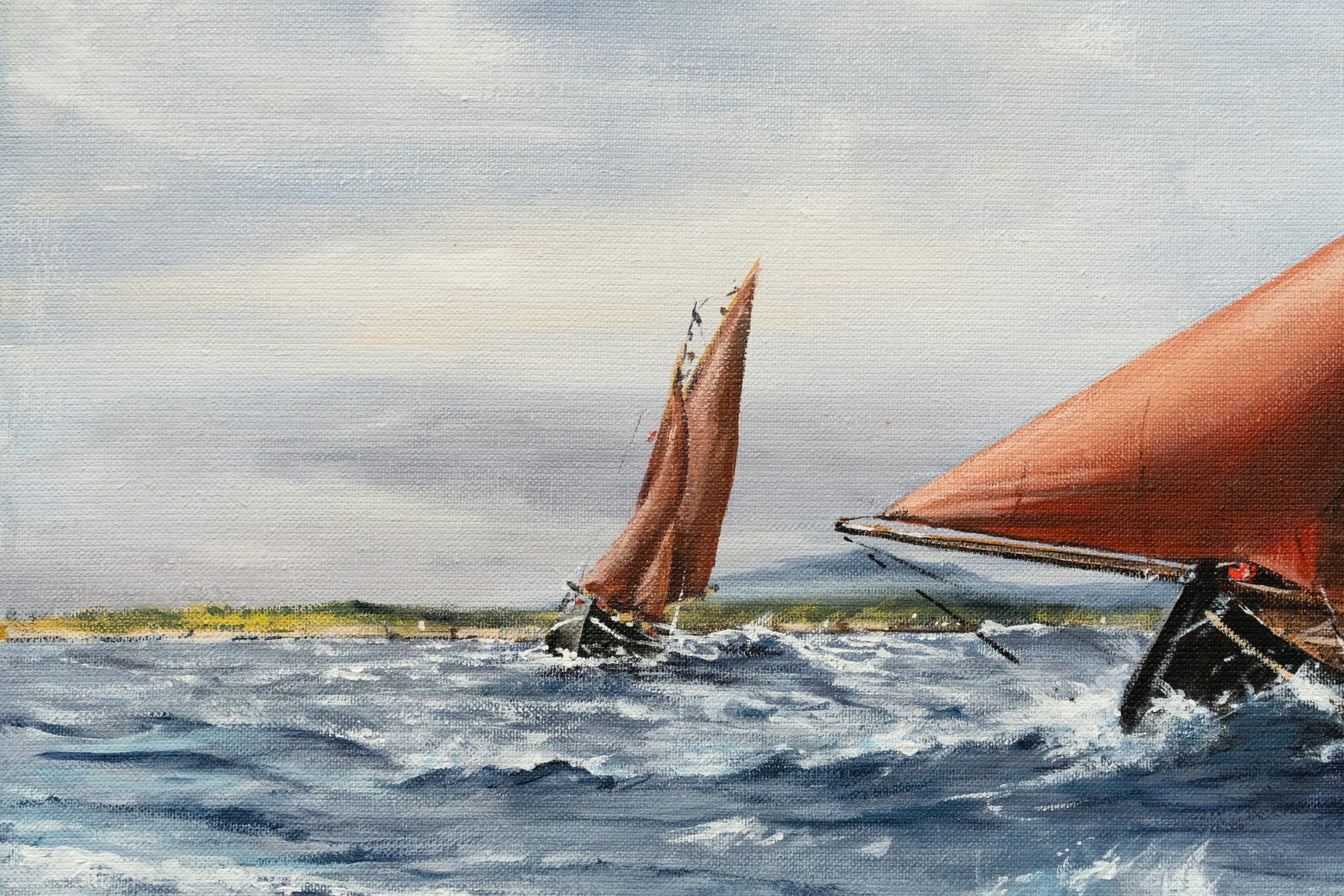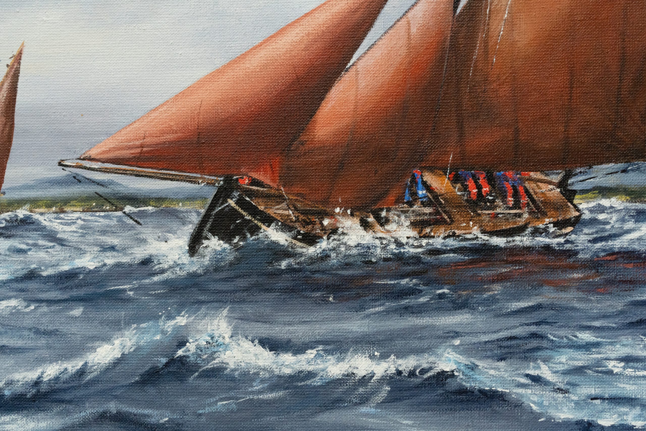 Stunning drama and movement in this painting (acrylics on canvas) of a Galway Hooker, on a choppy West of Ireland sea – by contemporary artist Marcus Vallboehmer.