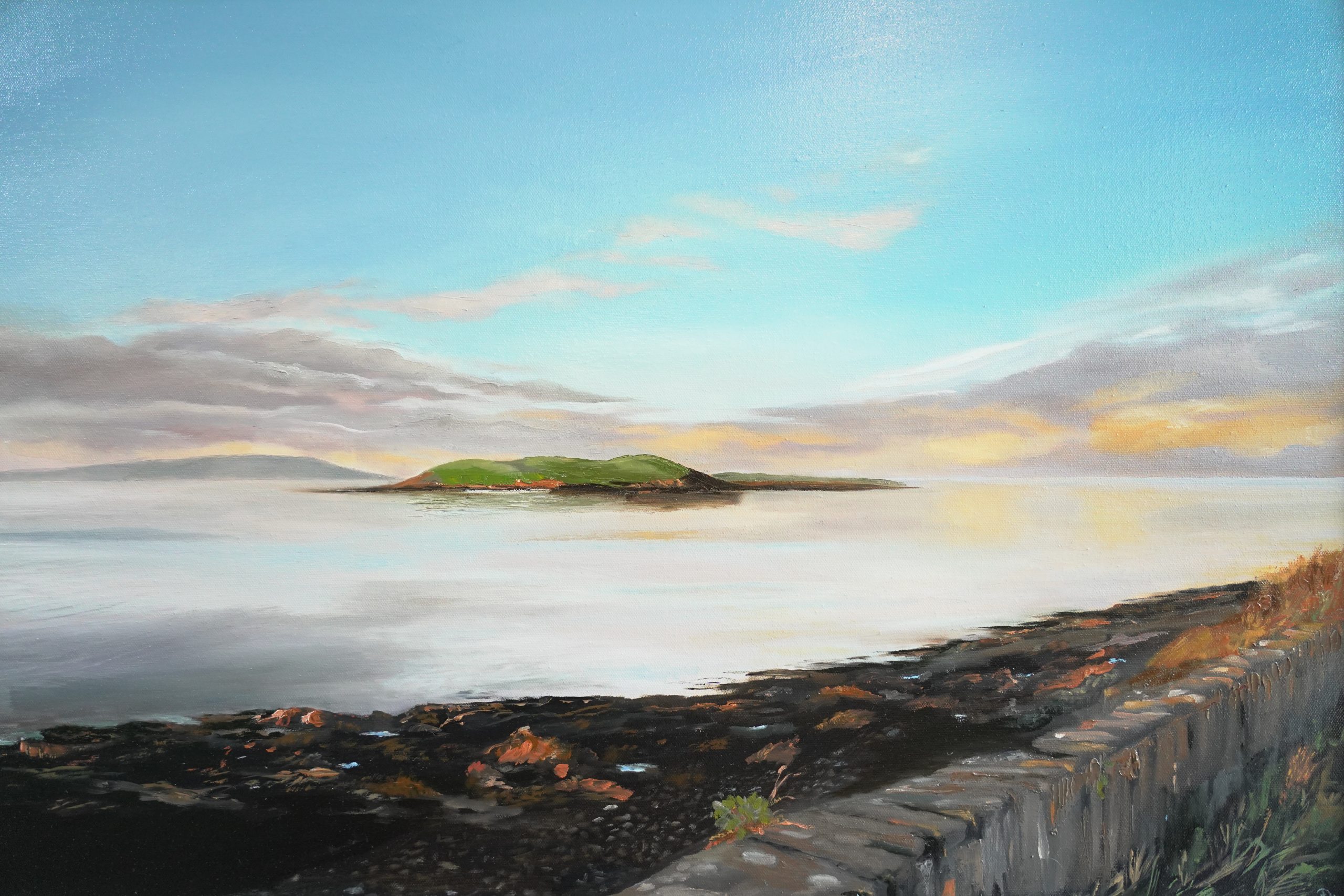The famous Hog Island, an un-inhabited island in the water off Cappa, visible in the distance of this painting, has been beautifully captured in oils by the artist. The stillness of the sea, at the mouth of the River Shannon, on this particular evening, is so evident, warm and inviting.