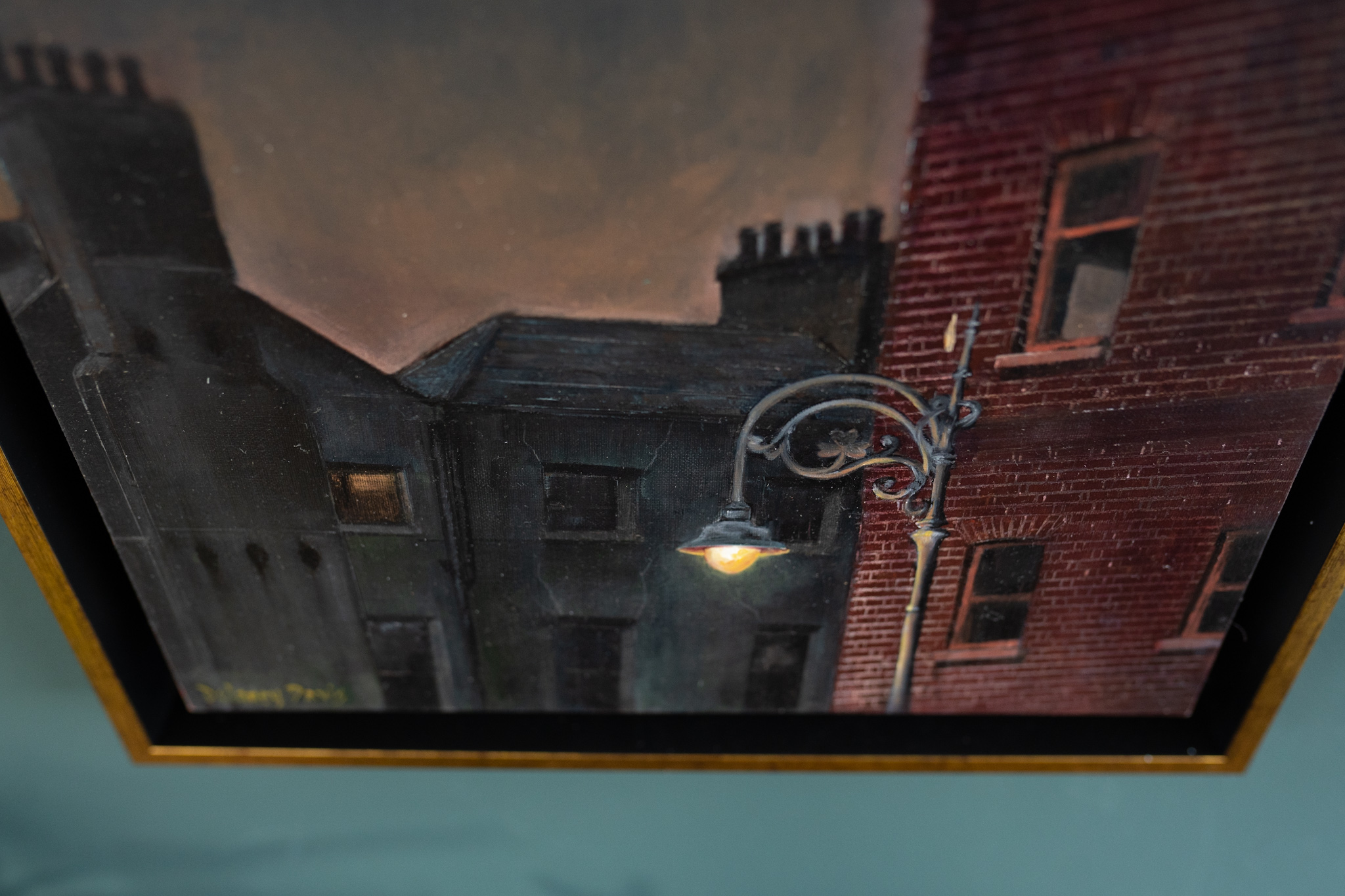 We are so excited to introduce the work of Delaney Davis to the gallery. This gorgeous oil painting is of a well-known Dublin feature, the tall lampposts found at the front of the Holles Street Hospital by night – indeed a sight that would have been very meaningful, for many a parent over the years.