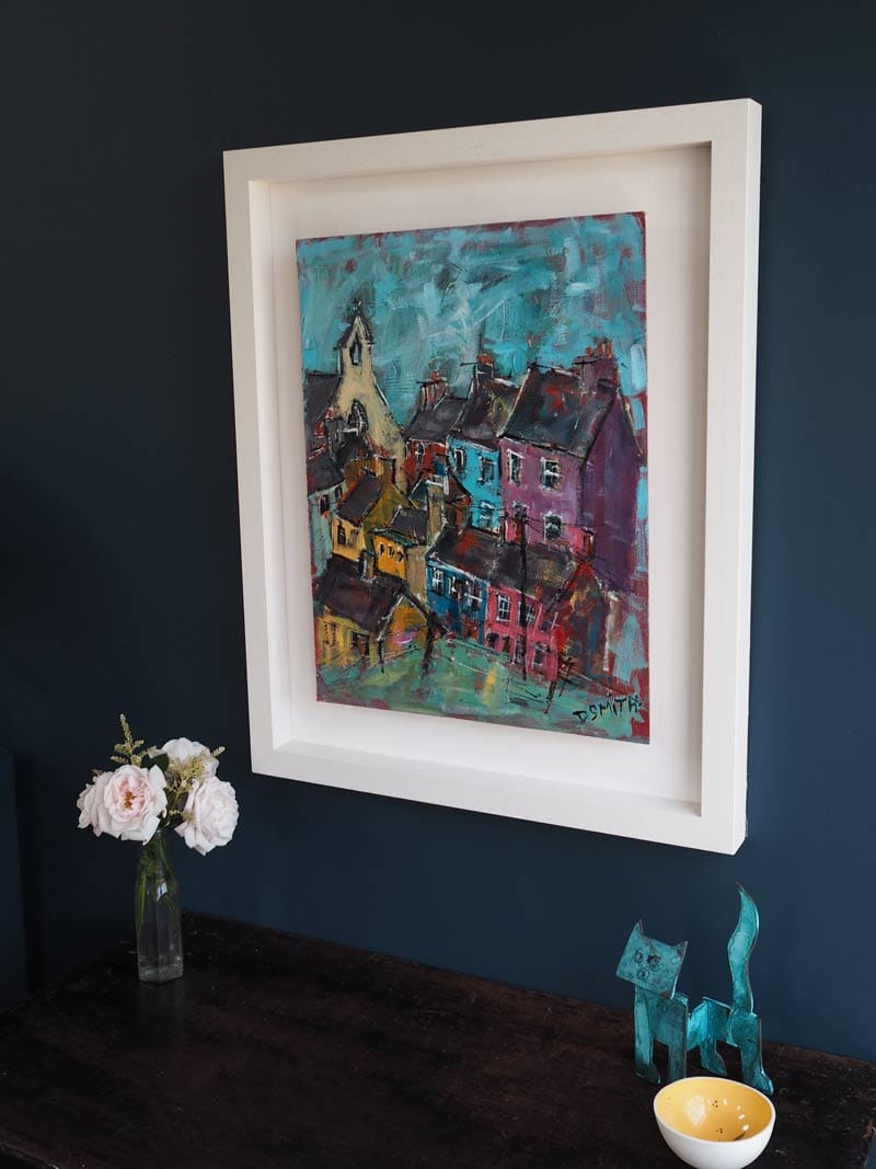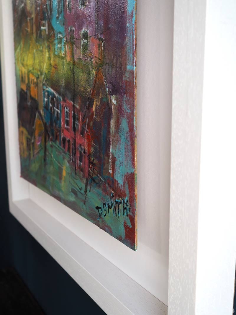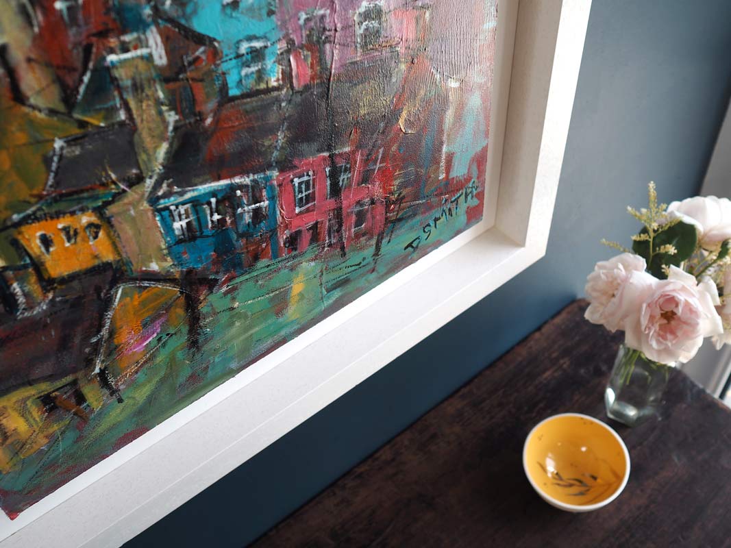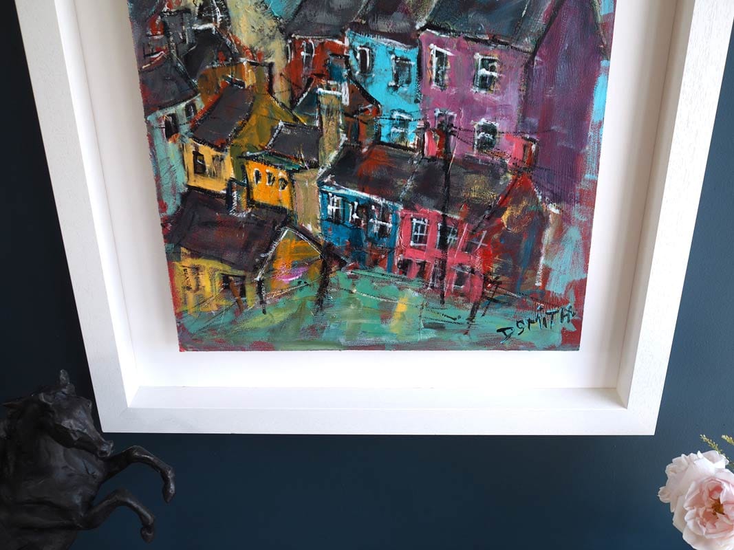Danny V Smith – Irish contemporary art – acrylic on board – village life – striking colour palette – Framed – Very Collectable Work –