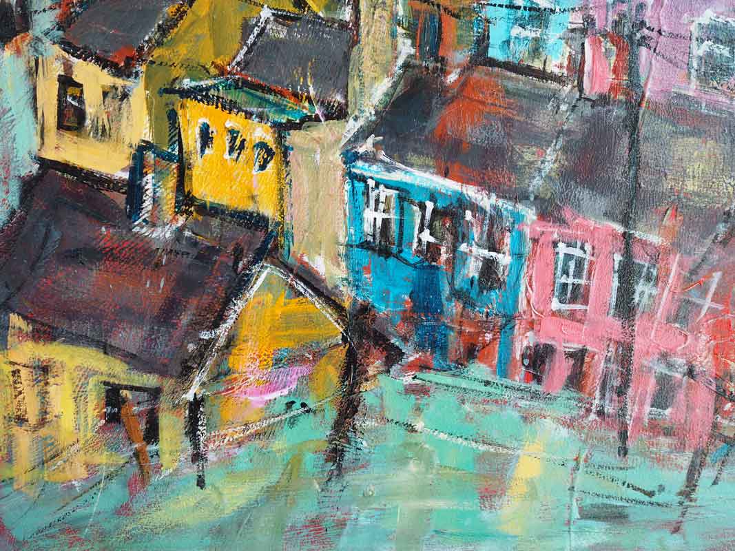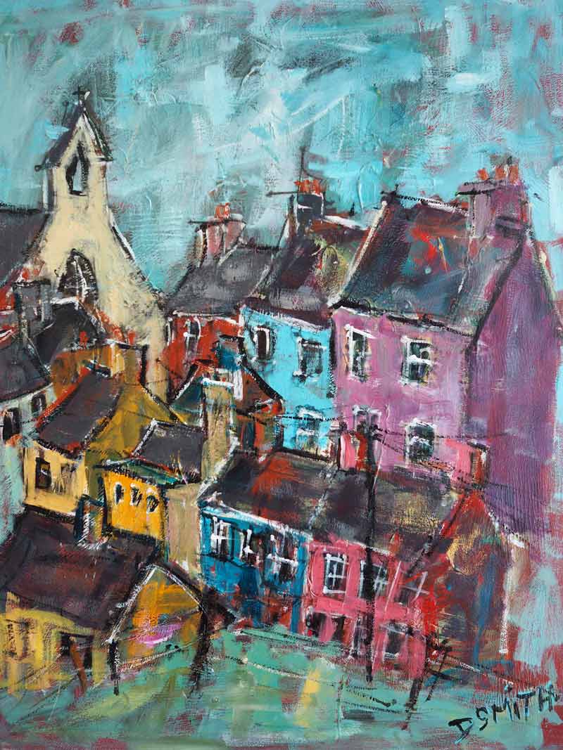 One of the cutest and quirkiest village depictions ever! Danny V. Smith is just a breath of fresh air in the gallery. Every one of his pieces embodies freedom and fun and joie de vivre. This colourful village is no different and would look amazing on any contemporary wall space. A perfect example of a Danny V Smith and instantly recognisable as his work. Very collectable piece.