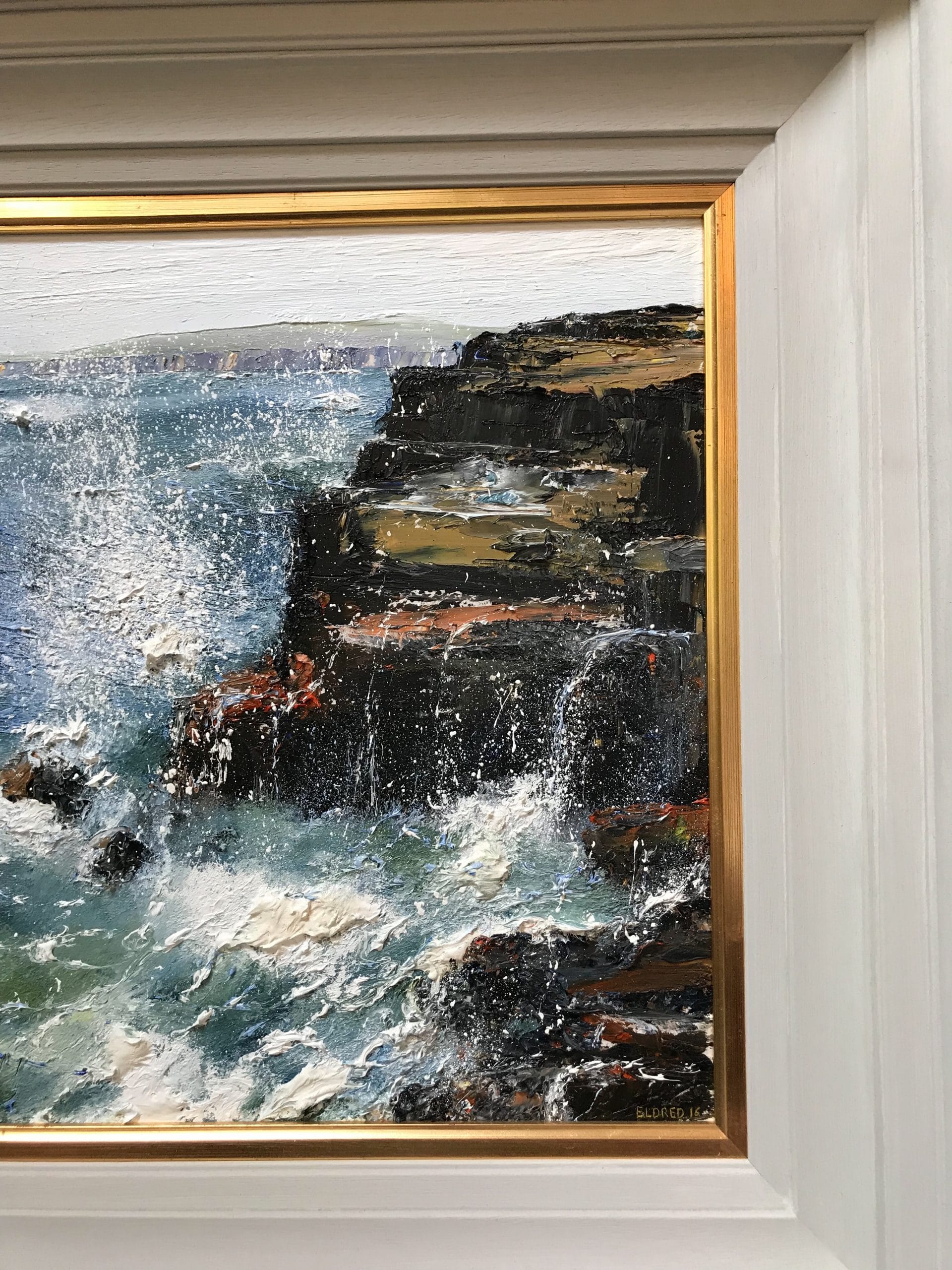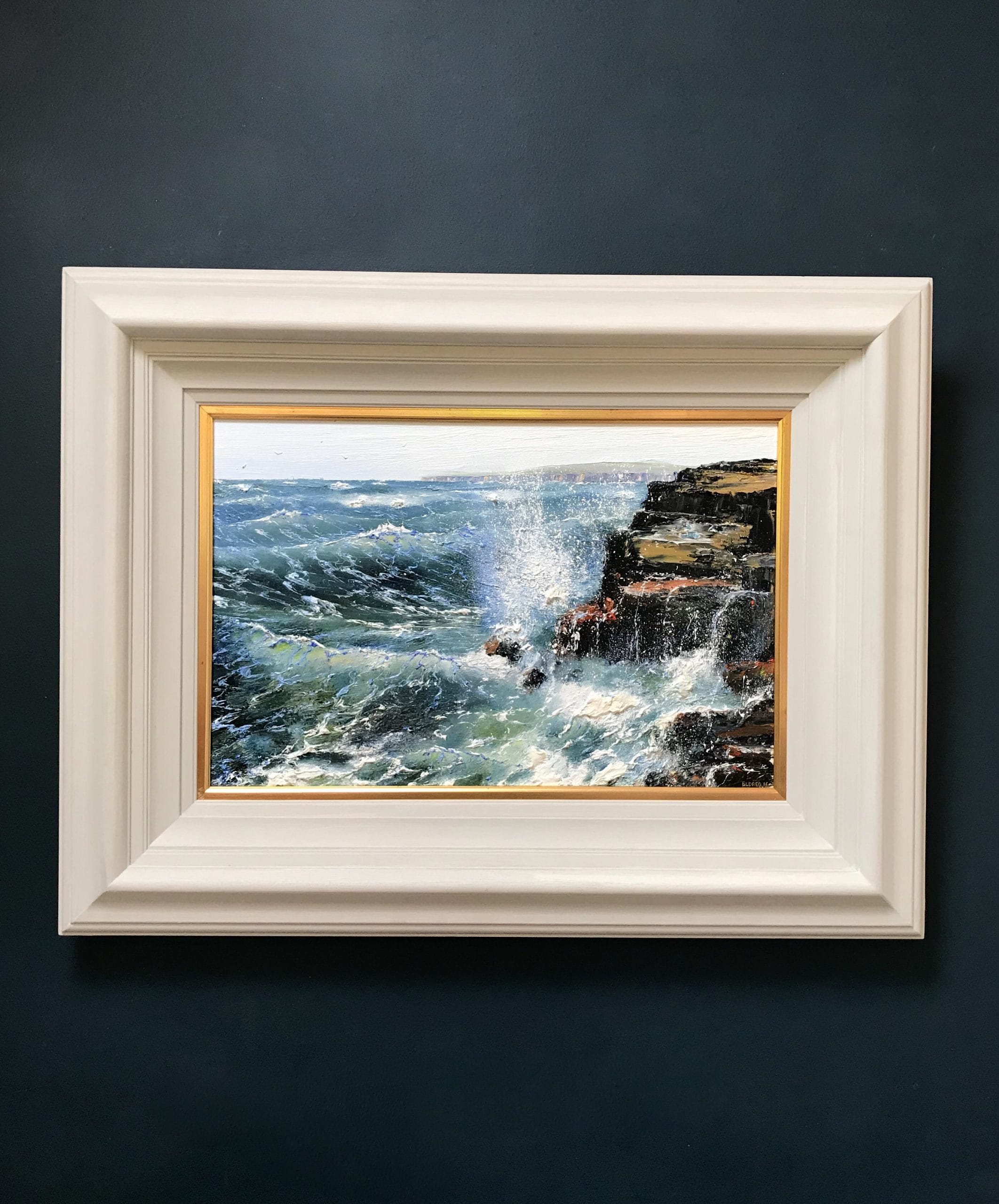 An incredible depiction in oils of waves crashing dramatically off the cliffs at Inis Mór, one of the Aran Islands, found at the mouth of Galway Bay, off the West Coast of Ireland. Mark’s heavy use of oils allows for a textured, almost 3-dimensional element to the painting, while his incredible talent as an artist allows you to truly imagine that heavy swell of the tide coming towards you, so much so you can almost feel the sea spray on your skin. Mark manages to make you feel that perhaps you are watching this spectacular collision of waves and rock happen for real in front of you.