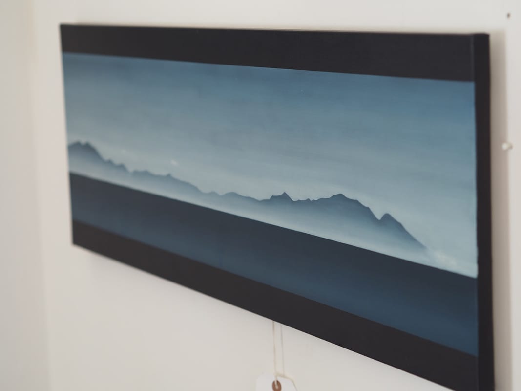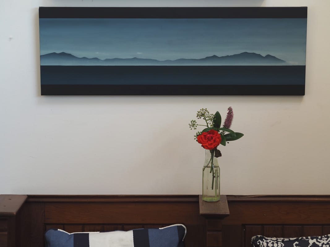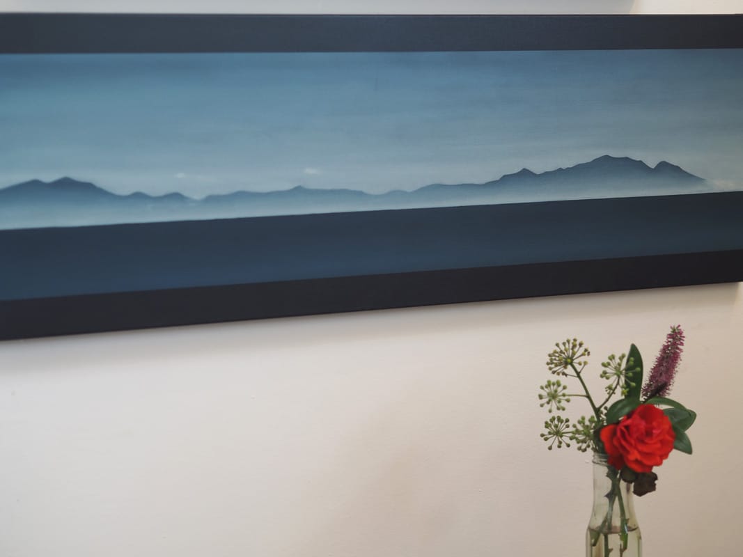 Adam Pomeroy is a figurative artist. His work includes still-life, landscape, portrait, figure painting and sculpture. This striking depiction of the Kerry Mountains as seen from here on the Loop Head Peninsula, on a dark and misty morning, would stand out on any wall – so beautifully and finely painted that you feel you are looking through a window. A landscape shaped piece – this painting is unframed in normal terms but yet somehow feels framed by Adam’s now almost signature panels of darkness. A truly lovely purchase.