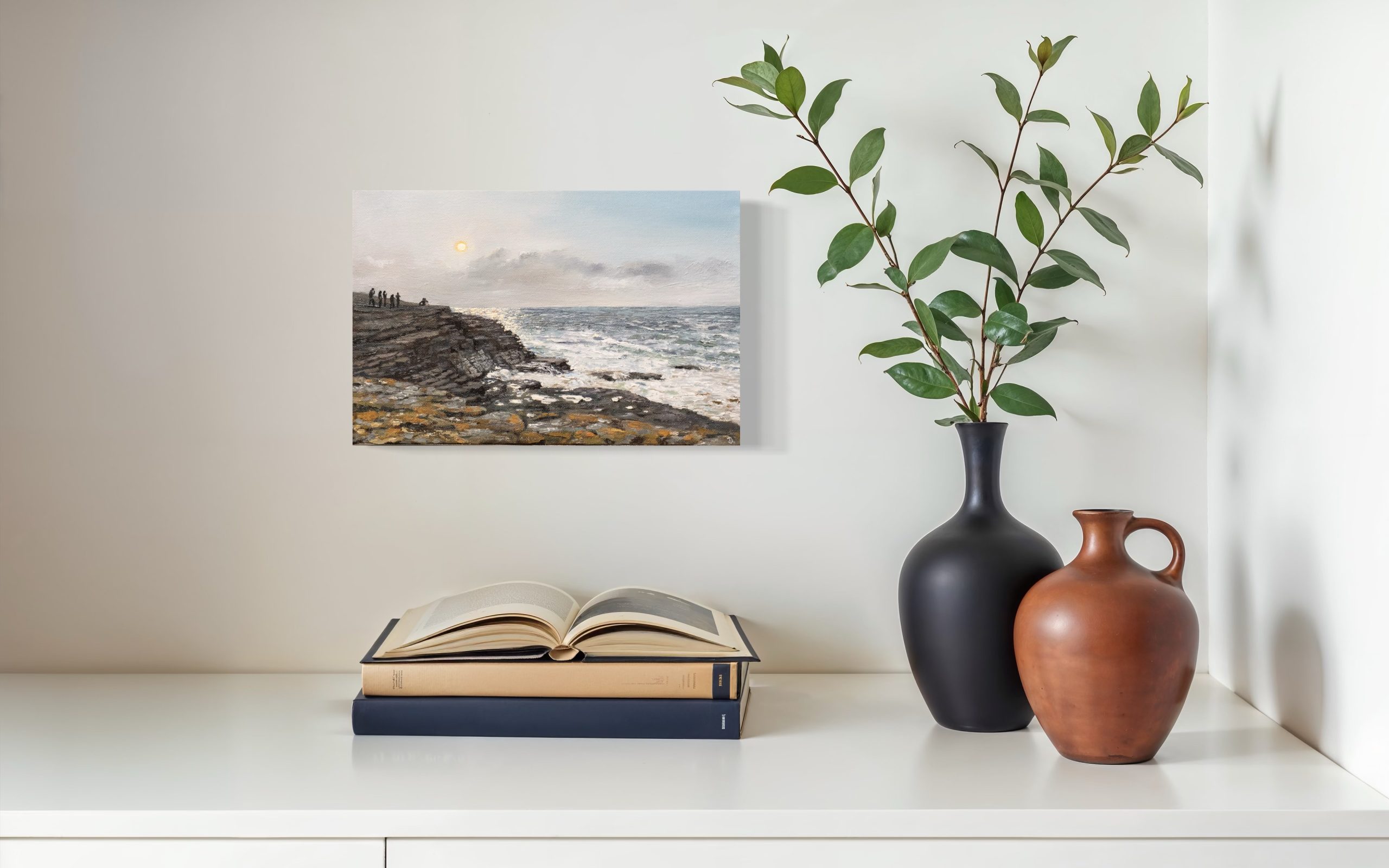 We adore this beautiful, small, original oil painting by the artist ‘D’ – this time, of the view looking back from the Pollock Holes, at the seaside town of Kilkee, Co. Clare.