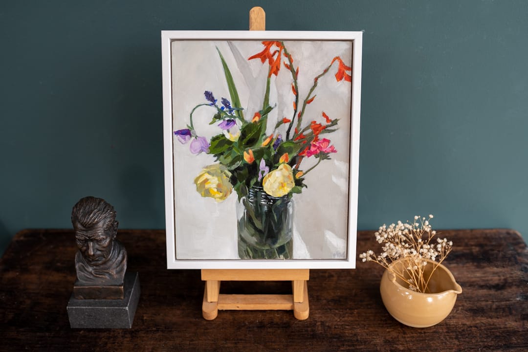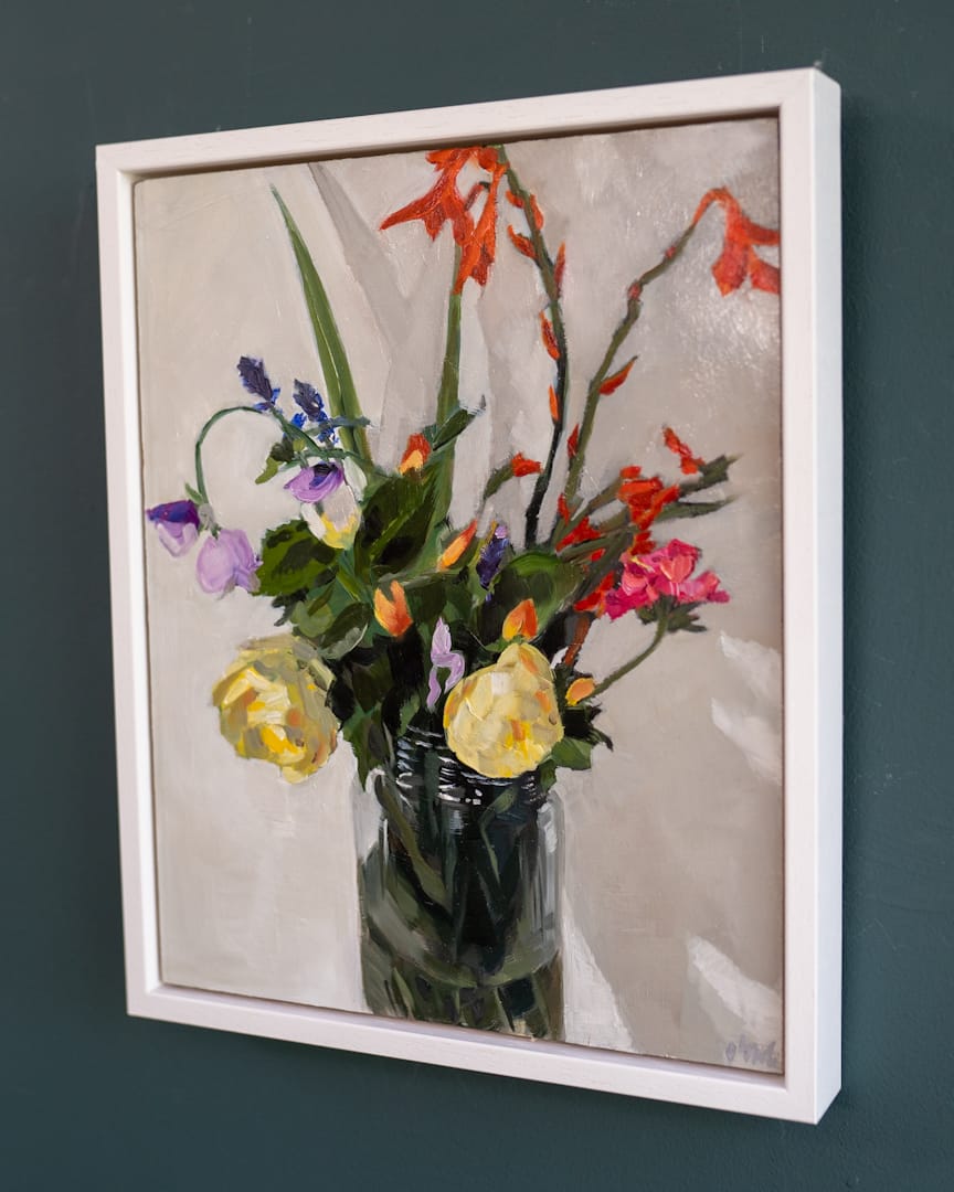 A strikingly beautiful original oil painting by the Dublin artist Oonagh O’ Toole. That late bouquet; the gathering of the last few wildflowers before they die off completely.