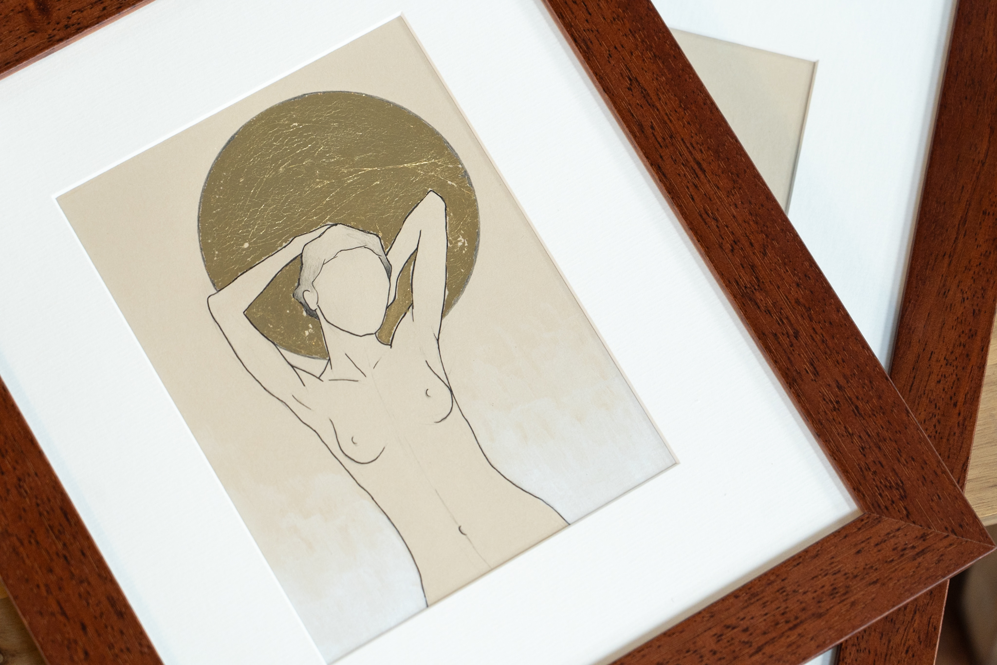 Discerning art buyers, and collectors will be as excited as we were, to see these original drawings by sought after contemporary artist, Adam Pomeroy.  Adam has now produced the latest selection in a gorgeous series of  life-studies, with each study depicting a female form in various poses on paper, this time with the added extra glamorous touch of gold leaf and acrylic ink.